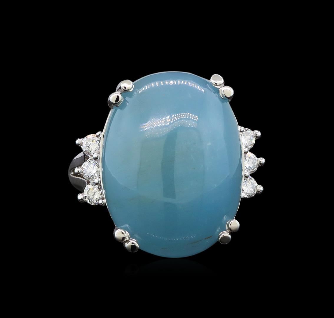 One electronically tested 14KT white gold ladies cast aquamarine and diamond ring with a bright polish finish. Identified with markings of "14K". Condition is new. Containing: One prong set oval cabochon cut natural aquamarine, measuring 22.20 x 16.70 x 10.86mm, approximate weight of 7.60ct., clarity is severely included, type I, medium light, very slightly grayish, blue color, (GIA B 4/3), cut is good. Six prong set round brilliant cut diamonds, measuring 2.50 - 2.50 x 1.50mm (depth est.) approximate total weight of 6 Stones = 0.45ct. Clarity: SI-1 to SI-2. Color: I - J, Cut is Good. Colored gemstones are presumed to have been subjected to commonly used enhancement processes. All diamonds and colored gemstones are graded in the mounting, unless otherwise stated. Total Weight of Colored Stones 7.60ct. Total Weight of Diamonds 0.45ct. Total Weight of Ring 14.90 grams. GGL Appraised.