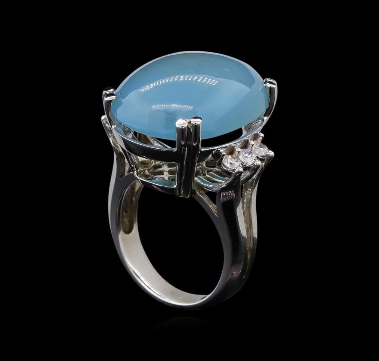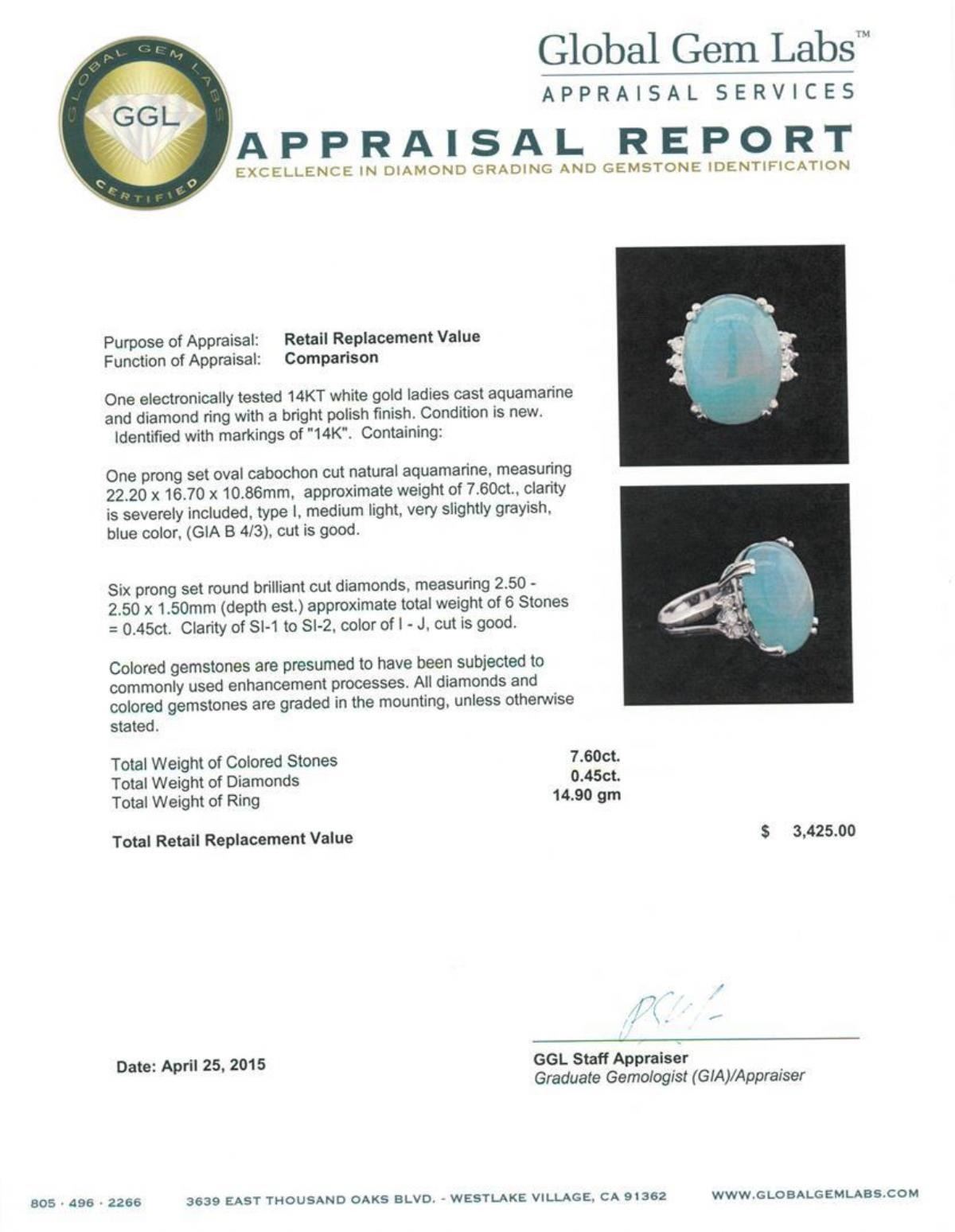 One electronically tested 14KT white gold ladies cast aquamarine and diamond ring with a bright polish finish. Identified with markings of "14K". Condition is new. Containing: One prong set oval cabochon cut natural aquamarine, measuring 22.20 x 16.70 x 10.86mm, approximate weight of 7.60ct., clarity is severely included, type I, medium light, very slightly grayish, blue color, (GIA B 4/3), cut is good. Six prong set round brilliant cut diamonds, measuring 2.50 - 2.50 x 1.50mm (depth est.) approximate total weight of 6 Stones = 0.45ct. Clarity: SI-1 to SI-2. Color: I - J, Cut is Good. Colored gemstones are presumed to have been subjected to commonly used enhancement processes. All diamonds and colored gemstones are graded in the mounting, unless otherwise stated. Total Weight of Colored Stones 7.60ct. Total Weight of Diamonds 0.45ct. Total Weight of Ring 14.90 grams. GGL Appraised.