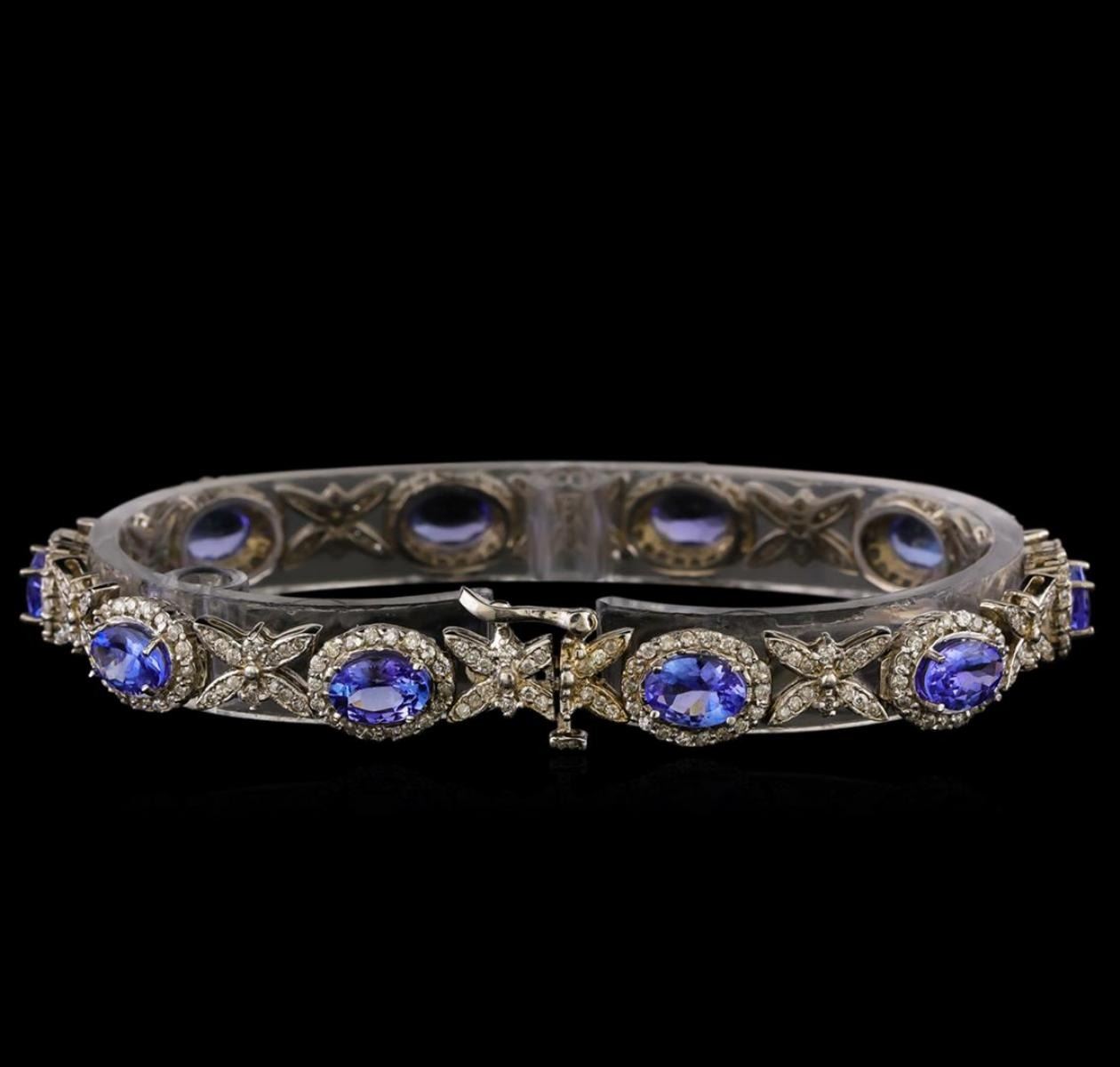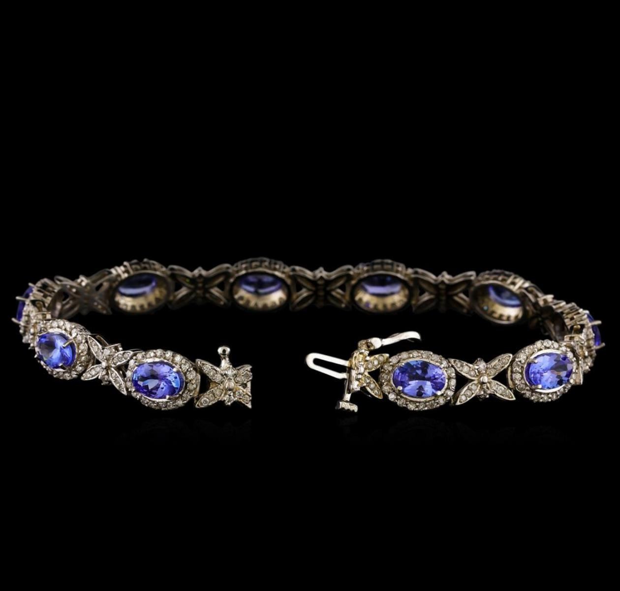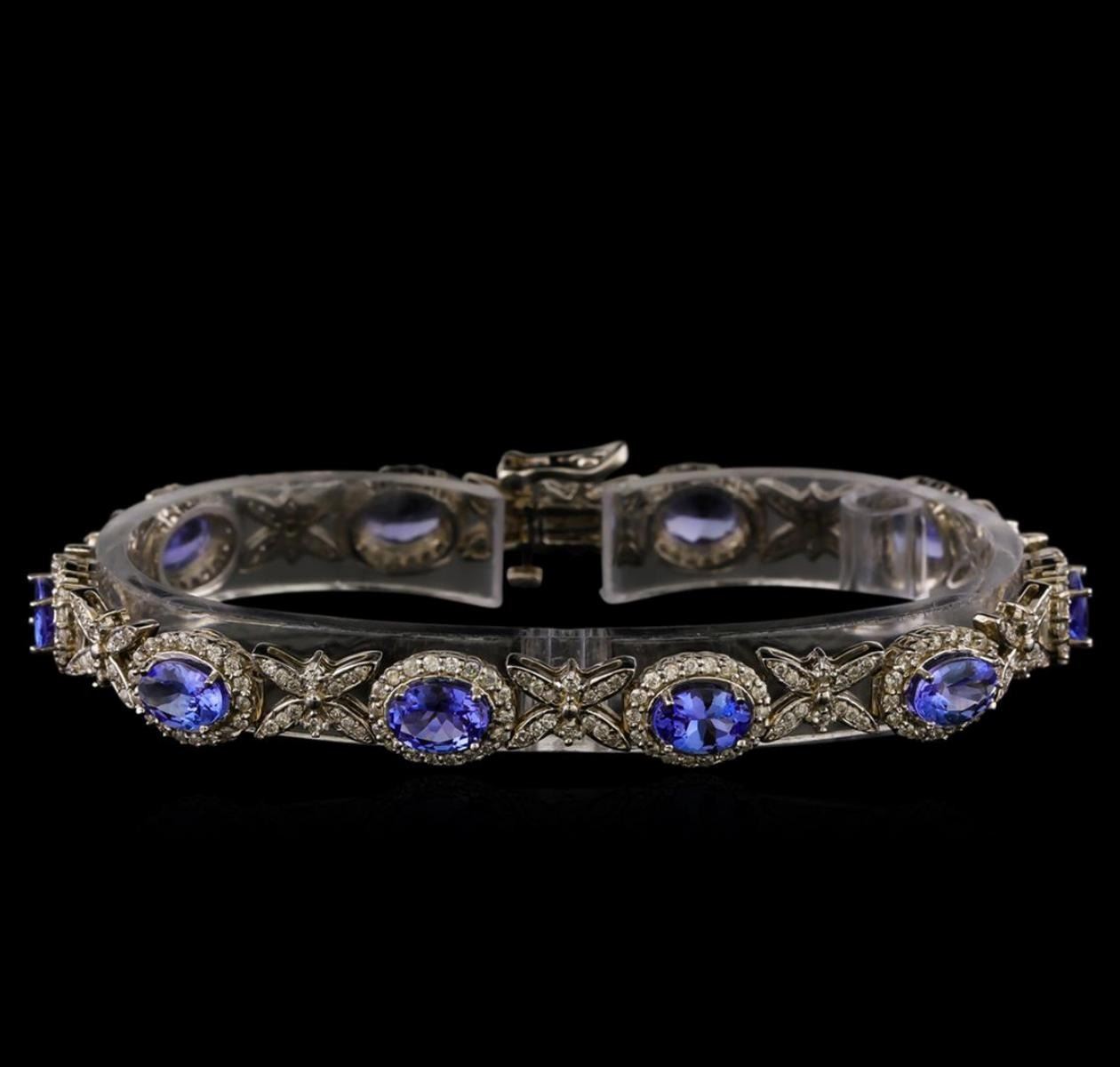 One electronically tested 14KT white gold ladies combination cast & assembled tanzanite and diamond bracelet with a bright polish finish. Measurements: 7.25" in length. Identified with markings of "14K". Condition is new. Containing: Ten prong set oval modified brilliant cut natural tanzanites, measuring 7.08 x 4.62 x 3.43mm, approximate total weight of 7.90ct., clarity is moderately included, type I, medium light, very slightly grayish, violet color, (GIA V 4/3), cut is good. Three Hundred Twenty-Four prong set round brilliant cut diamonds, measuring 1.10 - 1.10 x 0.66mm (depth est.) approximate total weight of 324 Stones = 1.56ct. Clarity: I-1 to I-2. Color: I - J, Cut is Good. Colored gemstones are presumed to have been subjected to commonly used enhancement processes. All diamonds and colored gemstones are graded in the mounting, unless otherwise stated. Total Weight of Colored Stones 7.90ct. Total Weight of Diamonds 1.56ct. Total Weight of Bracelet 17.40 grams. GGL Appraised at $9,680.00.