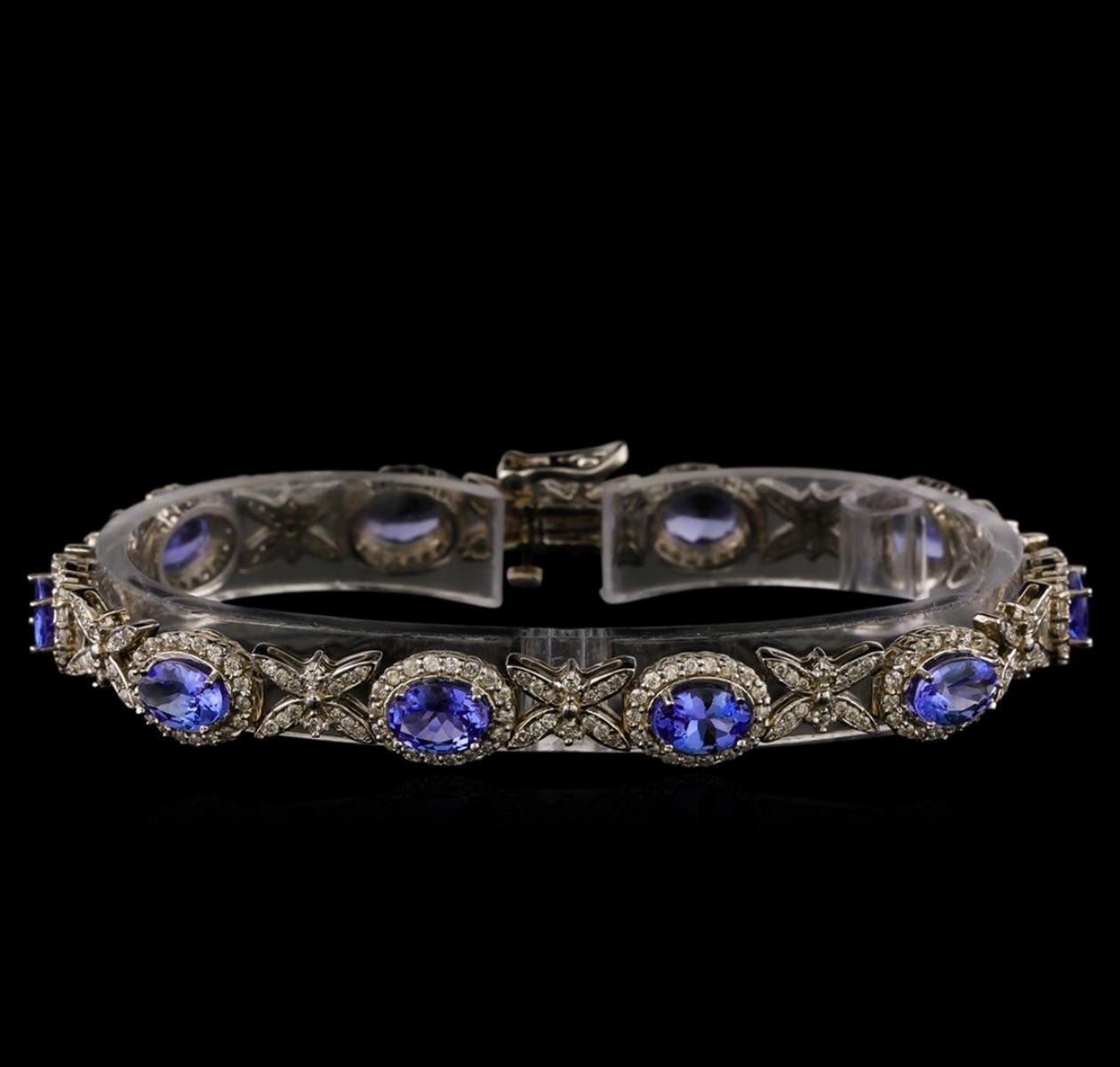 One electronically tested 14KT white gold ladies combination cast & assembled tanzanite and diamond bracelet with a bright polish finish. Measurements: 7.25" in length. Identified with markings of "14K". Condition is new. Containing: Ten prong set oval modified brilliant cut natural tanzanites, measuring 7.08 x 4.62 x 3.43mm, approximate total weight of 7.90 ct., clarity is moderately included, type I, medium light, very slightly grayish, violet color, (GIA V 4/3), cut is good. Three Hundred Twenty-Four prong set round brilliant cut diamonds, measuring 1.10 - 1.10 x 0.66mm (depth est.) approximate total weight of 324 Stones = 1.56ct. Clarity: I-1 to I-2. Color: I - J, Cut is Good. Colored gemstones are presumed to have been subjected to commonly used enhancement processes. All diamonds and colored gemstones are graded in the mounting, unless otherwise stated. Total Weight of Colored Stones 7.90 ct. Total Weight of Diamonds 1.56ct. Total Weight of Bracelet 17.40 grams. GGL Appraised.