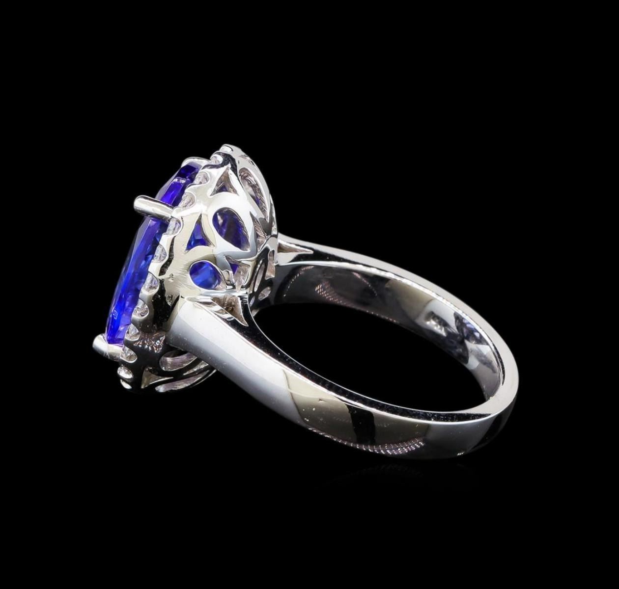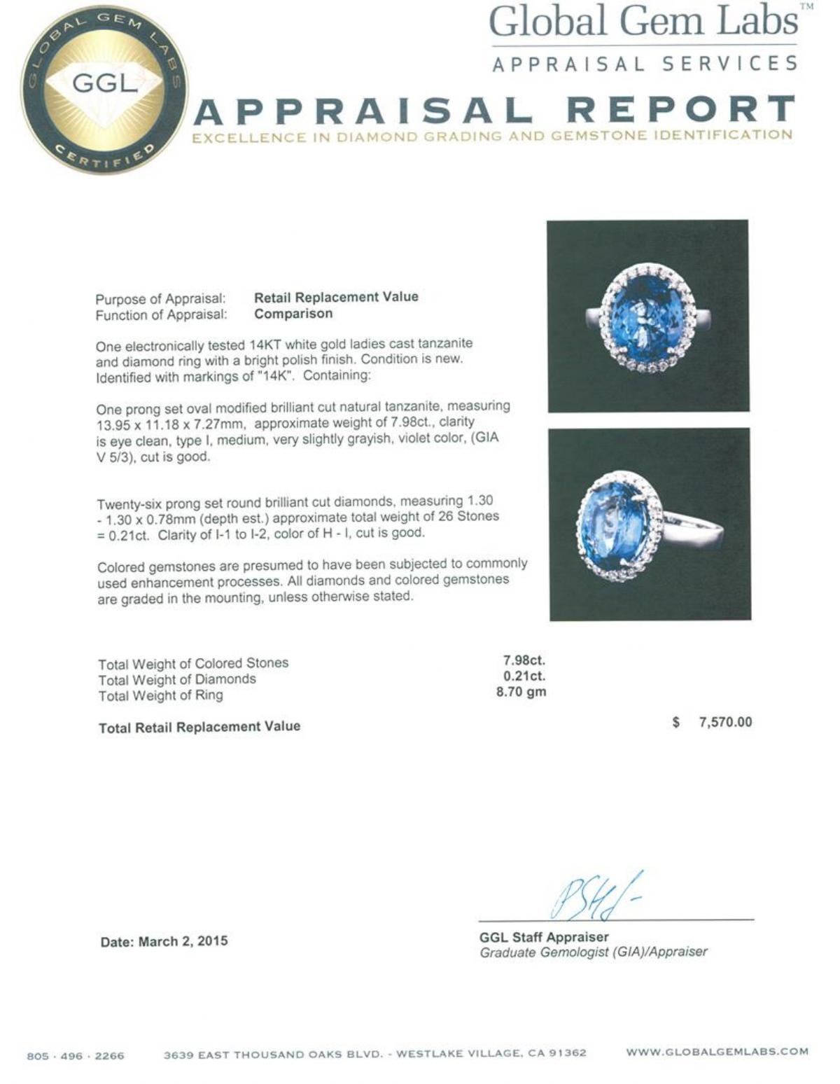 One electronically tested 14KT white gold ladies cast tanzanite and diamond ring with a bright polish finish. Identified with markings of "14K". Condition is new. Containing: One prong set oval modified brilliant cut natural tanzanite, measuring 13.95 x 11.18 x 7.27mm, approximate weight of 7.98ct., clarity is eye clean, type I, medium, very slightly grayish, violet color, (GIA V 5/3), cut is good. Twenty-Six prong set round brilliant cut diamonds, measuring 1.30 - 1.30 x 0.78mm (depth est.) approximate total weight of 26 Stones = 0.21ct. Clarity: I-1 to I-2. Color: H - I, Cut is Good. Colored gemstones are presumed to have been subjected to commonly used enhancement processes. All diamonds and colored gemstones are graded in the mounting, unless otherwise stated. Total Weight of Colored Stones 7.98ct. Total Weight of Diamonds 0.21ct. Total Weight of Ring 8.70 grams. GGL Appraised.