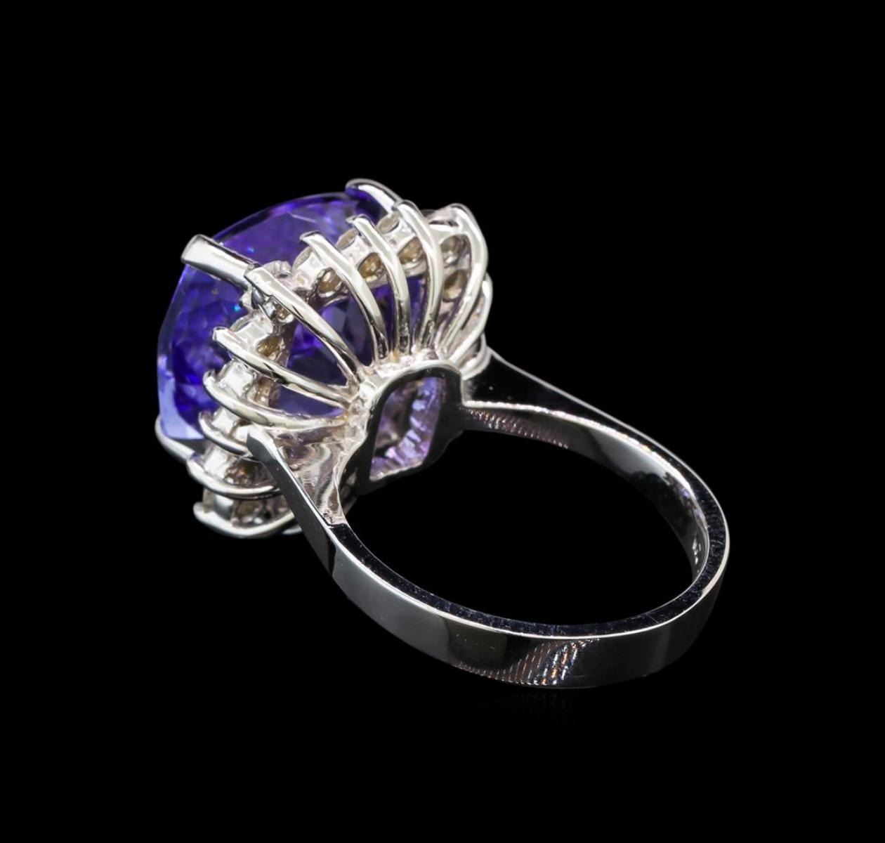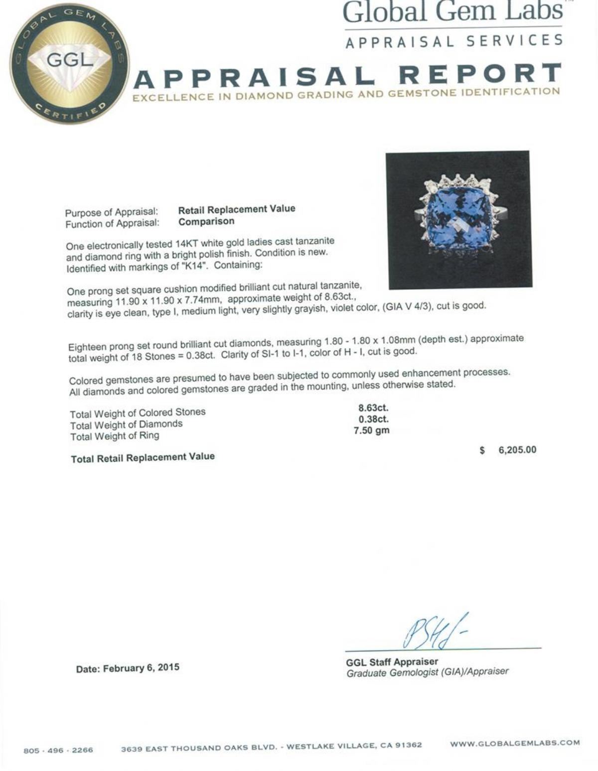 One electronically tested 14KT white gold ladies cast tanzanite and diamond ring with a bright polish finish. Identified with markings of "K14". Condition is new. Containing: One prong set square cushion modified brilliant cut natural tanzanite, measuring 11.90 x 11.90 x 7.74mm, approximate weight of 8.63ct., clarity is eye clean, type I, medium light, very slightly grayish, violet color, (GIA V 4/3), cut is good. Eighteen prong set round brilliant cut diamonds, measuring 1.80 - 1.80 x 1.08mm (depth est.) approximate total weight of 18 Stones = 0.38ct. Clarity: SI-1 to I-1. Color: H - I, Cut is Good. Colored gemstones are presumed to have been subjected to commonly used enhancement processes. All diamonds and colored gemstones are graded in the mounting, unless otherwise stated. Total Weight of Colored Stones 8.63ct. Total Weight of Diamonds 0.38ct. Total Weight of Ring 7.50 grams. GGL Appraised.