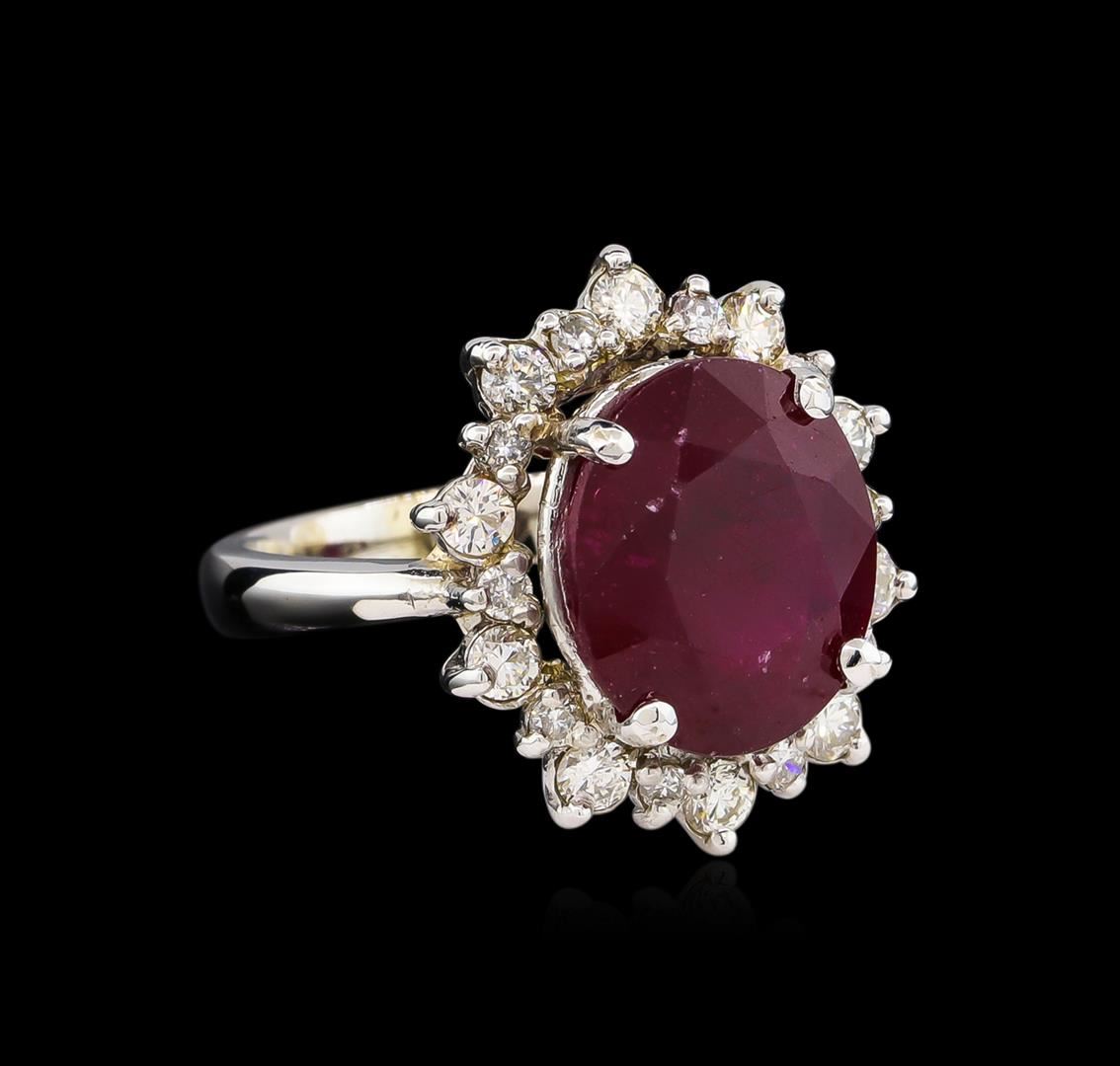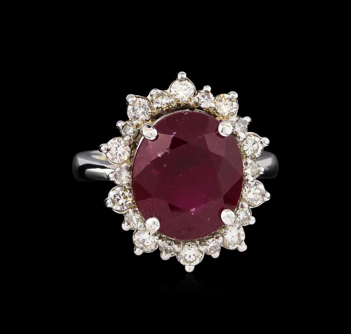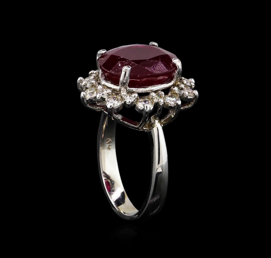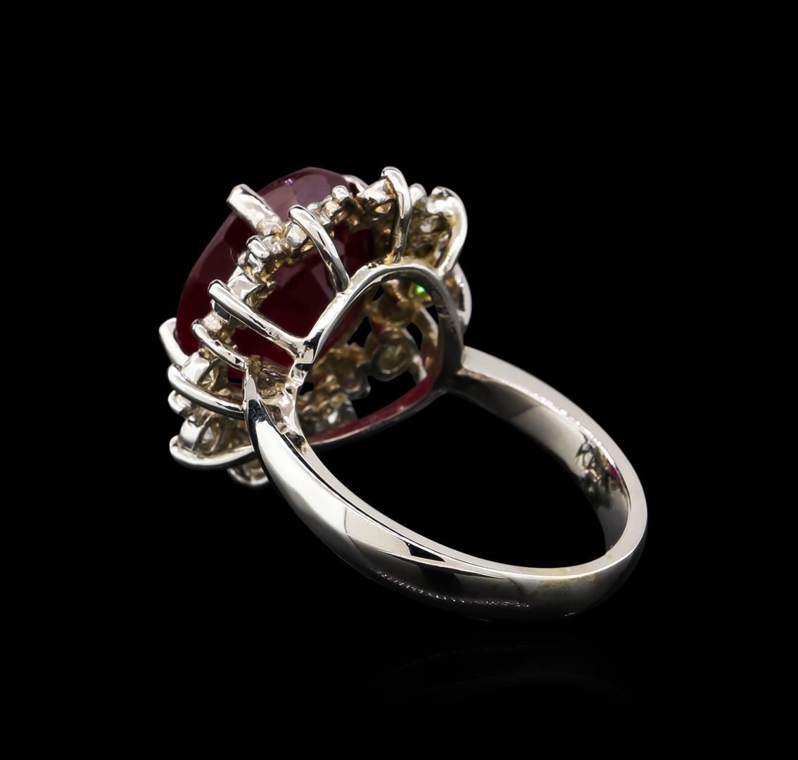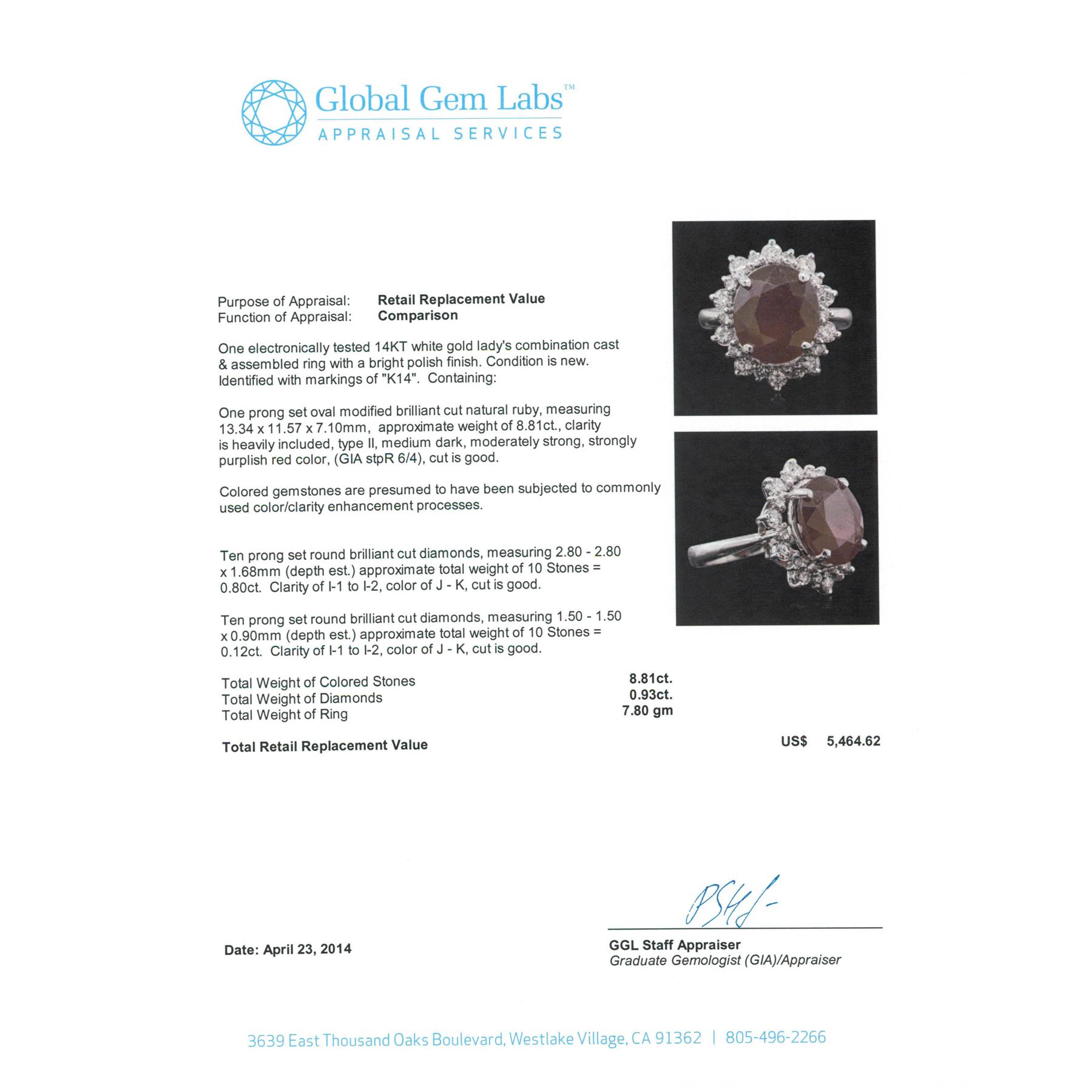 One electronically tested 14KT white gold Ladies combination cast & assembled ring with a bright polish finish. Condition is new. Identified with markings of "K14". Containing: One prong set oval modified brilliant cut natural ruby, measuring 13.34 x 11.57 x 7.10mm, approximate weight of 8.81ct., clarity is heavily included, type II, medium dark, moderately strong, strongly purplish red color, (GIA stpR 6/4), cut is good. Colored gemstones are presumed to have been subjected to commonly used color/clarity enhancement processes. Ten prong set round brilliant cut diamonds, measuring 2.80 - 2.80 x 1.68mm (depth est.) approximate. Total Weight of 10 Stones = 0.80ct. Clarity: I-1 to I-2. Color: J - K, Cut is Good. Ten prong set round brilliant cut diamonds, measuring 1.50 - 1.50 x 0.90mm (depth est.) approximate. Total Weight of 10 Stones = 0.12ct. Clarity: I-1 to I-2. Color: J - K, Cut is Good. Total Weight of Colored Stones 8.81ct. Total Weight of Diamonds 0.93ct. Total Weight of Ring 7.80 grams. GGL Appraised at $5,465.00.