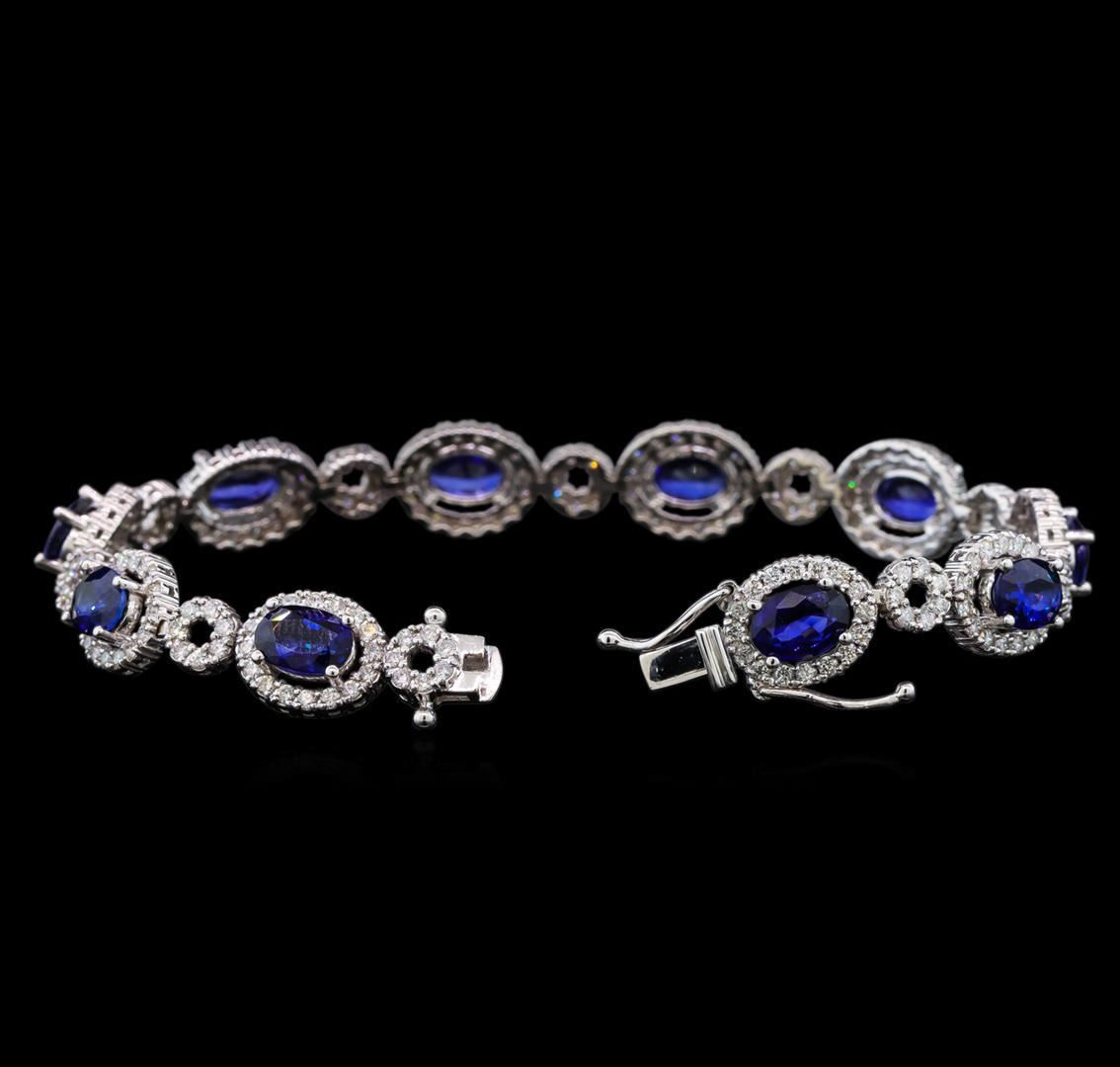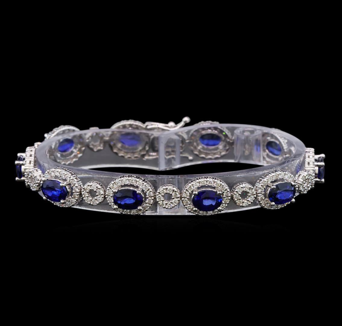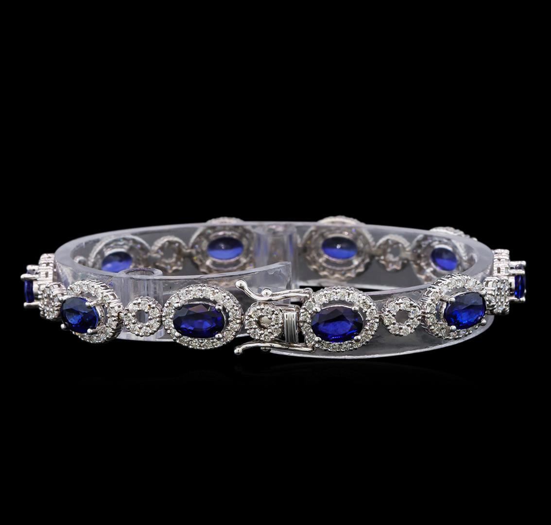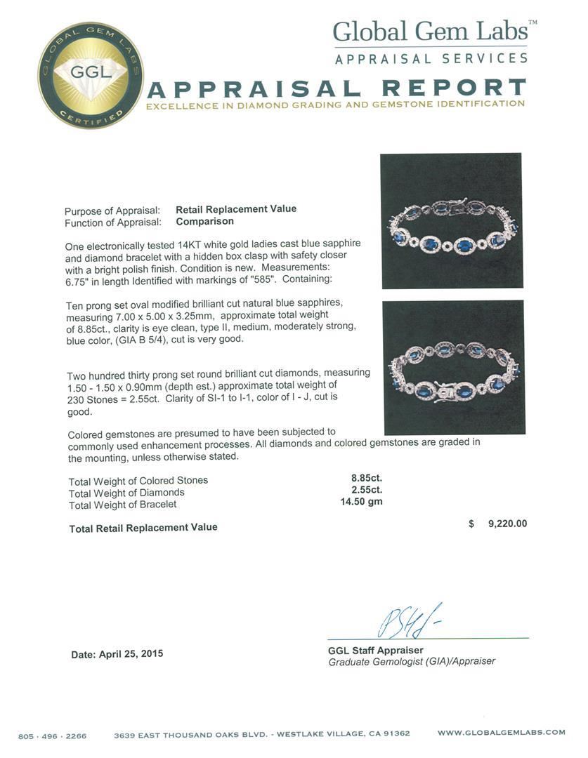 One electronically tested 14KT white gold ladies cast blue sapphire and diamond bracelet with a hidden box clasp with safety closer with a bright polish finish. Measurements: 6.75" in length Identified with markings of "585". Condition is new. Containing: Ten prong set oval modified brilliant cut natural blue sapphires, measuring 7.00 x 5.00 x 3.25mm, approximate total weight of 8.85ct., clarity is eye clean, type II, medium, moderately strong, blue color, (GIA B 5/4), cut is very good. Two Hundred Thirty prong set round brilliant cut diamonds, measuring 1.50 - 1.50 x 0.90mm (depth est.) approximate total weight of 230 Stones = 2.55ct. Clarity: SI-1 to I-1. Color: I - J, Cut is Good. Colored gemstones are presumed to have been subjected to commonly used enhancement processes. All diamonds and colored gemstones are graded in the mounting, unless otherwise stated. Total Weight of Colored Stones 8.85ct. Total Weight of Diamonds 2.55ct. Total Weight of Bracelet 14.50 grams. GGL Appraised.