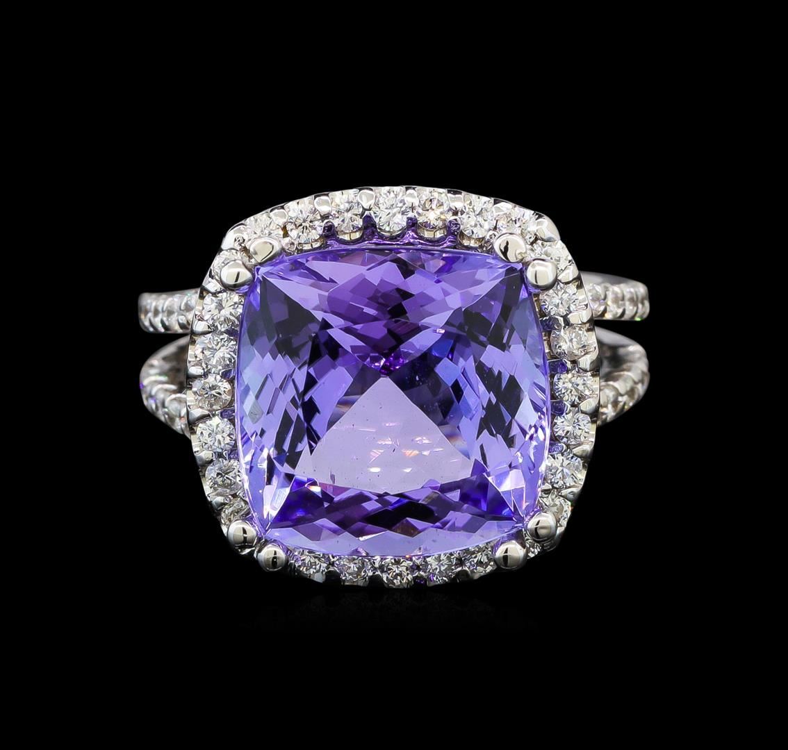 One electronically tested 14KT white gold ladies cast tanzanite and diamond ring with a bright polish finish. Identified with markings of "K14". Condition is new. Containing: One prong set square cushion modified brilliant cut natural tanzanite, measuring 12.10 x 12.10 x 7.87mm, approximate weight of 9.07ct., clarity is eye clean, type I, medium light, moderately strong, violet color, (GIA V 4/4), cut is good. Seventy-Six prong set round brilliant cut diamonds, measuring 1.30 - 1.30 x 0.78mm (depth est.) approximate. Total Weight of 76 Stones = 0.61ct. Clarity: SI-1 to SI-2. Color: I - J, Cut is Good. Colored gemstones are presumed to have been subjected to commonly used enhancement processes. All diamonds and colored gemstones are graded in the mounting, unless otherwise stated. Total Weight of Colored Stones 9.07ct. Total Weight of Diamonds 0.61ct. Total Weight of Ring 8.10 grams. GGL Appraised.