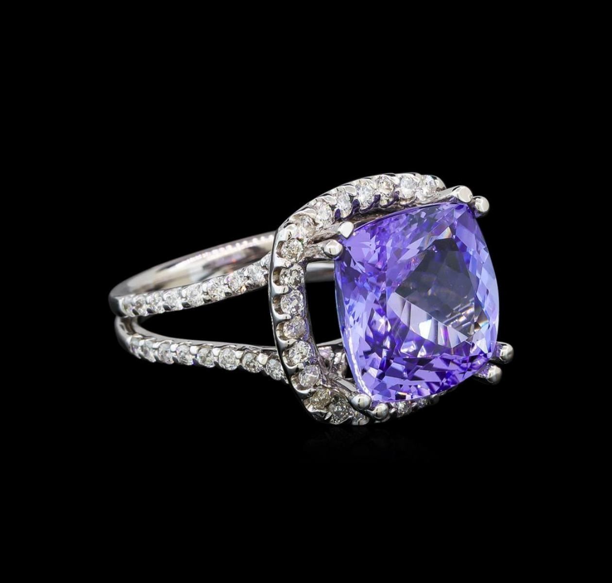 One electronically tested 14KT white gold ladies cast tanzanite and diamond ring with a bright polish finish. Identified with markings of "K14". Condition is new. Containing: One prong set square cushion modified brilliant cut natural tanzanite, measuring 12.10 x 12.10 x 7.87mm, approximate weight of 9.07ct., clarity is eye clean, type I, medium light, moderately strong, violet color, (GIA V 4/4), cut is good. Seventy-Six prong set round brilliant cut diamonds, measuring 1.30 - 1.30 x 0.78mm (depth est.) approximate. Total Weight of 76 Stones = 0.61ct. Clarity: SI-1 to SI-2. Color: I - J, Cut is Good. Colored gemstones are presumed to have been subjected to commonly used enhancement processes. All diamonds and colored gemstones are graded in the mounting, unless otherwise stated. Total Weight of Colored Stones 9.07ct. Total Weight of Diamonds 0.61ct. Total Weight of Ring 8.10 grams. GGL Appraised.