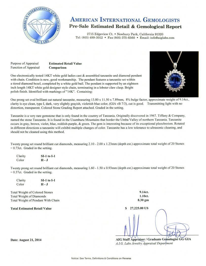 One electronically tested 14KT white gold ladies cast & assembled tanzanite and diamond pendant with chain. Condition is new, good workmanship. The pendant features a tanzanite set within a tiered diamond bezel, completed by a white gold bail. The pendant is supported by an eighteen inch length 14KT white gold designer style chain, terminating in a lobster claw clasp. Bright polish finish. Identified with markings of "14K". Containing: One prong set oval brilliant cut natural tanzanite, measuring 13.80 x 11.50 x 7.89mm, 8% bulge factor, approximate weight of 9.14ct., clarity is eye clean, type I, dark, very slightly grayish, violetish blue color, (GIA vB 7/3), cut is good. Transmitting light with no distortion, transparent. Colored Stone Grading Report attached. Graded in the setting. Tanzanite is a very rare gemstone that is only found in the country of Tanzania. Originally discovered in 1967. Tiffany & Company, named the stone Tanzanite. It is found in the Usumburu Mountains that border the Umba Valley of northern Tanzania. Tanzanite occurs in gray, brown, violet, blue, reddish-purple, & green. The gem is interesting because of its exceptional pleochroism. Rotated in different directions a tanzanite will exhibit multiple changes of color. Tanzanite has a low tolerance to ultrasonic cleaning, and should not be cleaned using this method. Twenty prong set round brilliant cut diamonds, measuring 2.10 - 2.00 x 1.23mm (depth est.) approximate total weight of 20 Stones = 0.73ct. Graded in the setting. Clarity SI-1 to I-1 Color H - J Twenty prong set round brilliant cut diamonds, measuring 1.60 - 1.50 x 0.93mm (depth est.) approximate total weight of 20 Stones = 0.37ct. Graded in the setting. Clarity SI-1 to I-1 Color H - J Total Weight of Colored Stones 9.14ct. Total Weight of Diamonds 1.10 ct. Total Weight of Pendant With Chain 8.30 grams. AIG appraised at $27,225.00. AIG Appraised.