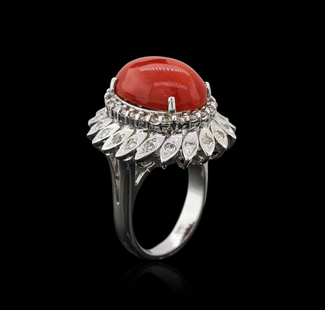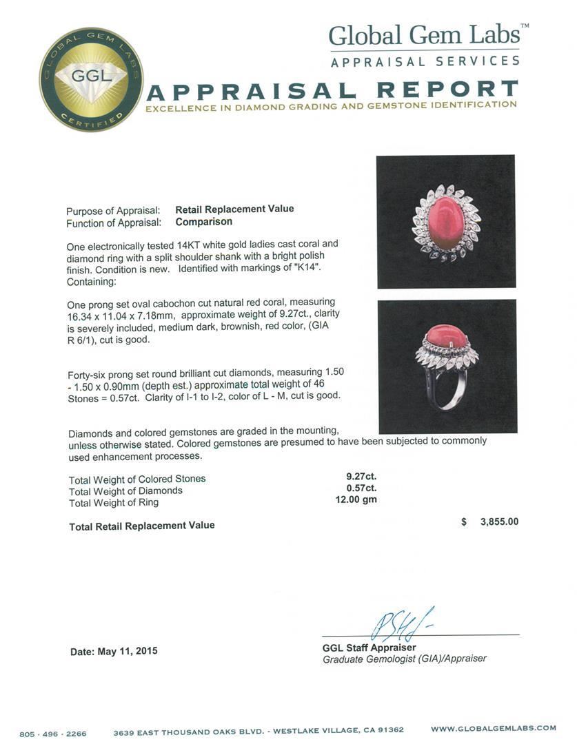 One electronically tested 14KT white gold ladies cast coral and diamond ring with a split shoulder shank with a bright polish finish. Identified with markings of "K14". Condition is new. Containing: One prong set oval cabochon cut natural red coral, measuring 16.34 x 11.04 x 7.18mm, approximate weight of 9.27ct., clarity is severely included, medium dark, brownish, red color, (GIA R 6/1), cut is good. Forty-Six prong set round brilliant cut diamonds, measuring 1.50 - 1.50 x 0.90mm (depth est.) approximate total weight of 46 Stones = 0.57ct. Clarity: I-1 to I-2. Color: L - M, Cut is Good. Diamonds and colored gemstones are graded in the mounting, unless otherwise stated. Colored gemstones are presumed to have been subjected to commonly used enhancement processes. Total Weight of Colored Stones 9.27ct. Total Weight of Diamonds 0.57ct. Total Weight of Ring 12.00 grams. GGL Appraised.