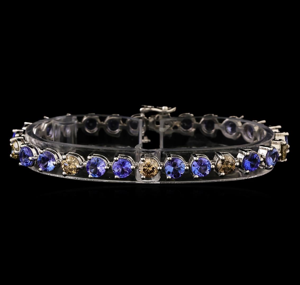 One electronically tested 14KT white gold ladies combination cast & assembled tanzanite and diamond bracelet with a hidden box clasp with safety closer with a bright polish finish. Bracelet measures 7" long. Identified with markings of "14K". Condition is new. Containing: Twenty-two prong set round modified brilliant cut natural tanzanites, measuring 4.87 - 4.99 x 2.71 mm, approximate total weight of 9.46ct., clarity is eye clean, type I, medium light, very slightly grayish, violet color, (GIA V 4/3), cut is good. Five prong set round brilliant cut diamonds, measuring 5.20 - 5.20 x 3.12mm (depth est.) approximate total weight of 5 Stones = 2.57ct. Clarity: I-1 to I-2, Cut is Good. All diamonds and colored gemstones are graded in the mounting, unless otherwise stated. Colored gemstones are presumed to have been subjected to commonly used enhancement processes. Total Weight of Colored Stones 9.46ct. Total Weight of Diamonds 2.57ct. Total Weight of Bracelet 17.70 grams. GGL Appraised.