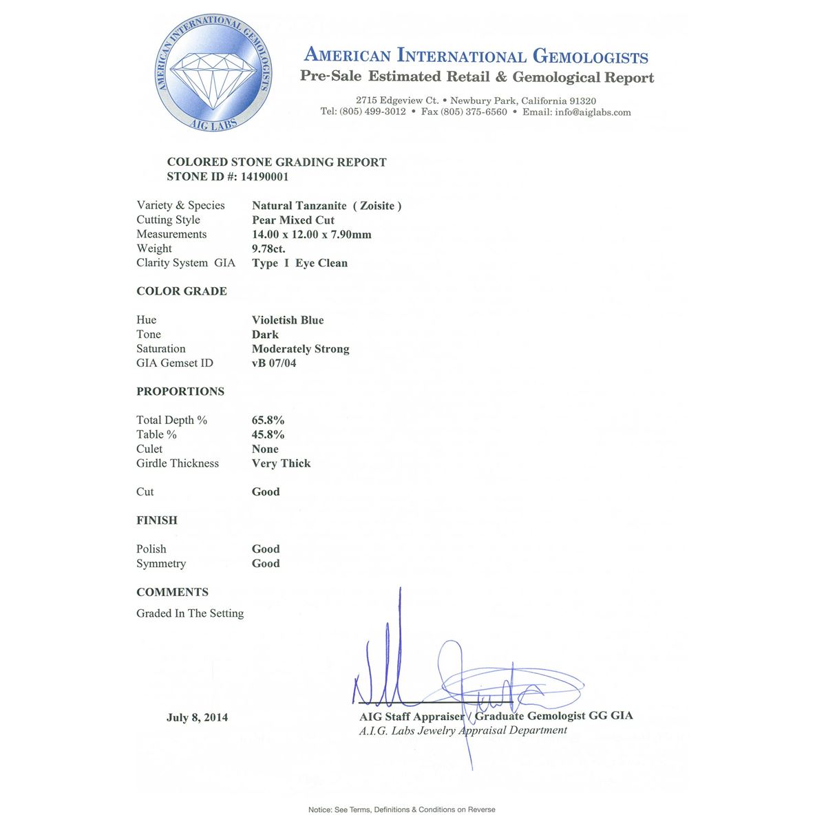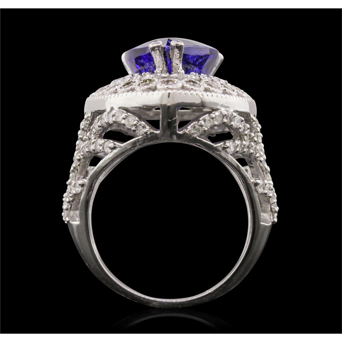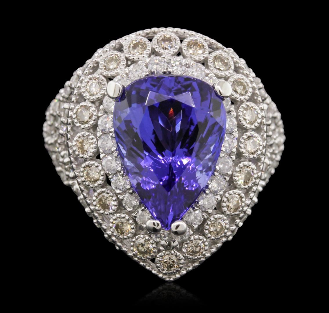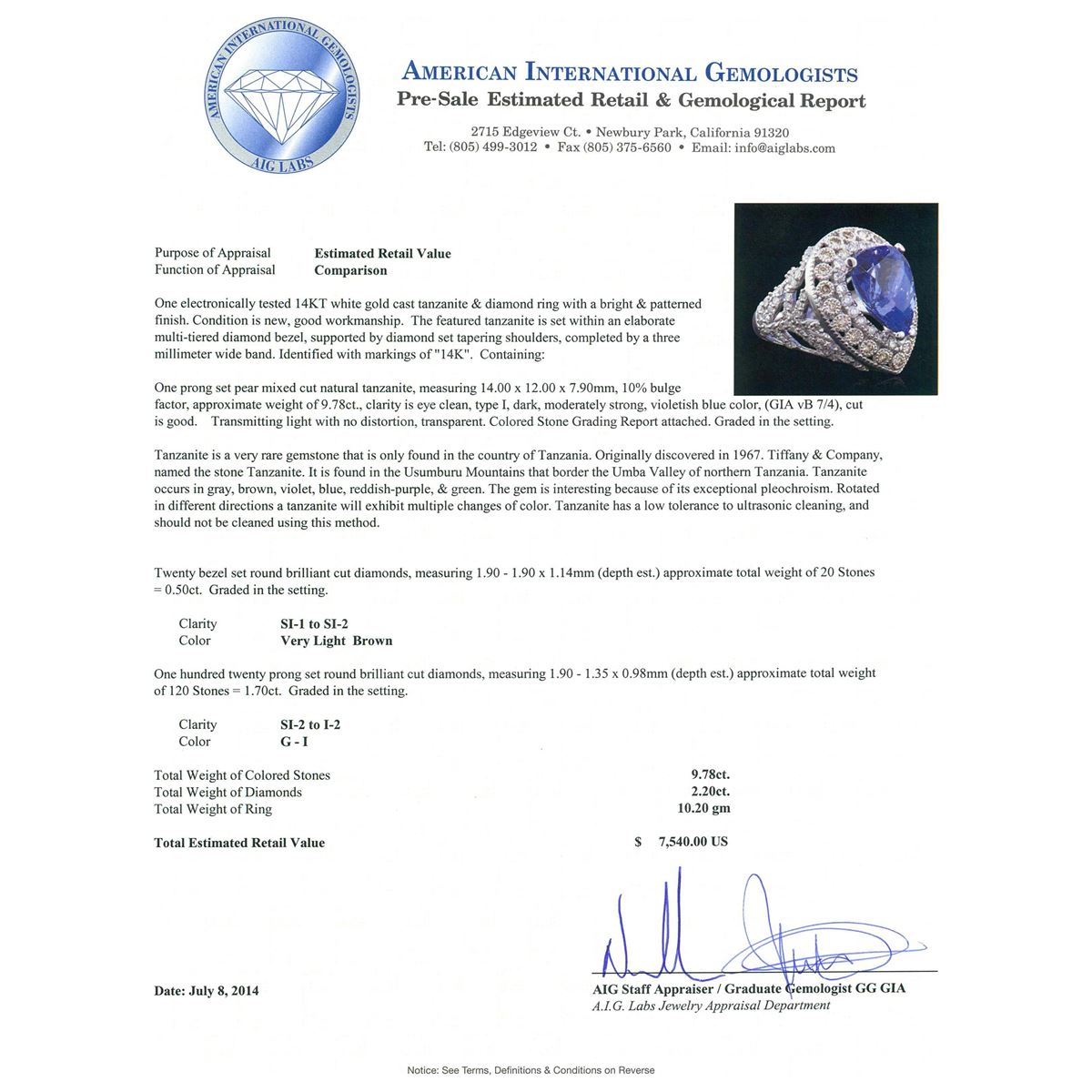 One electronically tested 14KT white gold cast tanzanite & diamond ring with a bright & patterned finish. The featured tanzanite is set within an elaborate multi-tiered diamond bezel, supported by diamond set tapering shoulders, completed by a three millimeter wide band. Identified with markings of "14K". Condition is new, good workmanship. Containing: One prong set pear mixed cut natural tanzanite, measuring 14.00. x 12.00. x 7.90mm, 10%. bulge factor, approximate weight of 9.78ct., clarity is eye clean, type I, dark, moderately strong, violetish blue color, (GIA vB 7/4), cut is good. Transmitting light with no distortion, transparent. Colored Stone Grading Report attached. Graded in the setting. Tanzanite is a very rare gemstone that is only found in the country of Tanzania. Originally discovered in 1967. Tiffany & Company, named the stone Tanzanite. It is found in the Usumburu Mountains that border the Umba Valley of northern Tanzania. Tanzanite occurs in gray, brown, violet, blue, reddish-purple, & green. The gem is interesting because of its exceptional pleochroism. Rotated in different directions a tanzanite will exhibit multiple changes of color. Tanzanite has a low tolerance to ultrasonic cleaning, and should not be cleaned using this method. Twenty bezel set round brilliant cut diamonds, measuring 1.90 - 1.90 x 1.14mm (depth est.) approximate total weight of 20 Stones = 0.50ct. Graded in the setting. Clarity: SI-1 to SI-2 One Hundred Twenty prong set round brilliant cut diamonds, measuring 1.90 - 1.35 x 0.98mm (depth est.) approximate total weight of 120 Stones = 1.70ct. Graded in the setting. Clarity: SI-2 to I-2 . Color: G - I. Total Weight of Colored Stones 9.78ct. Total Weight of Diamonds 2.20ct. Total Weight of Ring 10.20 grams. AIG Appraised at $7,540.00.