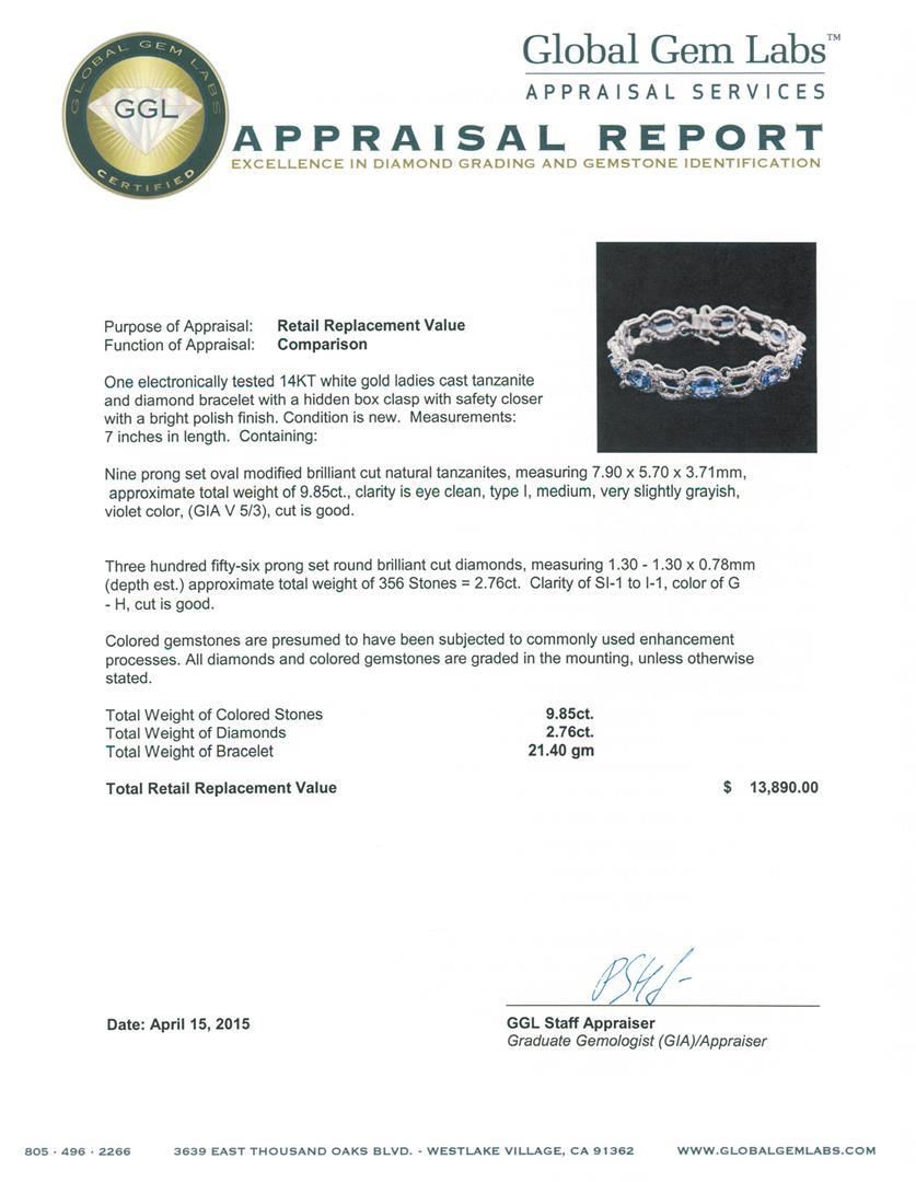 One electronically tested 14KT white gold ladies cast tanzanite and diamond bracelet with a hidden box clasp with safety closer with a bright polish finish. Measurements: 7 inches in length. Condition is new. Containing: Nine prong set oval modified brilliant cut natural tanzanites, measuring 7.90 x 5.70 x 3.71mm, approximate total weight of 9.85ct., clarity is eye clean, type I, medium, very slightly grayish, violet color, (GIA V 5/3), cut is good. Three Hundred Fifty-Six prong set round brilliant cut diamonds, measuring 1.30 - 1.30 x 0.78mm (depth est.) approximate total weight of 356 Stones = 2.76ct. Clarity: SI-1 to I-1. Color: G - H, Cut is Good. Colored gemstones are presumed to have been subjected to commonly used enhancement processes. All diamonds and colored gemstones are graded in the mounting, unless otherwise stated. Total Weight of Colored Stones 9.85ct. Total Weight of Diamonds 2.76ct. Total Weight of Bracelet 21.40 grams. GGL Appraised.