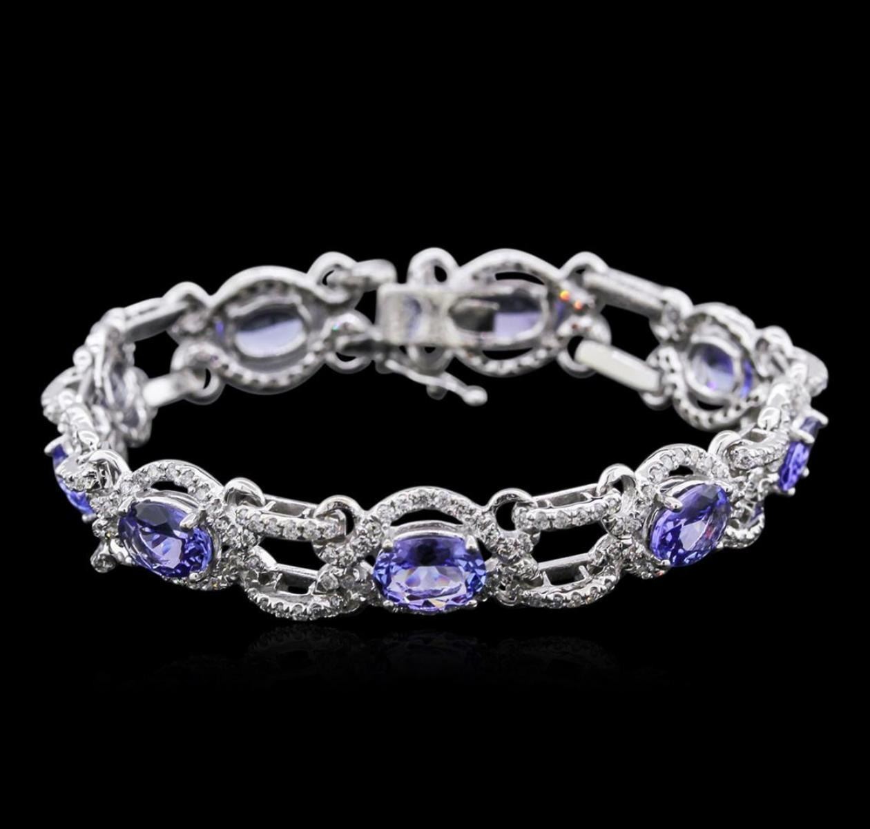 One electronically tested 14KT white gold ladies cast tanzanite and diamond bracelet with a hidden box clasp with safety closer with a bright polish finish. Measurements: 7 inches in length. Condition is new. Containing: Nine prong set oval modified brilliant cut natural tanzanites, measuring 7.90 x 5.70 x 3.71mm, approximate total weight of 9.85ct., clarity is eye clean, type I, medium, very slightly grayish, violet color, (GIA V 5/3), cut is good. Three Hundred Fifty-Six prong set round brilliant cut diamonds, measuring 1.30 - 1.30 x 0.78mm (depth est.) approximate total weight of 356 Stones = 2.76ct. Clarity: SI-1 to I-1. Color: G - H, Cut is Good. Colored gemstones are presumed to have been subjected to commonly used enhancement processes. All diamonds and colored gemstones are graded in the mounting, unless otherwise stated. Total Weight of Colored Stones 9.85ct. Total Weight of Diamonds 2.76ct. Total Weight of Bracelet 21.40 grams. GGL Appraised.