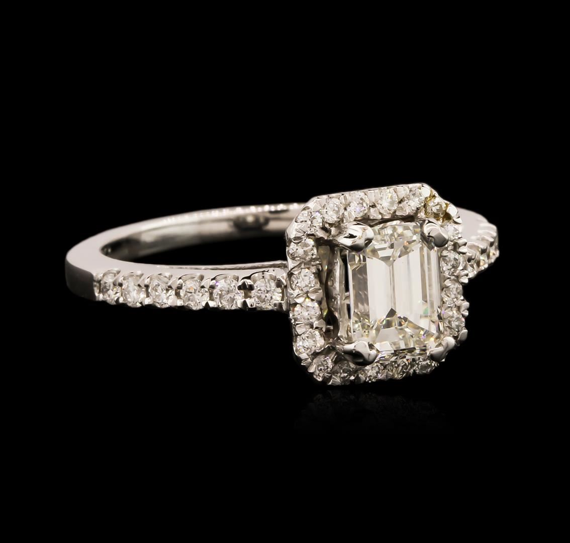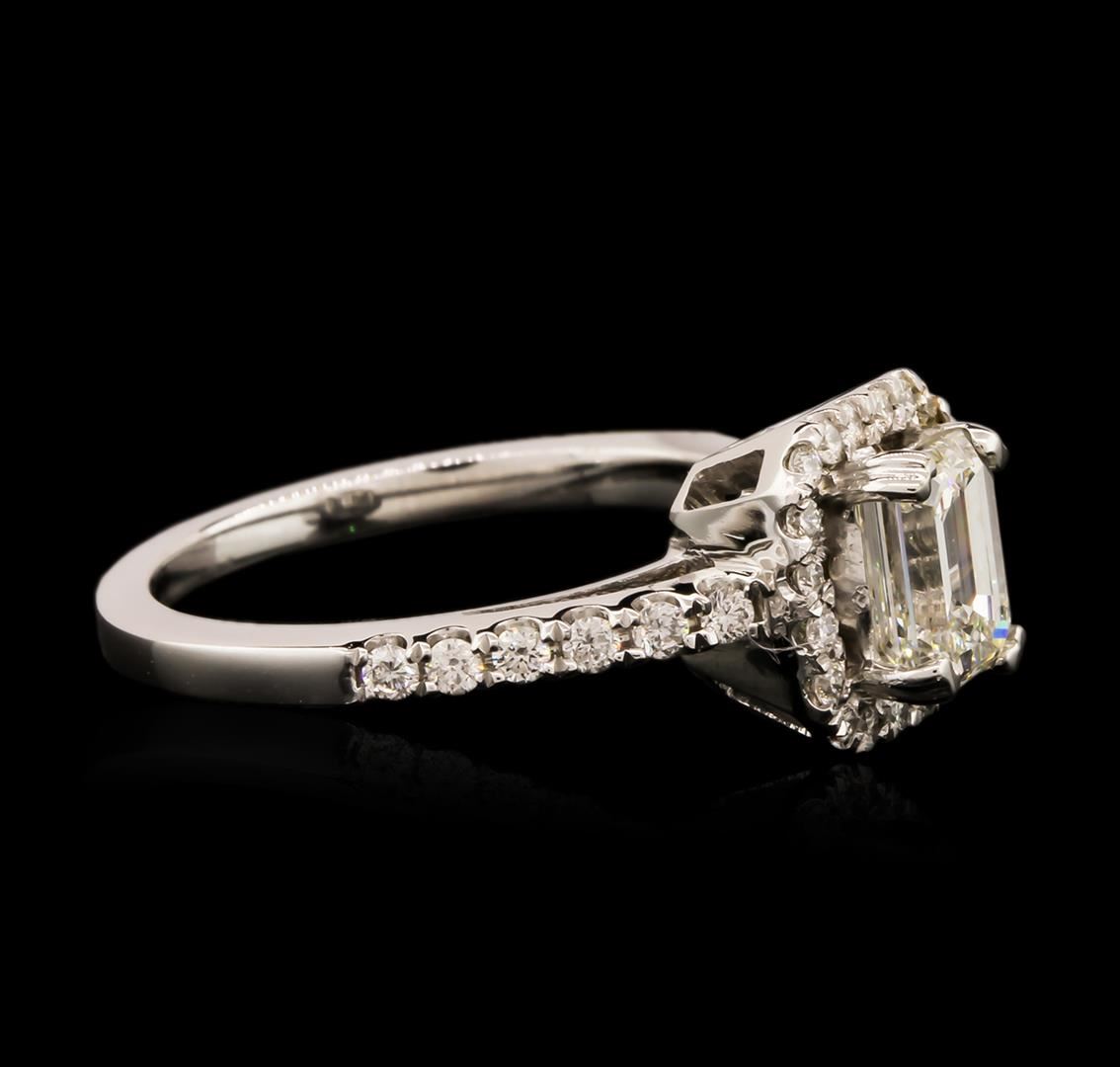 One electronically tested 14KT white gold ladies cast diamond unity ring with a bright polish finish. The featured diamond is set within a diamond bezel supported by diamond set shoulders, completed by a one and one-half millimeter wide band. Identified with markings of "14K". Condition is new, good workmanship. Containing: One prong set emerald shaped cut diamond, measuring 6.40 x 4.75 x 3.60mm exact weight 1.00ct. EGL Report attached. Graded loose prior to setting in the EGL Laboratory Report #US 912917107D. Clarity: VS-2. Color: G. Depth 75.8%. Table 69.4%. Pavil. Depth%. 58.4%. Thirty-Two prong set round brilliant cut diamonds, measuring 1.50 - 1.30 x 0.84mm (depth est.) approximate total weight of 32 Stones = 0.42ct. Graded in the setting. Clarity: SI-1 to SI-2. Color: G - I. Total Weight of Diamonds 1.42ct. Total Weight of Ring 3.80 grams. AIG Appraised at $13,615.00.