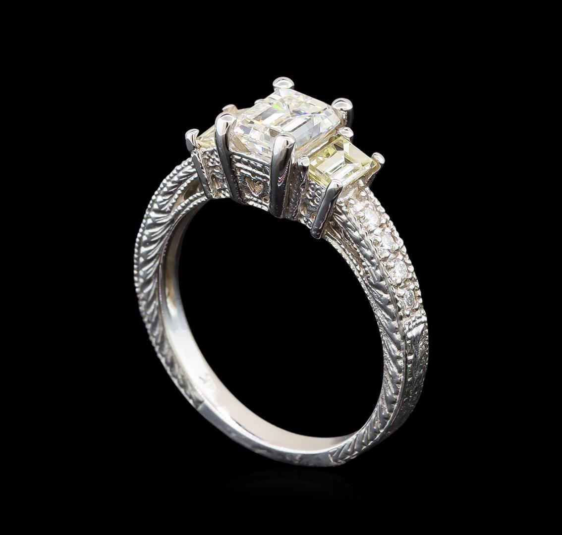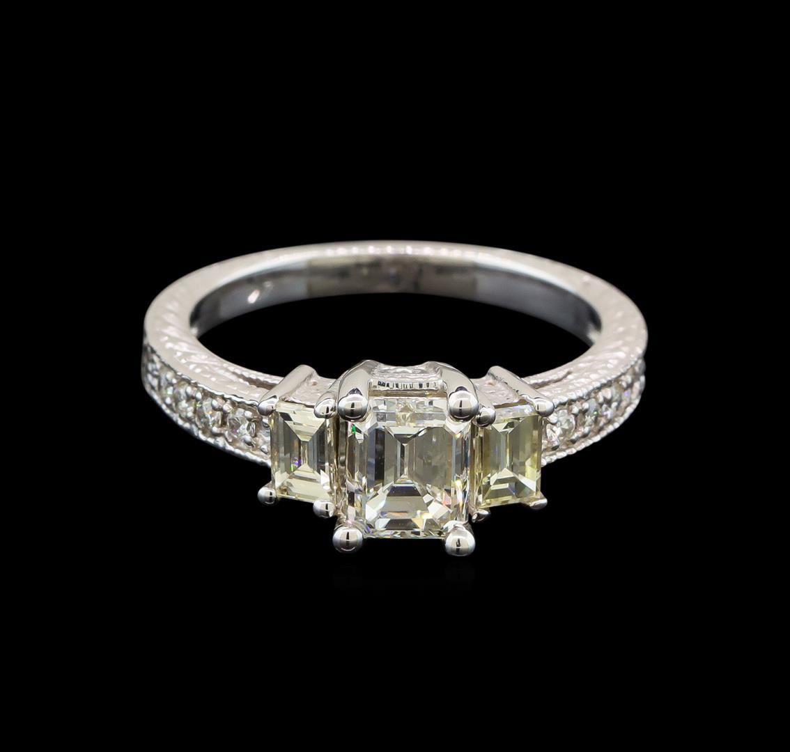 One electronically tested 14KT white gold ladies cast diamond unity ring. The featured diamond is accented by a single baguette diamond on either side supported by diamond set shoulders, completed by a two millimeter wide band. Bright and patterned finish with milgrain detailing. Identified with markings of "14K". Condition is new, good workmanship. Containing: One prong set emerald shaped cut diamond, measuring 5.99 x 4.98 x 3.94mm exact weight 1.07ct. EGL Report attached. Graded loose prior to setting in the EGL Laboratory Report#US 912917102D. Clarity: VS-1. Color: G. Depth 79.1%. Table 70.0%. Pavil. Depth%. 59.8%. One prong set baguette cut diamond, measuring 4.10 x 2.85 x 1.70mm (depth est.) approximate weight of 0.18ct. Graded in the setting. Clarity: SI-1. Color: I One prong set baguette cut diamond, measuring 4.00 x 3.00 x 1.90mm (depth est.) approximate weight of 0.21ct. Graded in the setting. Clarity: VS-2. Color: K Eight prong set round brilliant cut diamonds, measuring 1.50 - 1.40 x 0.87mm (depth est.) approximate total weight of 8 Stones = 0.09ct. Graded in the setting. Clarity: SI-1 to SI-2. Color: G - I. Total Weight of Diamonds 1.55ct. Total Weight of Ring 4.02 grams. AIG Appraised.