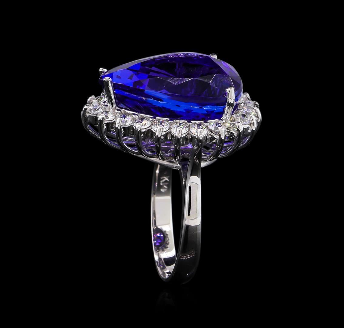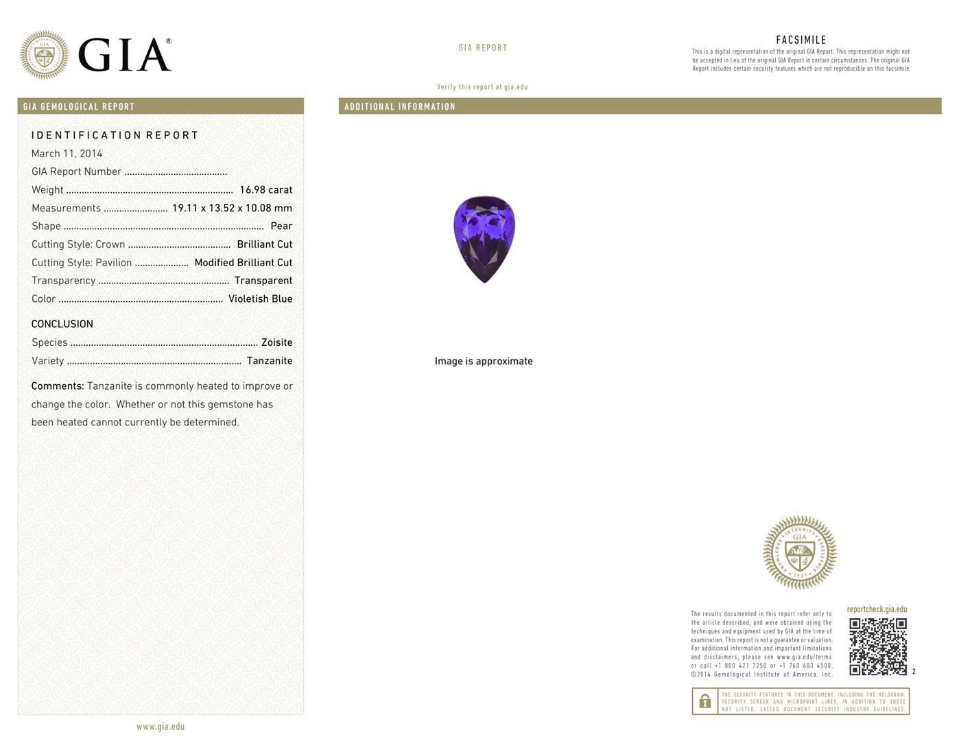 One electronically tested 14KT white gold ladies cast tanzanite and diamond ring with a bright polish finish. The featured tanzanite is set within a diamond bezel, completed by a three millimeter wide band. Identified with markings of "14K". Condition is new, good workmanship. Containing: One prong set pear modified brilliant cut natural tanzanite, measuring 19.11 x 13.52 x 10.08mm, exact weight 16.98ct., clarity is eye clean, type I, dark, moderately strong, violetish blue color, (GIA vB 7/4), cut is good. Transmitting light with no distortion, transparent. GIA Gemological Report attached. Graded loose prior to setting in the GIA Laboratory, Report #1156962476.Tanzanite is a very rare gemstone that is only found in the country of Tanzania. Originally discovered in 1967. Tiffany & Company, named the stone Tanzanite. It is found in the Usumburu Mountains that border the Umba Valley of northern Tanzania. Tanzanite occurs in gray, brown, violet, blue, reddish-purple, & green. The gem is interesting because of its exceptional pleochroism. Rotated in different directions a tanzanite will exhibit multiple changes of color. Tanzanite has a low tolerance to ultrasonic cleaning, and should not be cleaned using this method. Twenty-Two prong set round brilliant cut diamonds, measuring 2.40 - 2.30 x 1.41mm (depth est.) approximate total weight of 22 Stones = 1.15ct. Graded in the setting. Clarity: SI-1 to SI-2. Color: G - I. Total Weight of Colored Stones 16.98ct. Total Weight of Diamonds 1.15ct. Total Weight of Ring 10.48 grams. AIG Appraised.