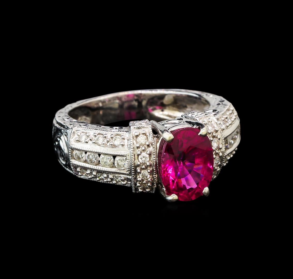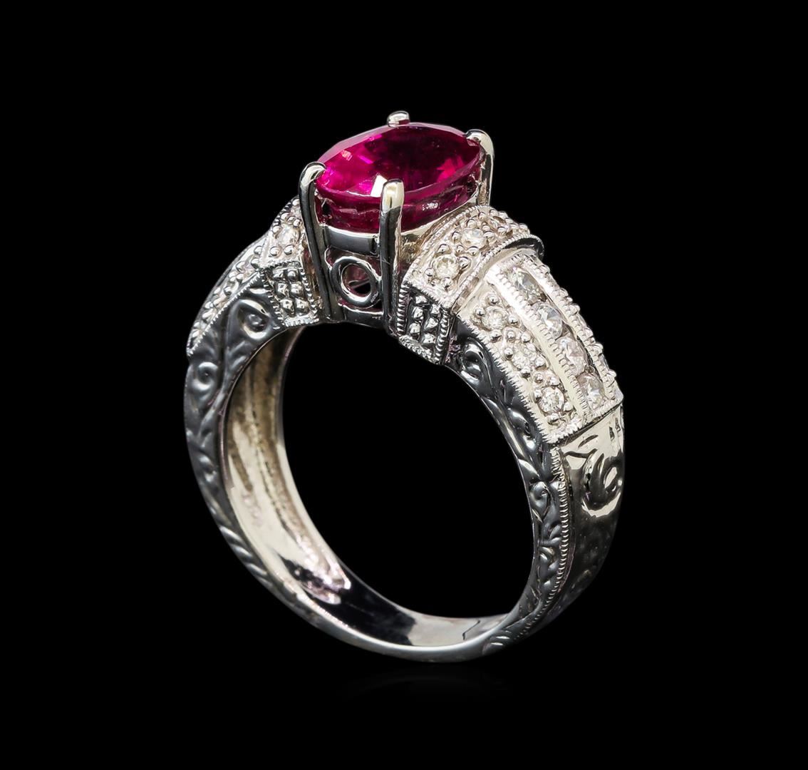 One electronically tested 14KT white gold ladies cast rubellite tourmaline and diamond ring. The featured rubellite tourmaline is supported by elaborate diamond set shoulders, completed by a patterned three and one-half millimeter wide band. Bright polish finish with milgrain detailing throughout. Identified with markings of "14K". Condition is good. Containing: One prong set oval mixed cut natural rubellite, measuring 9.43 x 6.86 x 5.47mm, 6% bulge factor, approximate weight of 2.35ct., clarity is slightly included, type III, dark, very slightly brownish, slightly purplish red color, (GIA slpR 7/3), cut is good. Transmitting light with a minimum of distortion, transparent. Naturally occurring internal & external characteristics are present. GIA Gemological Report attached. Graded for identification the GIA Laboratory, Report #1166833661.Twenty-Eight prong and channel set round brilliant cut diamonds, measuring 2.10 - 1.50 x 1.08mm (depth est.) approximate total weight of 28 Stones = 0.69ct. Graded in the setting. Clarity: VS-2 to SI-1. Color: G - I. Total Weight of Colored Stones 2.35ct. Total Weight of Diamonds 0.69ct. Total Weight of Ring 6.86 grams. AIG Appraised.