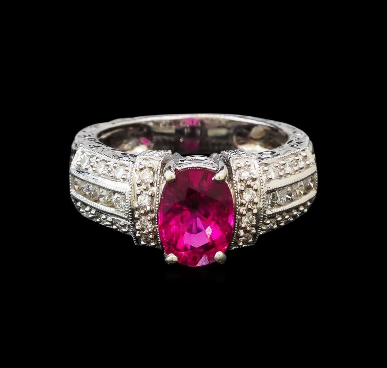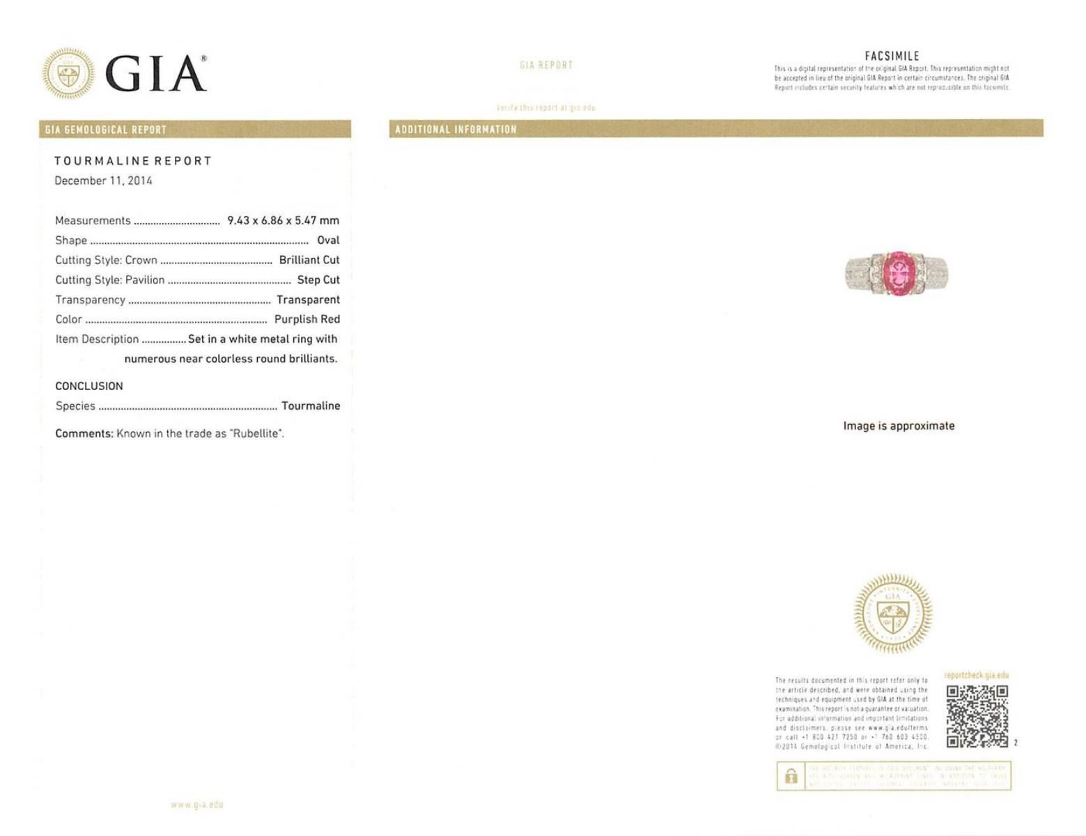 One electronically tested 14KT white gold ladies cast rubellite tourmaline and diamond ring. The featured rubellite tourmaline is supported by elaborate diamond set shoulders, completed by a patterned three and one-half millimeter wide band. Bright polish finish with milgrain detailing throughout. Identified with markings of "14K". Condition is good. Containing: One prong set oval mixed cut natural rubellite, measuring 9.43 x 6.86 x 5.47mm, 6% bulge factor, approximate weight of 2.35ct., clarity is slightly included, type III, dark, very slightly brownish, slightly purplish red color, (GIA slpR 7/3), cut is good. Transmitting light with a minimum of distortion, transparent. Naturally occurring internal & external characteristics are present. GIA Gemological Report attached. Graded for identification the GIA Laboratory, Report #1166833661.Twenty-Eight prong and channel set round brilliant cut diamonds, measuring 2.10 - 1.50 x 1.08mm (depth est.) approximate total weight of 28 Stones = 0.69ct. Graded in the setting. Clarity: VS-2 to SI-1. Color: G - I. Total Weight of Colored Stones 2.35ct. Total Weight of Diamonds 0.69ct. Total Weight of Ring 6.86 grams. AIG Appraised.