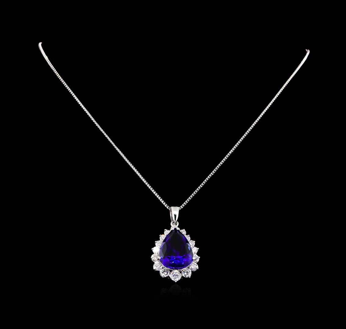 One electronically tested 14KT white gold ladies cast & assembled tanzanite and diamond pendant with chain. The pendant features a tanzanite set within a diamond bezel, completed by a white gold bail. The pendant is supported by an eighteen inch length 14KT white gold designer style chain, terminating in a lobster claw clasp. Bright polish finish. Identified with markings of 14K. Condition is new, good workmanship. Containing: One prong set pear modified brilliant cut natural tanzanite, measuring 20.95 x 15.50 x 11.20mm, exact weight 23.12ct., clarity is eye clean, type I, dark, moderately strong, bluish violet color, (GIA bV 7/4), cut is good. Transmitting light with no distortion, transparent. GIA Gemological Report attached. Graded loose prior to setting in the GIA Laboratory, Report #6167542851.Tanzanite is a very rare gemstone that is only found in the country of Tanzania. Originally discovered in 1967. Tiffany & Company, named the stone Tanzanite. It is found in the Usumburu Mountains that border the Umba Valley of northern Tanzania. Tanzanite occurs in gray, brown, violet, blue, reddish-purple, & green. The gem is interesting because of its exceptional pleochroism. Rotated in different directions a tanzanite will exhibit multiple changes of color. Tanzanite has a low tolerance to ultrasonic cleaning, and should not be cleaned using this method. One prong set round brilliant cut diamond, measuring 4.90 - 4.90 x 2.94mm (depth est.) approximate weight of 0.45ct. Graded in the setting. Clarity: I-1. Color: H Two prong set round brilliant cut diamonds, measuring 4.40 - 4.30 x 2.61mm (depth est.) approximate total weight of 2 Stones = 0.65ct. Graded in the setting. Clarity: SI-2. Color: H Twelve prong set round brilliant cut diamonds, measuring 3.70 - 3.30 x 2.10mm (depth est.) approximate total weight of 12 Stones = 1.98ct. Graded in the setting. Clarity: SI-1 to I-1. Color: H - I. Total Weight of Colored Stones 23.12ct. Total Weight of Diamonds 3.08ct. Total Weight of Pendant With Chain 17.84 grams. AIG Appraised at $76,455.00.