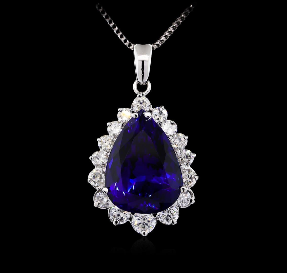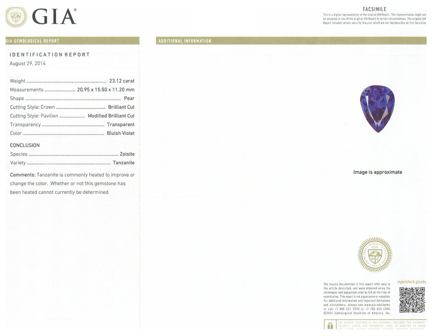 One electronically tested 14KT white gold ladies cast & assembled tanzanite and diamond pendant with chain. The pendant features a tanzanite set within a diamond bezel, completed by a white gold bail. The pendant is supported by an eighteen inch length 14KT white gold designer style chain, terminating in a lobster claw clasp. Bright polish finish. Identified with markings of 14K. Condition is new, good workmanship. Containing: One prong set pear modified brilliant cut natural tanzanite, measuring 20.95 x 15.50 x 11.20mm, exact weight 23.12ct., clarity is eye clean, type I, dark, moderately strong, bluish violet color, (GIA bV 7/4), cut is good. Transmitting light with no distortion, transparent. GIA Gemological Report attached. Graded loose prior to setting in the GIA Laboratory, Report #6167542851.Tanzanite is a very rare gemstone that is only found in the country of Tanzania. Originally discovered in 1967. Tiffany & Company, named the stone Tanzanite. It is found in the Usumburu Mountains that border the Umba Valley of northern Tanzania. Tanzanite occurs in gray, brown, violet, blue, reddish-purple, & green. The gem is interesting because of its exceptional pleochroism. Rotated in different directions a tanzanite will exhibit multiple changes of color. Tanzanite has a low tolerance to ultrasonic cleaning, and should not be cleaned using this method. One prong set round brilliant cut diamond, measuring 4.90 - 4.90 x 2.94mm (depth est.) approximate weight of 0.45ct. Graded in the setting. Clarity: I-1. Color: H Two prong set round brilliant cut diamonds, measuring 4.40 - 4.30 x 2.61mm (depth est.) approximate total weight of 2 Stones = 0.65ct. Graded in the setting. Clarity: SI-2. Color: H Twelve prong set round brilliant cut diamonds, measuring 3.70 - 3.30 x 2.10mm (depth est.) approximate total weight of 12 Stones = 1.98ct. Graded in the setting. Clarity: SI-1 to I-1. Color: H - I. Total Weight of Colored Stones 23.12ct. Total Weight of Diamonds 3.08ct. Total Weight of Pendant With Chain 17.84 grams. AIG Appraised.