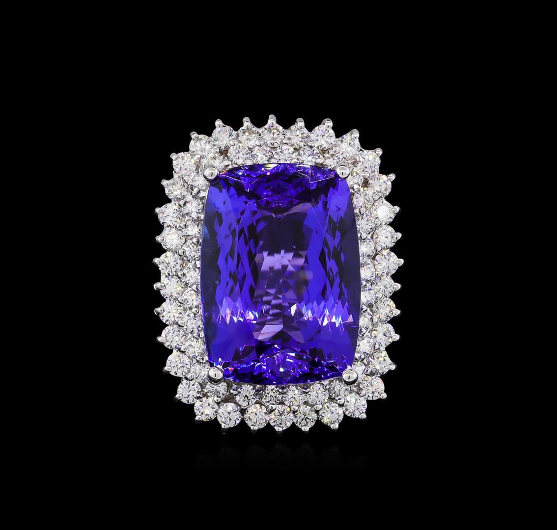 One electronically tested 14KT white gold ladies cast tanzanite and diamond ring with a bright polish finish. The featured tanzanite is set within a tiered diamond bezel, completed by a three millimeter wide band. Identified with markings of "K14". Condition is new, good workmanship. Containing: One prong set cushion mixed cut natural tanzanite, measuring 20.94 x 15.15 x 9.77mm, exact weight 26.74ct., type I Clarity is eye clean, dark, moderately strong, blue-violet color, (GIA BV), cut is good. Transmitting light with no distortion, transparent. GIA Gemological Report attached. Graded loose prior to setting in the GIA Laboratory, Report #1156962402. Tanzanite is a very rare gemstone that is only found in the country of Tanzania. Originally discovered in 1967. Tiffany & Company, named the stone Tanzanite. It is found in the Usumburu Mountains that border the Umba Valley of northern Tanzania. Tanzanite occurs in gray, brown, violet, blue, reddish-purple, & green. The gem is interesting because of its exceptional pleochroism. Rotated in different directions a tanzanite will exhibit multiple changes of color. Tanzanite has a low tolerance to ultrasonic cleaning, and should not be cleaned using this method.Sixty-Four prong set round brilliant cut diamonds, measuring 2.40 - 2.20 x 1.38mm (depth est.) approximate total weight of 64 Stones = 2.94ct. Graded in the setting. Clarity: VS-1 to VS-2. Color: H - J. Total Weight of Colored Stones 26.74ct. Total Weight of Diamonds 2.94ct. Total Weight of Ring 16.57 grams. AIG Appraised at $80,485.00.