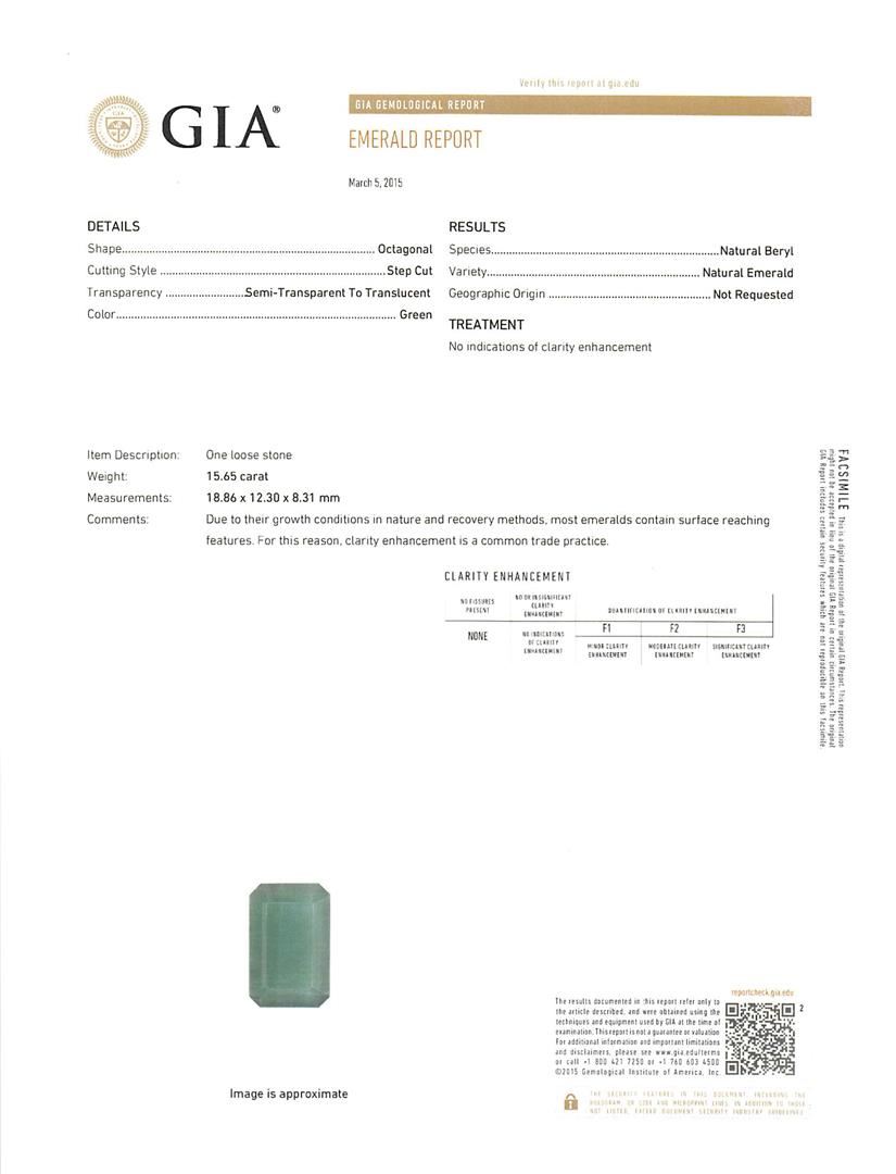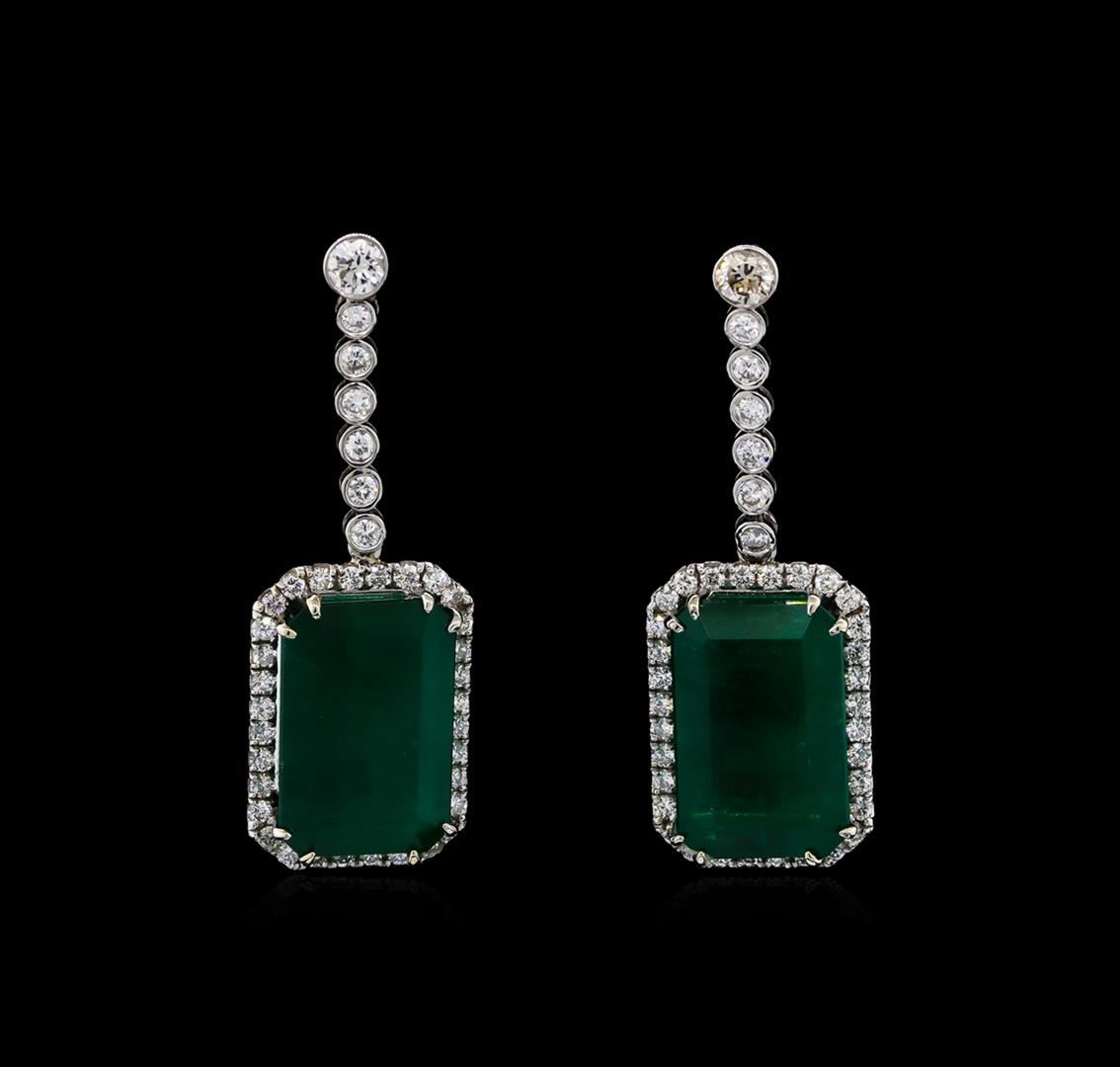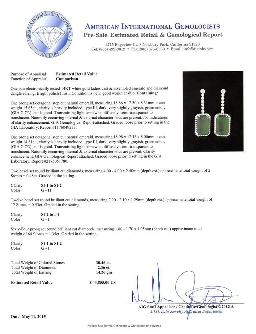 One pair electronically tested 14KT white gold ladies cast & assembled emerald and diamond dangle earrings. Bright polish finish. Condition is new, good workmanship. Containing: One prong set octagonal step cut natural emerald, measuring 18.86 x 12.30 x 8.31mm, exact weight 15.65ct., clarity is heavily included, type III, dark, very slightly grayish, green color, (GIA G 7/3), cut is good. Transmitting light somewhat diffusely, semi-transparent to translucent. Naturally occurring internal & external characteristics are present. No indications of clarity enhancement. GIA Gemological Report attached. Graded loose prior to setting in the GIA Laboratory, Report #1176049233.One prong set octagonal step cut natural emerald, measuring 18.98 x 12.16 x 8.00mm, exact weight 14.81ct., clarity is heavily included, type III, dark, very slightly grayish, green color, (GIA G 7/3), cut is good. Transmitting light somewhat diffusely, semi-transparent to translucent. Naturally occurring internal & external characteristics are present. Clarity enhancement. GIA Gemological Report attached. Graded loose prior to setting in the GIA Laboratory, Report #2175051780.Two bezel set round brilliant cut diamonds, measuring 4.00 - 4.00 x 2.40mm (depth est.) approximate total weight of 2 Stones = 0.48ct. Graded in the setting. Clarity: SI-1 to SI-2. Color: G - H Twelve bezel set round brilliant cut diamonds, measuring 2.20 - 2.10 x 1.29mm (depth est.) approximate total weight of 12 Stones = 0.53ct. Graded in the setting. Clarity: SI-2 to I-1. Color: G - I Sixty-Four prong set round brilliant cut diamonds, measuring 1.80 - 1.70 x 1.05mm (depth est.) approximate total weight of 64 Stones = 1.35ct. Graded in the setting. Clarity: SI-1 to SI-2. Color: G - I. Total Weight of Colored Stones 30.46ct. Total Weight of Diamonds 2.36ct. AIG Appraised at $43,855.00.
