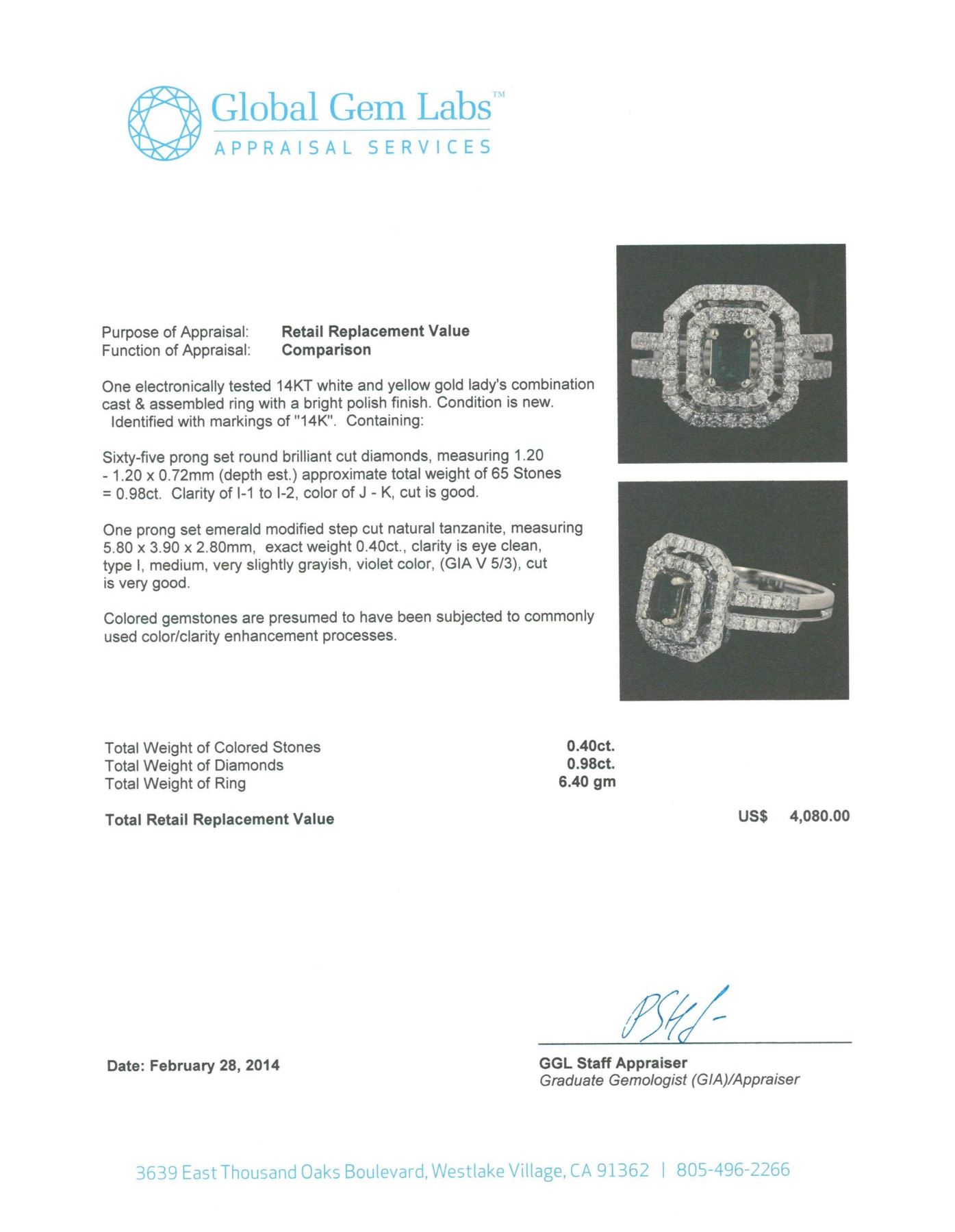 One electronically tested 14KT white and yellow gold Ladies combination cast & assembled ring with a bright polish finish. Condition is new. Identified with markings of "14K". Containing: Sixty-Five prong set round brilliant cut diamonds, measuring 1.20 - 1.20 x 0.72mm (depth est.) approximate. Total Weight of 65 Stones = 0.98ct. Clarity: I-1 to I-2. Color: J - K, Cut is Good. One prong set emerald modified step cut natural tanzanite, measuring 5.80 x 3.90 x 2.80mm, exact weight 0.40 ct., clarity is eye clean, type I, medium, very slightly grayish, violet color, (GIA V 5/3), cut is very good. Colored gemstones are presumed to have been subjected to commonly used color/clarity enhancement processes. Total Weight of Colored Stones 0.40 ct. Total Weight of Diamonds 0.98ct. Total Weight of Ring 6.40 grams. GGL Appraised.