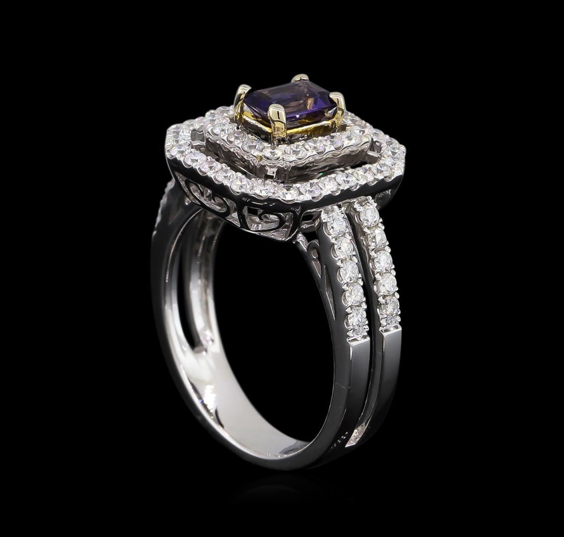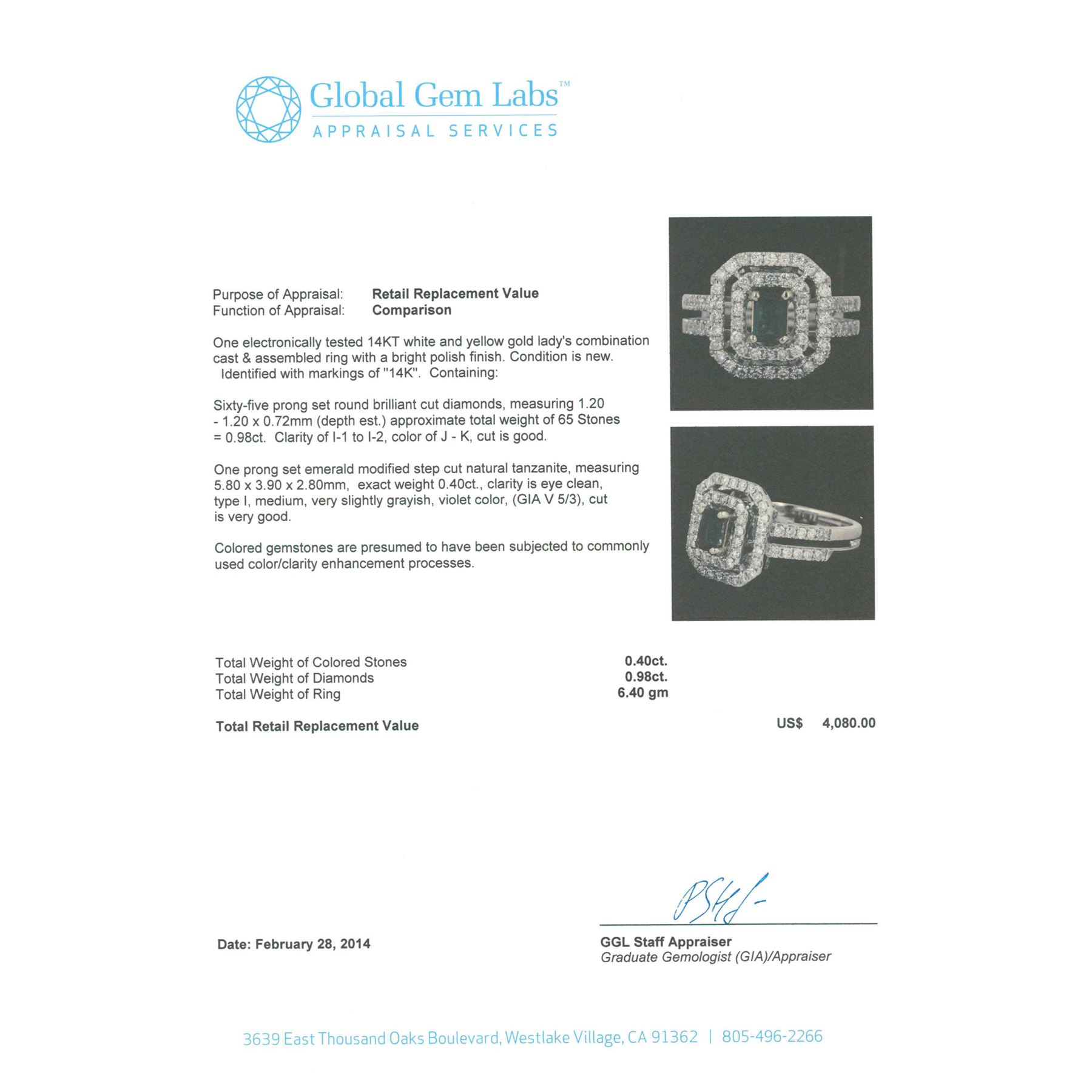 One electronically tested 14KT white and yellow gold Ladies combination cast & assembled ring with a bright polish finish. Condition is new. Identified with markings of "14K". Containing: Sixty-Five prong set round brilliant cut diamonds, measuring 1.20 - 1.20 x 0.72mm (depth est.) approximate. Total Weight of 65 Stones = 0.98ct. Clarity: I-1 to I-2. Color: J - K, Cut is Good. One prong set emerald modified step cut natural tanzanite, measuring 5.80 x 3.90 x 2.80mm, exact weight 0.40 ct., clarity is eye clean, type I, medium, very slightly grayish, violet color, (GIA V 5/3), cut is very good. Colored gemstones are presumed to have been subjected to commonly used color/clarity enhancement processes. Total Weight of Colored Stones 0.40 ct. Total Weight of Diamonds 0.98ct. Total Weight of Ring 6.40 grams. GGL Appraised.
