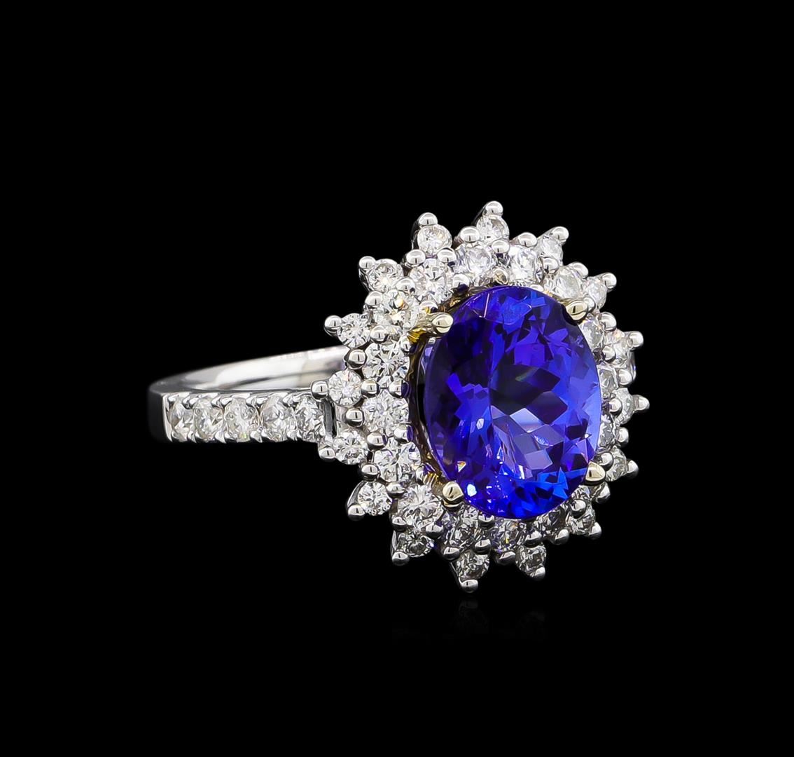 One electronically tested 14KT white and yellow gold Ladies combination cast & assembled ring with a bright polish finish. Condition is new. Identified with markings of "14K". Containing: One prong set oval modified brilliant cut natural tanzanite, measuring 10.10 x 7.50 x 4.88mm, exact weight 2.83ct., clarity is eye clean, type I, medium, very slightly grayish, bluish violet color, (GIA bV 5/3), cut is very good. Colored gemstones are presumed to have been subjected to commonly used color/clarity enhancement processes. Twenty-Six prong set round brilliant cut diamonds, measuring 2.00 - 2.00 x 1.20mm (depth est.) approximate. Total Weight of 26 Stones = 0.89ct. Clarity: SI-1 to I-1. Color: H - I, Cut is Good. Sixteen prong set round brilliant cut diamonds, measuring 1.50 - 1.50 x 0.90mm (depth est.) approximate. Total Weight of 16 Stones = 0.24ct. Clarity: I-1 to I-2. Color: I - J, Cut is Good. Total Weight of Colored Stones 2.83ct. Total Weight of Diamonds 1.13ct. Total Weight of Ring 6.10 grams. GGL Appraised at $8,585.00.