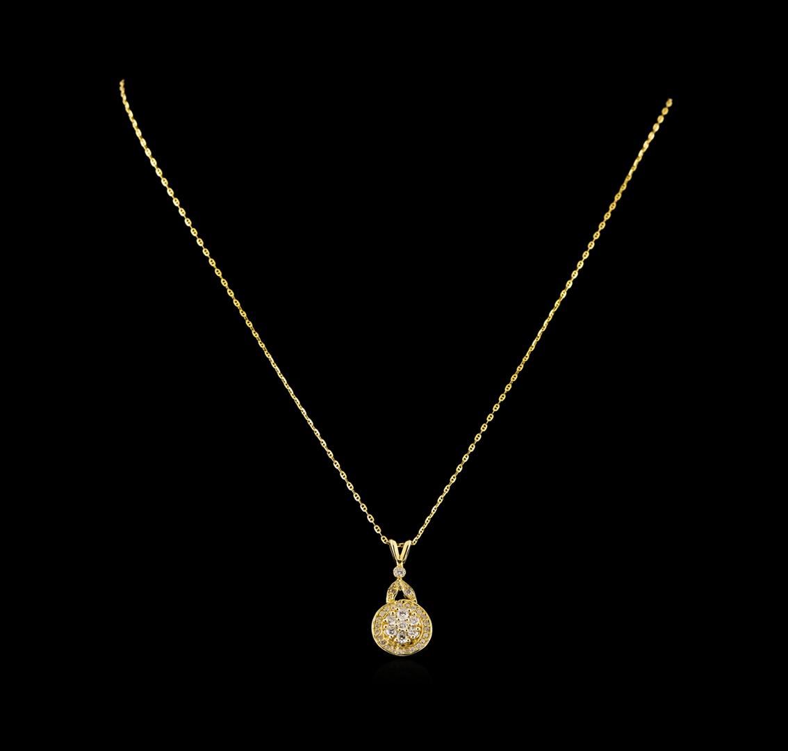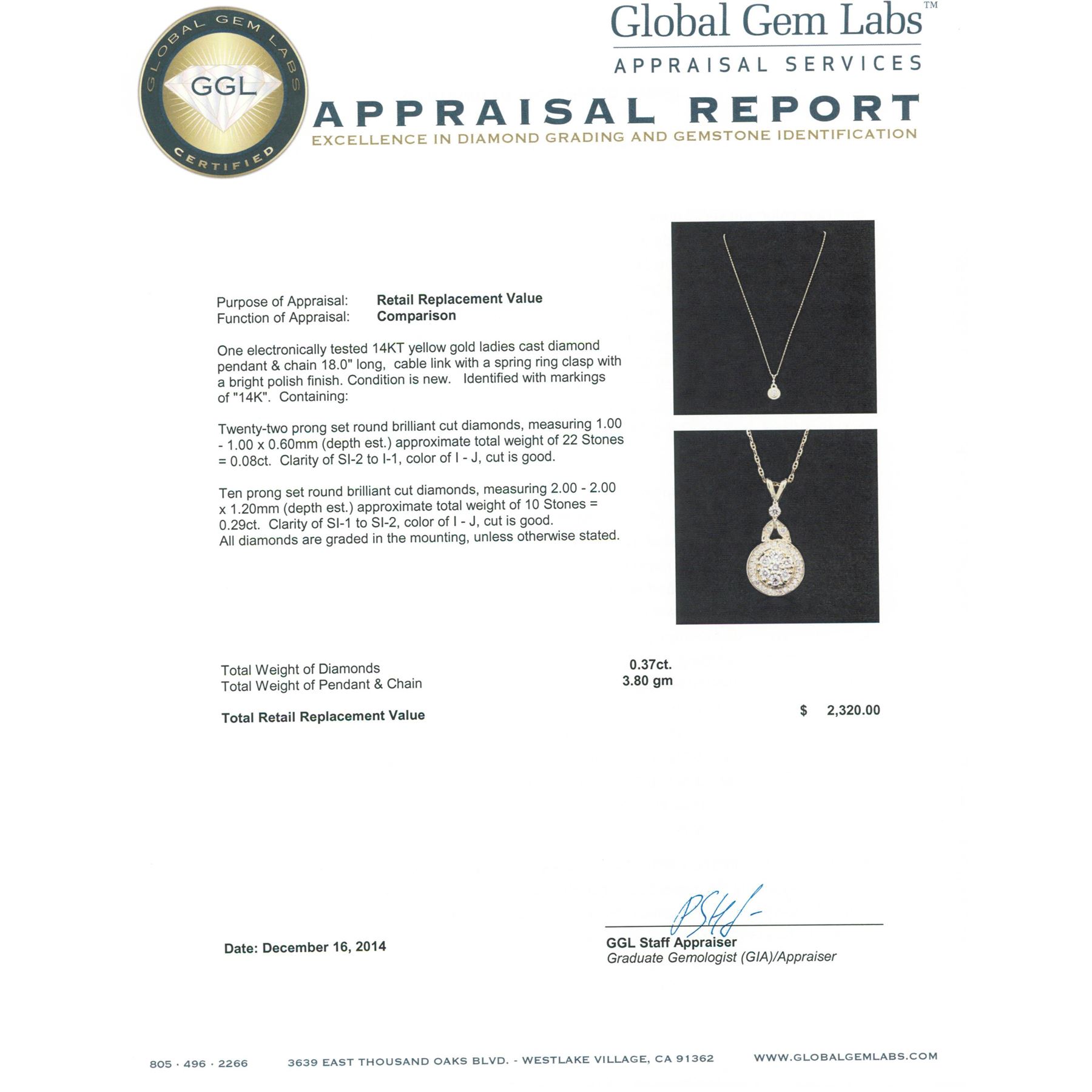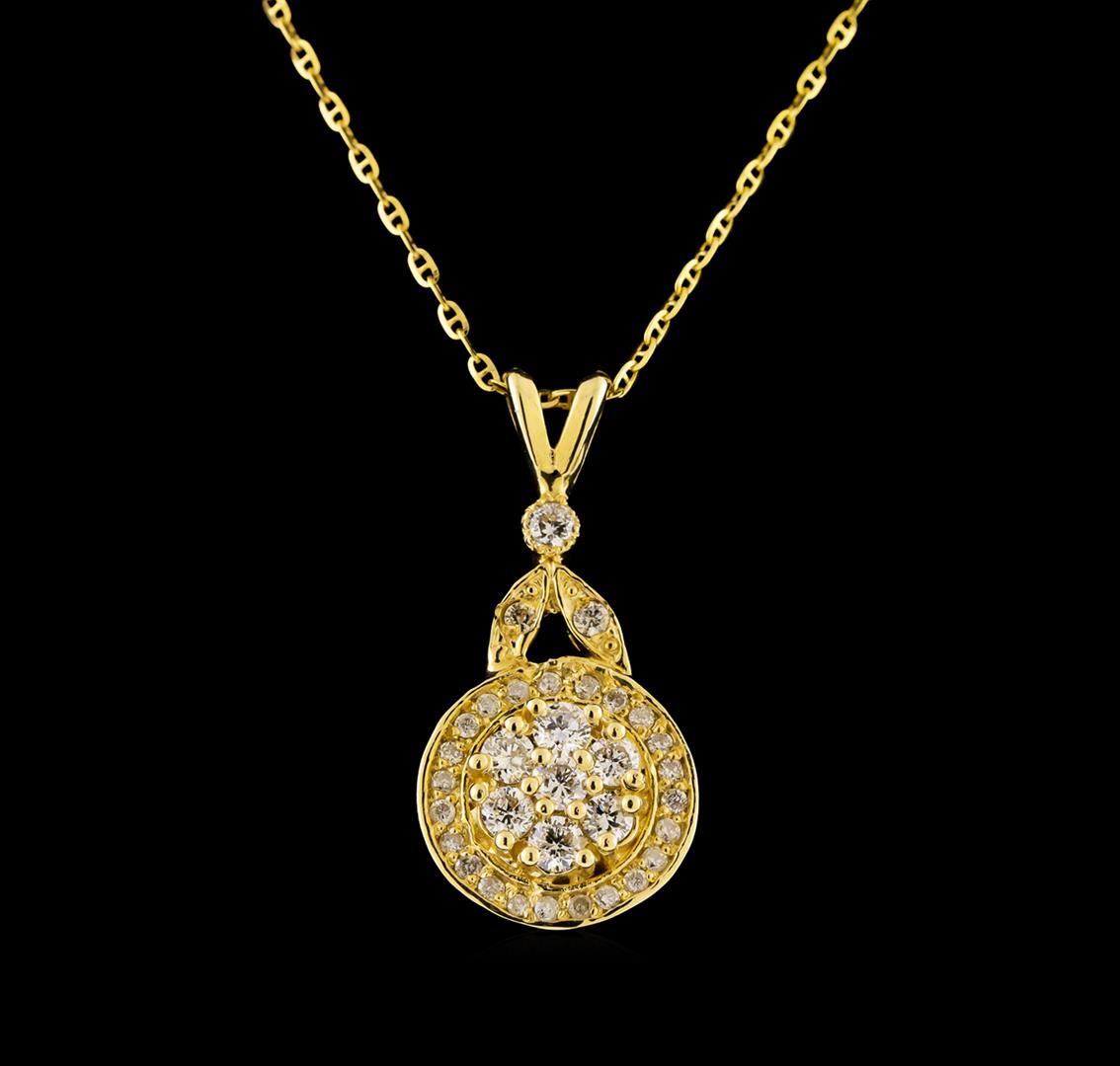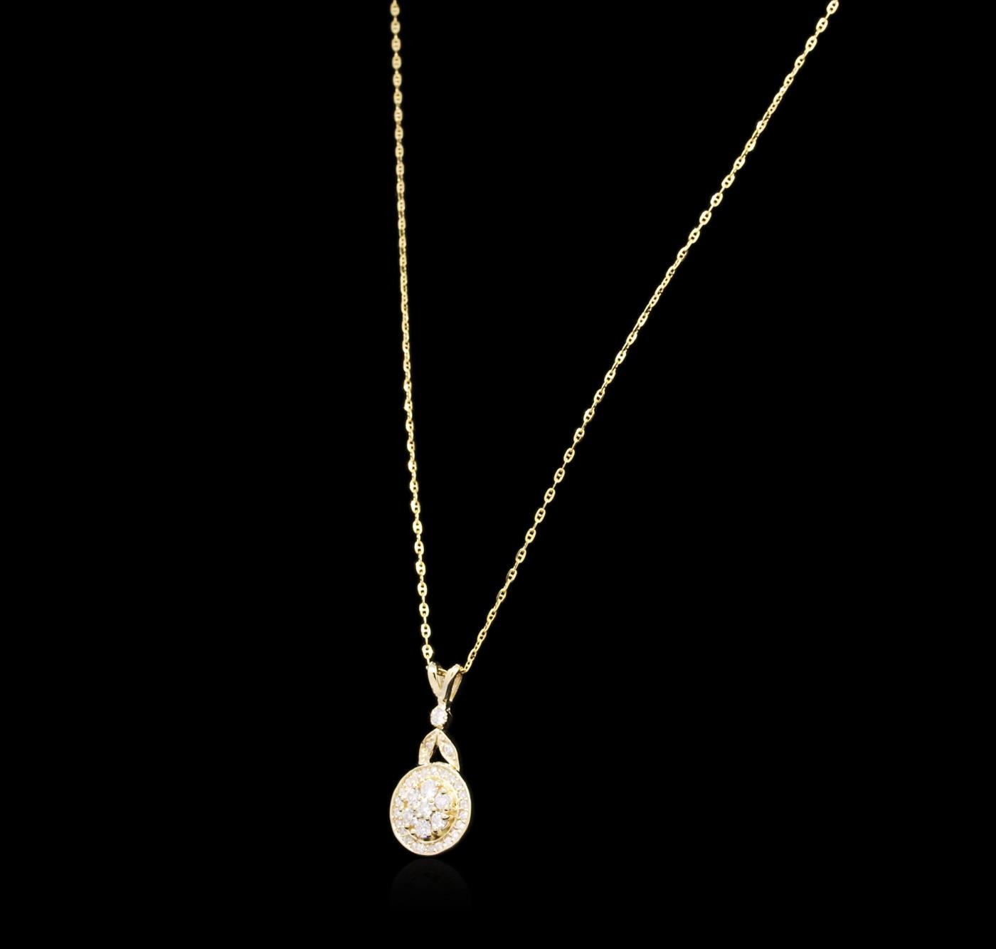 One electronically tested 14KT yellow gold ladies cast diamond pendant & chain 18.0" long, cable link with a spring ring clasp with a bright polish finish. Identified with markings of "14K". Condition is new. Containing: Twenty-Two prong set round brilliant cut diamonds, measuring 1.00 - 1.00 x 0.60mm (depth est.) approximate total weight of 22 Stones = 0.08ct. Clarity: SI-2 to I-1. Color: I - J, Cut is Good. Ten prong set round brilliant cut diamonds, measuring 2.00 - 2.00 x 1.20mm (depth est.) approximate total weight of 10 Stones = 0.29ct. Clarity: SI-1 to SI-2. Color: I - J, Cut is Good. All diamonds are graded in the mounting, unless otherwise stated. Total Weight of Diamonds 0.37ct. Total Weight of Pendant & Chain 3.80 grams. GGL Appraised.