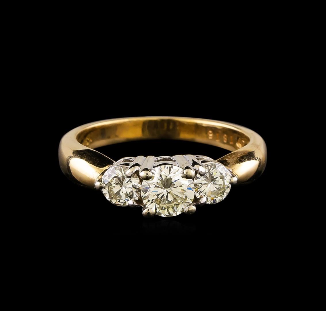 One electronically tested 14KT yellow gold ladies combination cast & assembled engagement ring with a bright polish finish. Identified with markings of "14K". Condition is very good. Containing: One prong set round brilliant cut diamond, measuring 5.16 - 5.13 x 3.09mm (depth est.) approximate weight of 0.50ct. Clarity: SI-2. Color: K, Cut is Good. Two prong set round brilliant cut diamonds, measuring 3.86 - 3.86 x 2.01mm (depth est.) approximate total weight of 2 Stones = 0.47ct. Clarity: SI-1 to SI-2. Color: J, Cut is Good. All diamonds are graded in the mounting, unless otherwise stated. Total Weight of Diamonds 0.97ct. Total Weight of Ring 4.20 grams. GGL Appraised at $5,535.00.