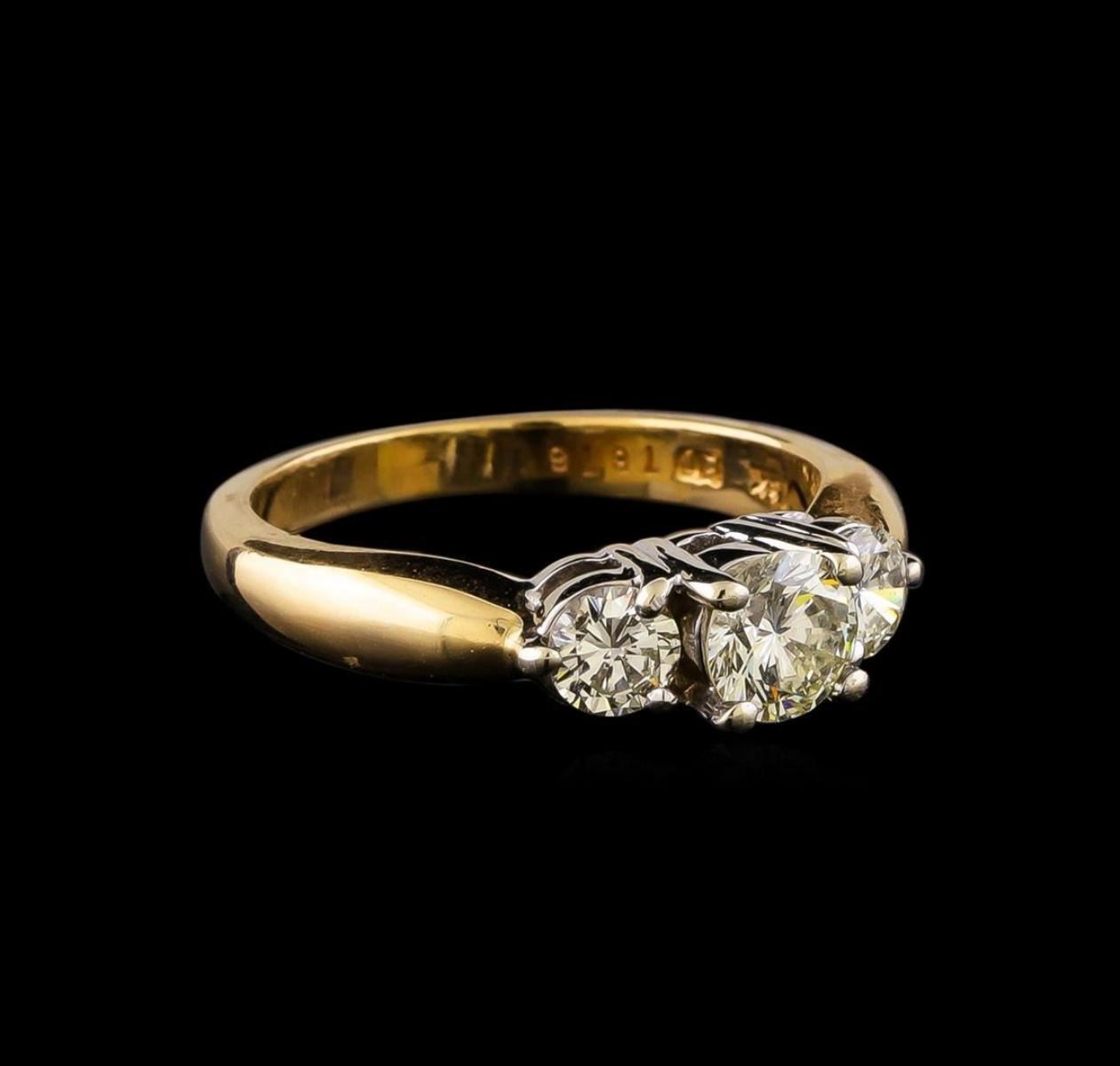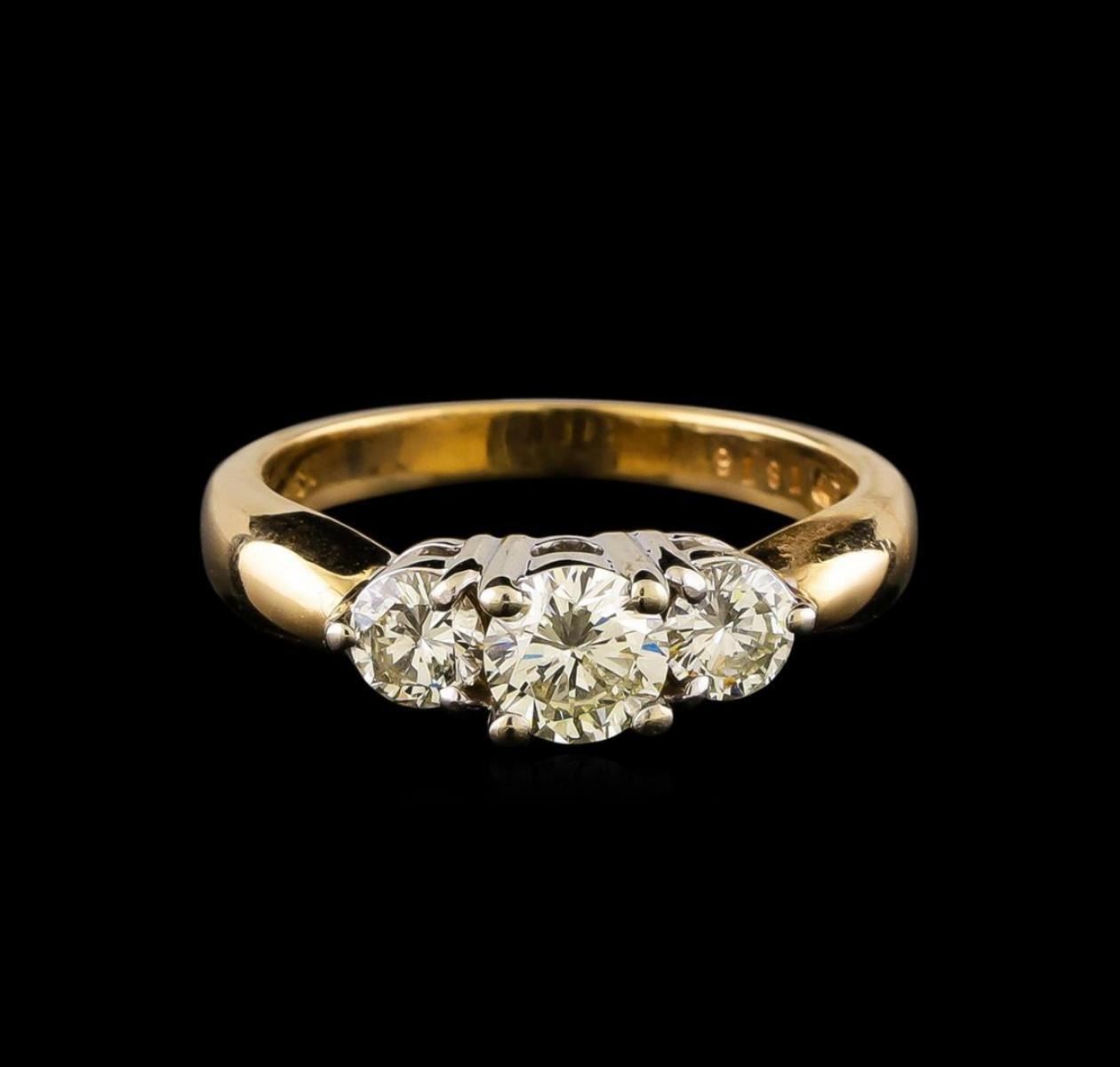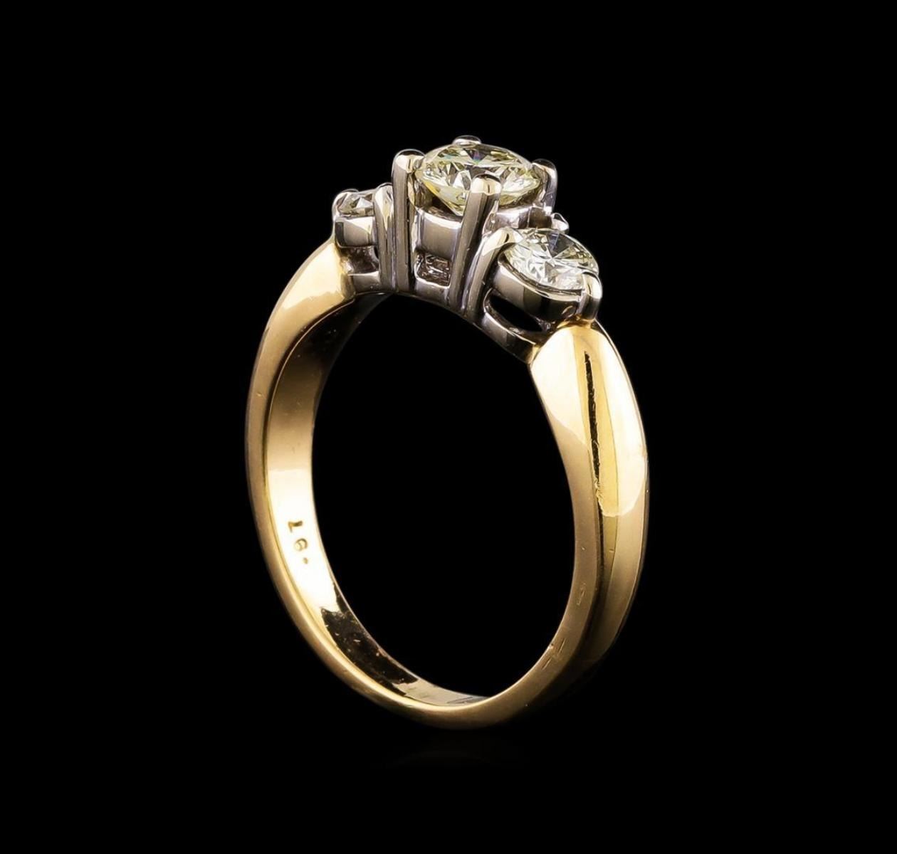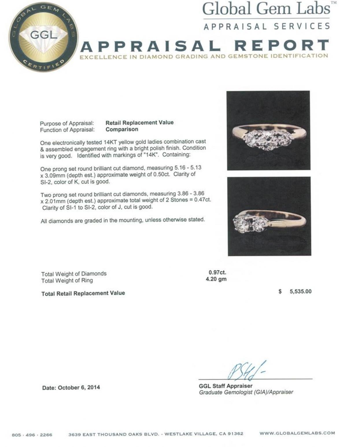 One electronically tested 14KT yellow gold ladies combination cast & assembled engagement ring with a bright polish finish. Identified with markings of "14K". Condition is very good. Containing: One prong set round brilliant cut diamond, measuring 5.16 - 5.13 x 3.09mm (depth est.) approximate weight of 0.50ct. Clarity: SI-2. Color: K, Cut is Good. Two prong set round brilliant cut diamonds, measuring 3.86 - 3.86 x 2.01mm (depth est.) approximate total weight of 2 Stones = 0.47ct. Clarity: SI-1 to SI-2. Color: J, Cut is Good. All diamonds are graded in the mounting, unless otherwise stated. Total Weight of Diamonds 0.97ct. Total Weight of Ring 4.20 grams. GGL Appraised.
