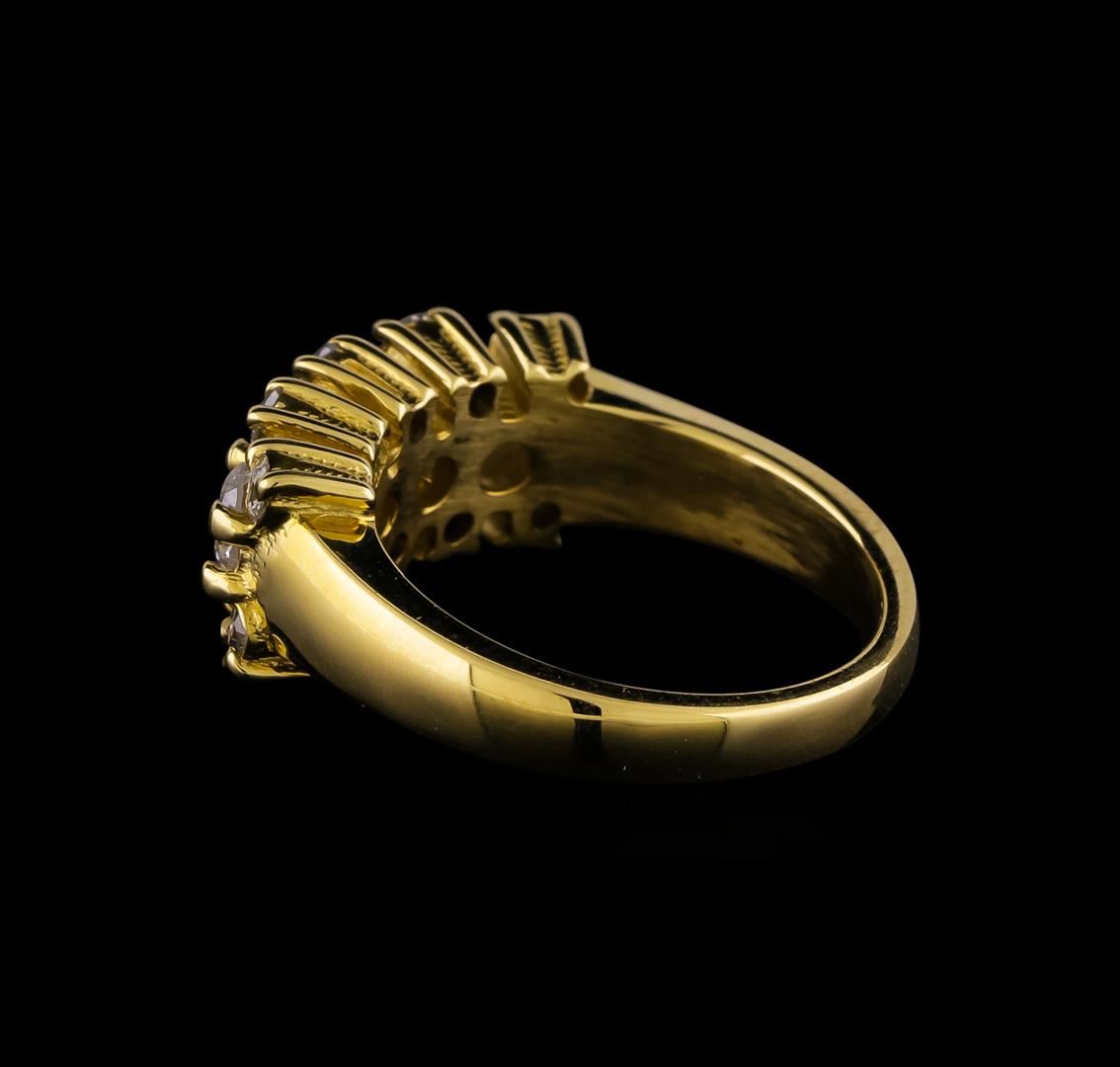 One electronically tested 14KT yellow gold ladies combination cast & assembled diamond ring with a bright polish finish. Identified with markings of "14K". Condition is new. Containing: Four prong set round brilliant cut diamonds, measuring 3.50 - 3.50 x 2.10mm (depth est.) approximate total weight of 4 Stones = 0.63ct. Clarity: I-2. Color: K, Cut is Good. Ten prong set round brilliant cut diamonds, measuring 2.10 - 2.10 x 1.26mm (depth est.) approximate total weight of 10 Stones = 0.34ct. Clarity: I-1 to I-2. Color: K - L, Cut is Good. All diamonds are graded in the mounting, unless otherwise stated. Total Weight of Diamonds 0.97ct. Total Weight of Ring 6.50 grams. GGL Appraised.