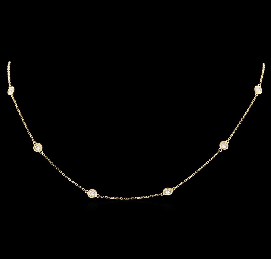 One electronically tested 14KT yellow gold ladies cast diamond necklace with a lobster claw clasp with a bright polish finish. Measurements: 18" in length Identified with markings of "K14". Condition is new. Containing: Ten bezel set round brilliant cut diamonds, measuring 3.00 - 3.00 x 1.80mm (depth est.) approximate total weight of 10 Stones = 0.99ct. Clarity: SI-1 to I-1. Color: K, Cut is Good. All diamonds are graded in the mounting, unless otherwise stated. Total Weight of Diamonds 0.99ct. Total Weight of Necklace 4.20 grams. GGL Appraised at $3,035.00.