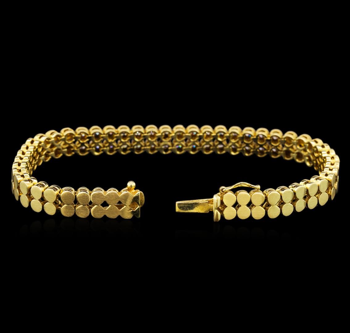 One electronically tested 14KT yellow gold ladies cast & assembled diamond bracelet with a bright polish finish. The seven inch wearable length bracelet features a double diamond set ribbon transitioning into matching yellow gold links, terminating in a concealed clasp with safety. Identified with markings of "14K". Condition is new, good workmanship. Containing: Thirty bezel set round brilliant cut diamonds, measuring 2.10 - 2.00 x 1.23mm (depth est.) approximate total weight of 30 Stones = 1.04ct. Graded in the setting. Clarity: SI-1 to I-1. Color: H - J. Total Weight of Diamonds 1.04ct. Total Weight of Bracelet 21.62 grams. AIG Appraised.