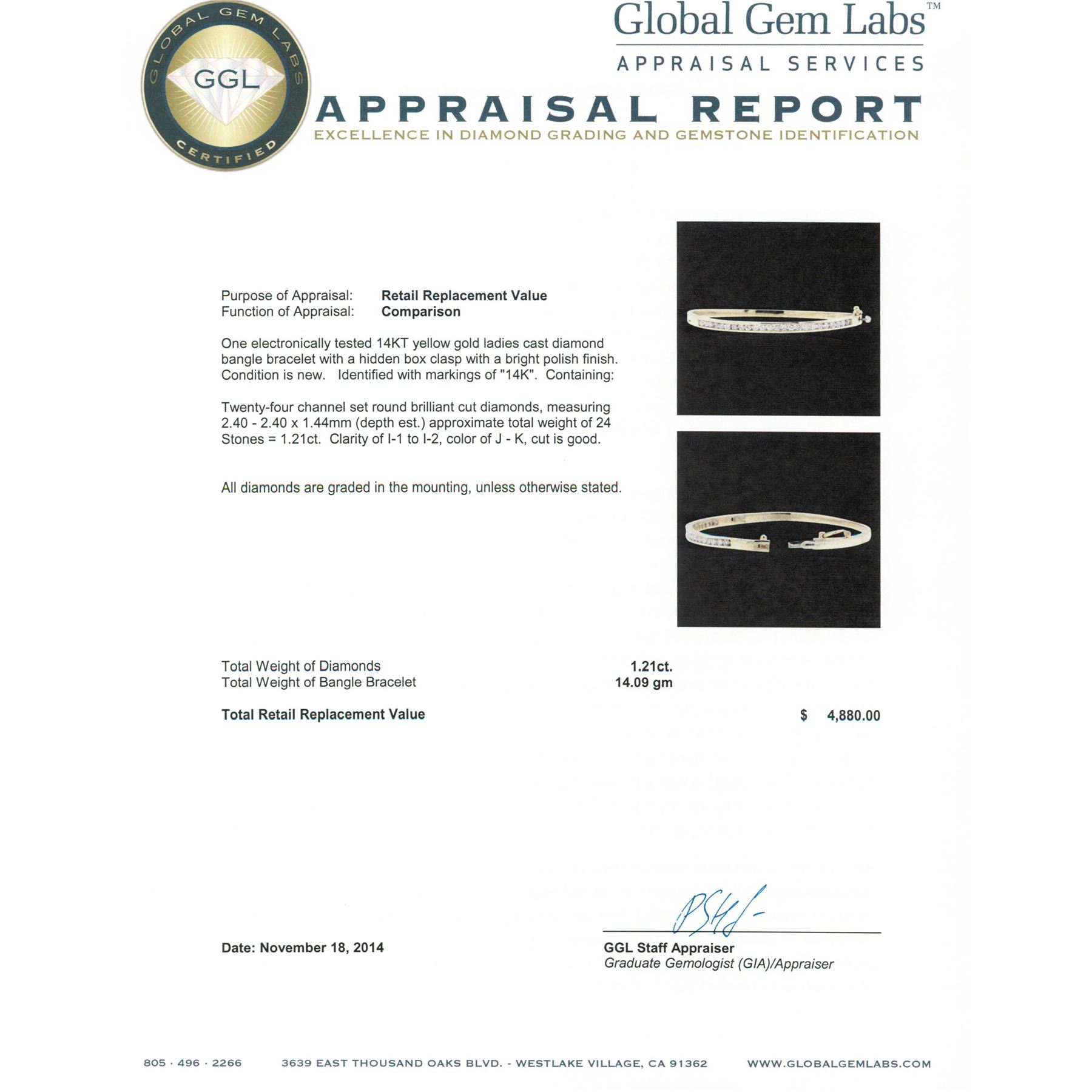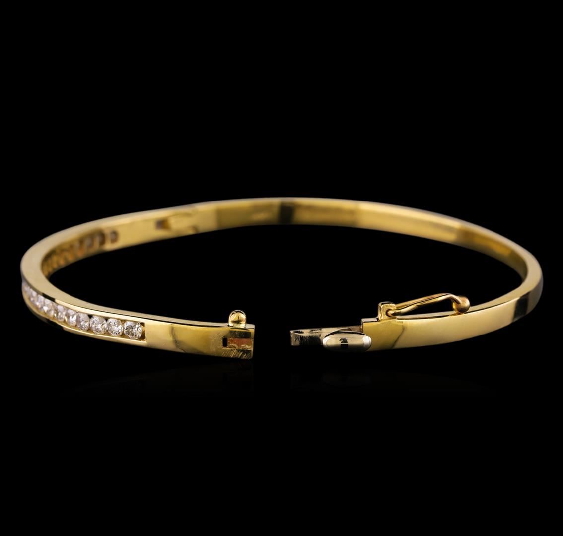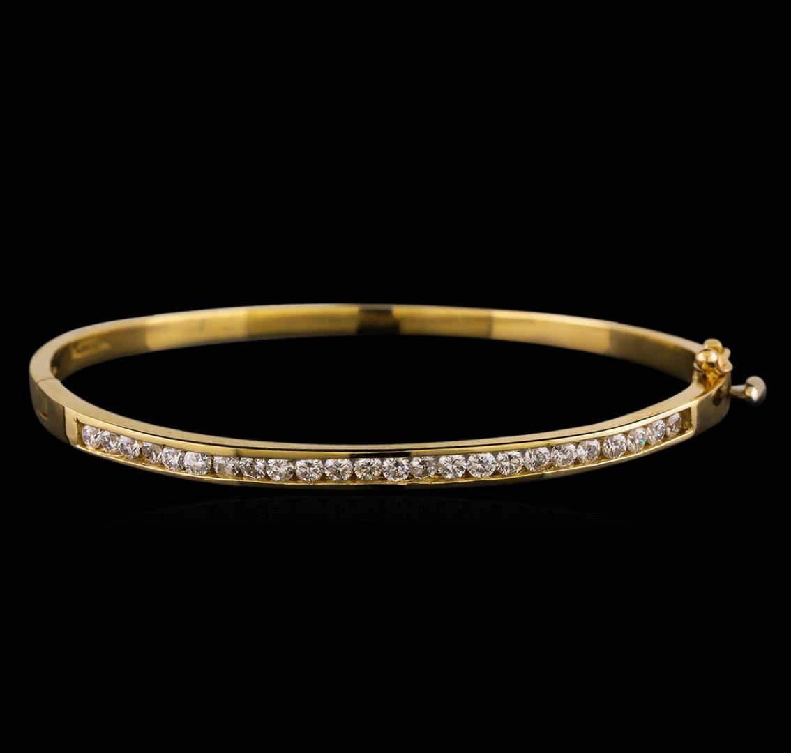 One electronically tested 14KT yellow gold ladies cast diamond bangle bracelet with a hidden box clasp with a bright polish finish. Identified with markings of "14K". Condition is new. Containing: Twenty-Four channel set round brilliant cut diamonds, measuring 2.40 - 2.40 x 1.44mm (depth est.) approximate total weight of 24 Stones = 1.21ct. Clarity: I-1 to I-2. Color: J - K, Cut is Good. All diamonds are graded in the mounting, unless otherwise stated. Total Weight of Diamonds 1.21ct. Total Weight of Bangle Bracelet 14.09 grams. GGL Appraised.
