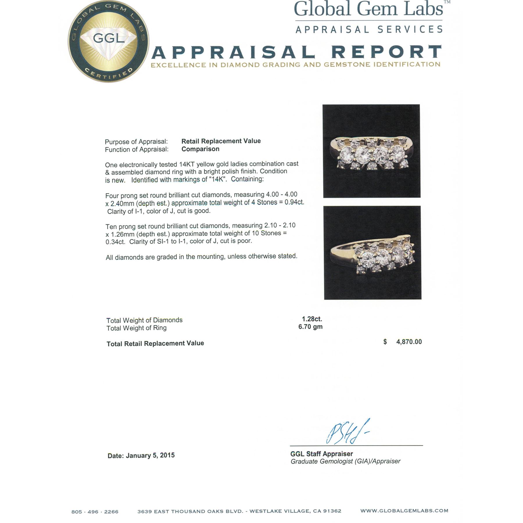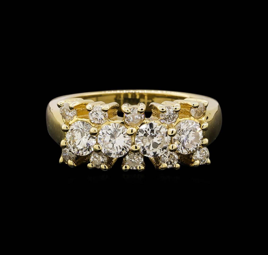 One electronically tested 14KT yellow gold ladies combination cast & assembled diamond ring with a bright polish finish. Identified with markings of "14K". Condition is new. Containing: Four prong set round brilliant cut diamonds, measuring 4.00 - 4.00 x 2.40mm (depth est.) approximate total weight of 4 Stones = 0.94ct. Clarity: I-1. Color: J, Cut is Good. Ten prong set round brilliant cut diamonds, measuring 2.10 - 2.10 x 1.26mm (depth est.) approximate total weight of 10 Stones = 0.34ct. Clarity: SI-1 to I-1. Color: J, Cut is Poor. All diamonds are graded in the mounting, unless otherwise stated. Total Weight of Diamonds 1.28ct. Total Weight of Ring 6.70 grams. GGL Appraised.