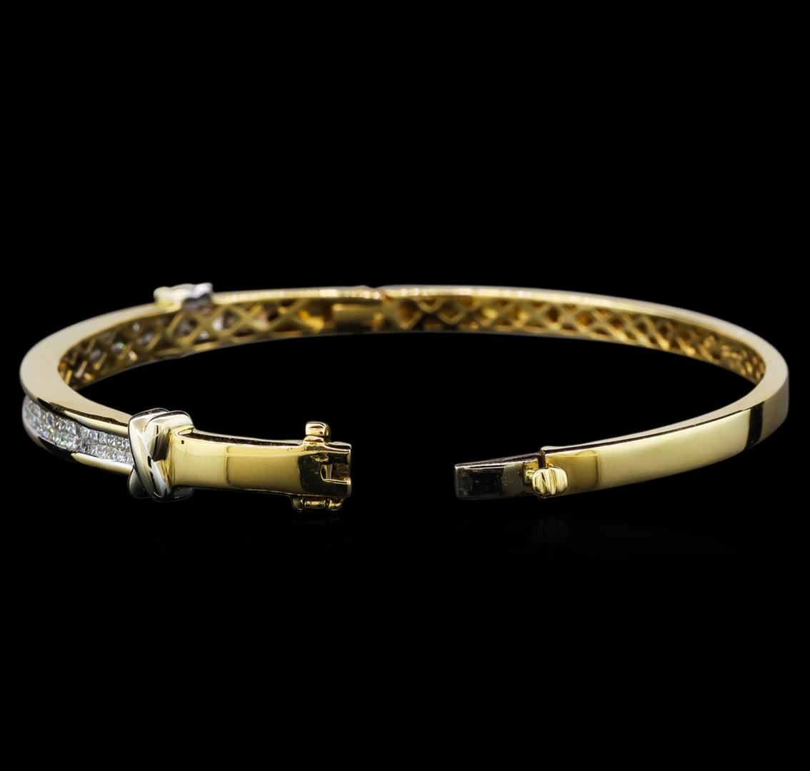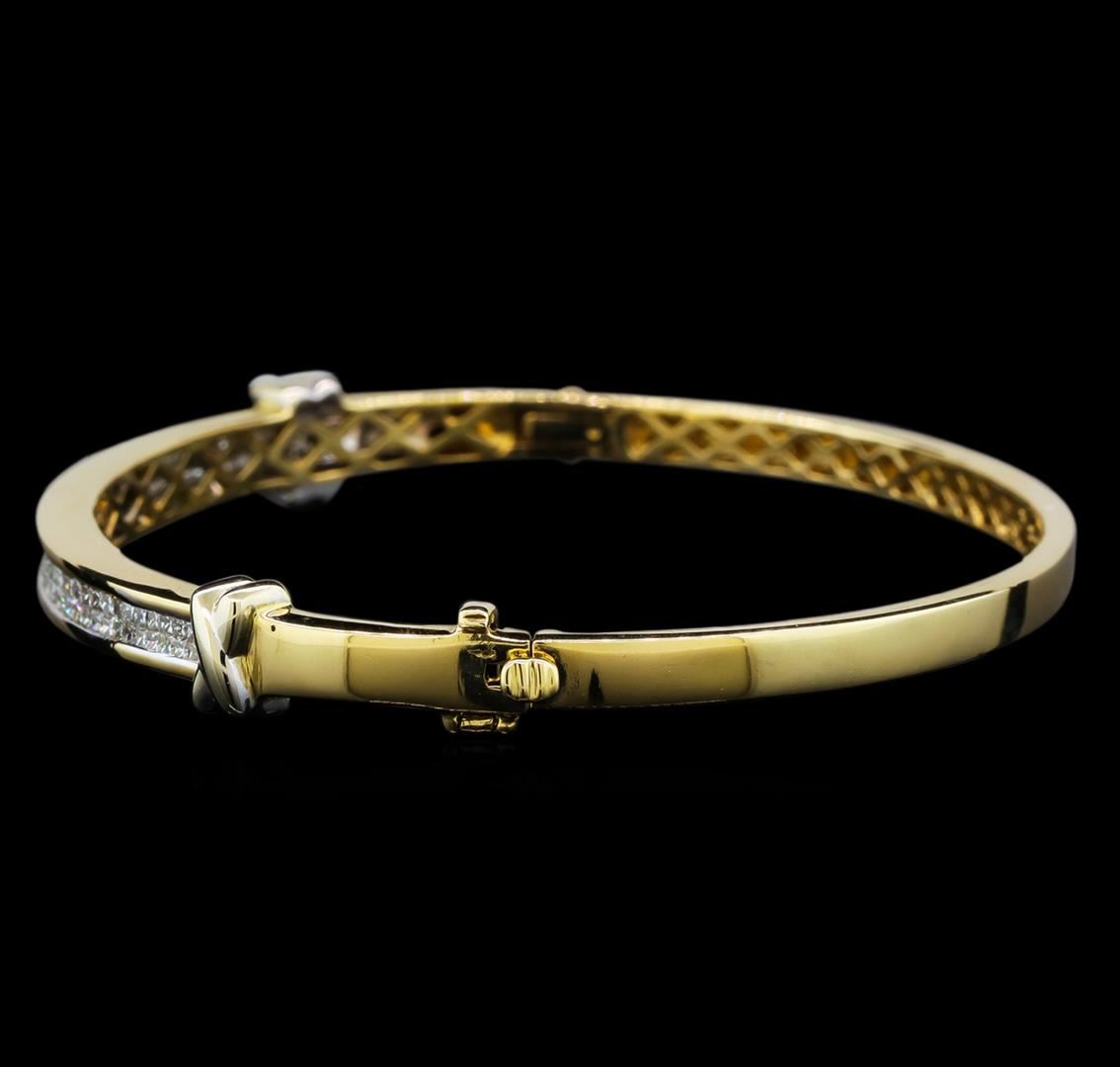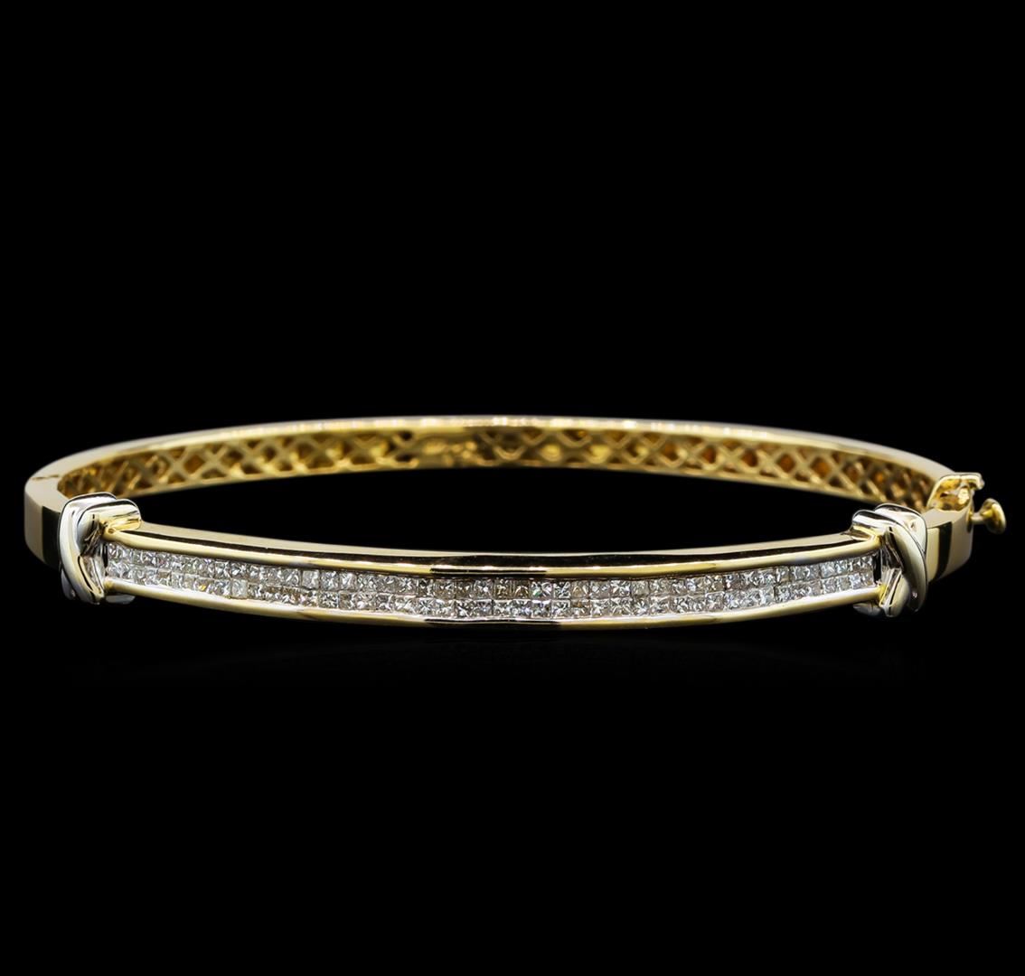 One electronically tested 14KT yellow gold ladies cast diamond bangle bracelet with a hidden box clasp with safety closer with a bright polish finish. Condition is very good. Containing: One Hundred Ten invisible set princess cut diamonds, measuring 1.30 x 1.30 x 0.98mm (depth est.) approximate total weight of 110 Stones = 1.49ct. Clarity: I-1 to I-2. Color: I - J, Cut is Good. All diamonds are graded in the mounting, unless otherwise stated. Total Weight of Diamonds 1.49ct. Total Weight of Bangle Bracelet 17.30 grams. GGL Appraised at $4,685.00.