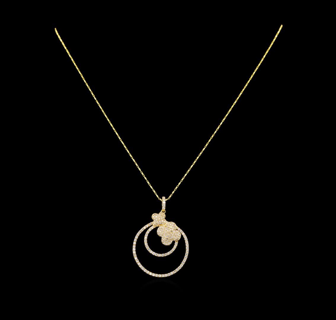One electronically tested 14KT yellow gold ladies cast & assembled diamond pendant with chain. The pendant features two diamond set circles with two diamond set clovers, completed by a diamond set bail. The pendant is supported by an eighteen inch length 14KT yellow gold designer style chain, terminating in a lobster claw clasp. Bright polish finish. Identified with markings of "14K". Condition is new, good workmanship. Containing: One Hundred Sixty prong set round brilliant cut diamonds, measuring 1.50 - 1.40 x 0.87mm (depth est.) approximate total weight of 160 Stones = 1.87ct. Graded in the setting. Clarity: SI-2 to I-2. Color: G - I. Total Weight of Diamonds 1.87ct. Total Weight of Pendant With Chain 9.05 grams. AIG Appraised at $6,345.00.