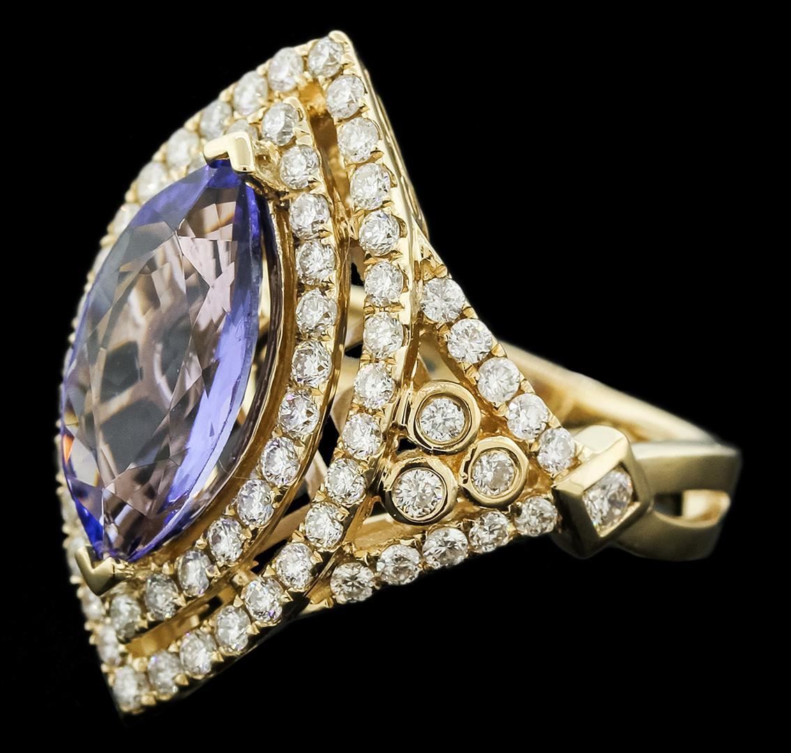 One electronically tested 14KT yellow gold ladies cast tanzanite and diamond ring with a bright polish finish. Identified with markings of "14K". Condition is new. Containing: One prong set marquise modified brilliant cut natural tanzanite, measuring 13.60 x 13.60 x 8.84mm, approximate weight of 10.41ct., clarity is eye clean, type I, medium light, moderately strong, violet color, (GIA V 4/4), cut is good. Eighty-Four prong set round brilliant cut diamonds, measuring 1.50 - 1.50 x 0.90mm (depth est.) approximate total weight of 84 Stones = 1.03ct. . Clarity: SI-2 to I-1. Color: I - J, Cut is Good. Colored gemstones are presumed to have been subjected to commonly used enhancement processes. All diamonds and colored gemstones are graded in the mounting, unless otherwise stated.. Total Weight of Colored Stones 10.41ct.. Total Weight of Diamonds 1.03ct.. Total Weight of Ring 7.80 grams. GGL Appraised.