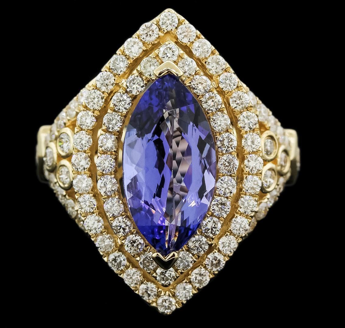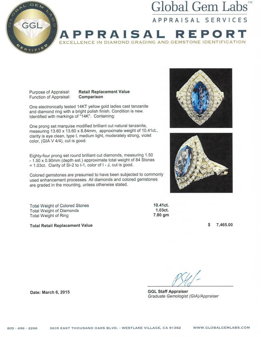 One electronically tested 14KT yellow gold ladies cast tanzanite and diamond ring with a bright polish finish. Identified with markings of "14K". Condition is new. Containing: One prong set marquise modified brilliant cut natural tanzanite, measuring 13.60 x 13.60 x 8.84mm, approximate weight of 10.41ct., clarity is eye clean, type I, medium light, moderately strong, violet color, (GIA V 4/4), cut is good. Eighty-Four prong set round brilliant cut diamonds, measuring 1.50 - 1.50 x 0.90mm (depth est.) approximate total weight of 84 Stones = 1.03ct. . Clarity: SI-2 to I-1. Color: I - J, Cut is Good. Colored gemstones are presumed to have been subjected to commonly used enhancement processes. All diamonds and colored gemstones are graded in the mounting, unless otherwise stated.. Total Weight of Colored Stones 10.41ct.. Total Weight of Diamonds 1.03ct.. Total Weight of Ring 7.80 grams. GGL Appraised.