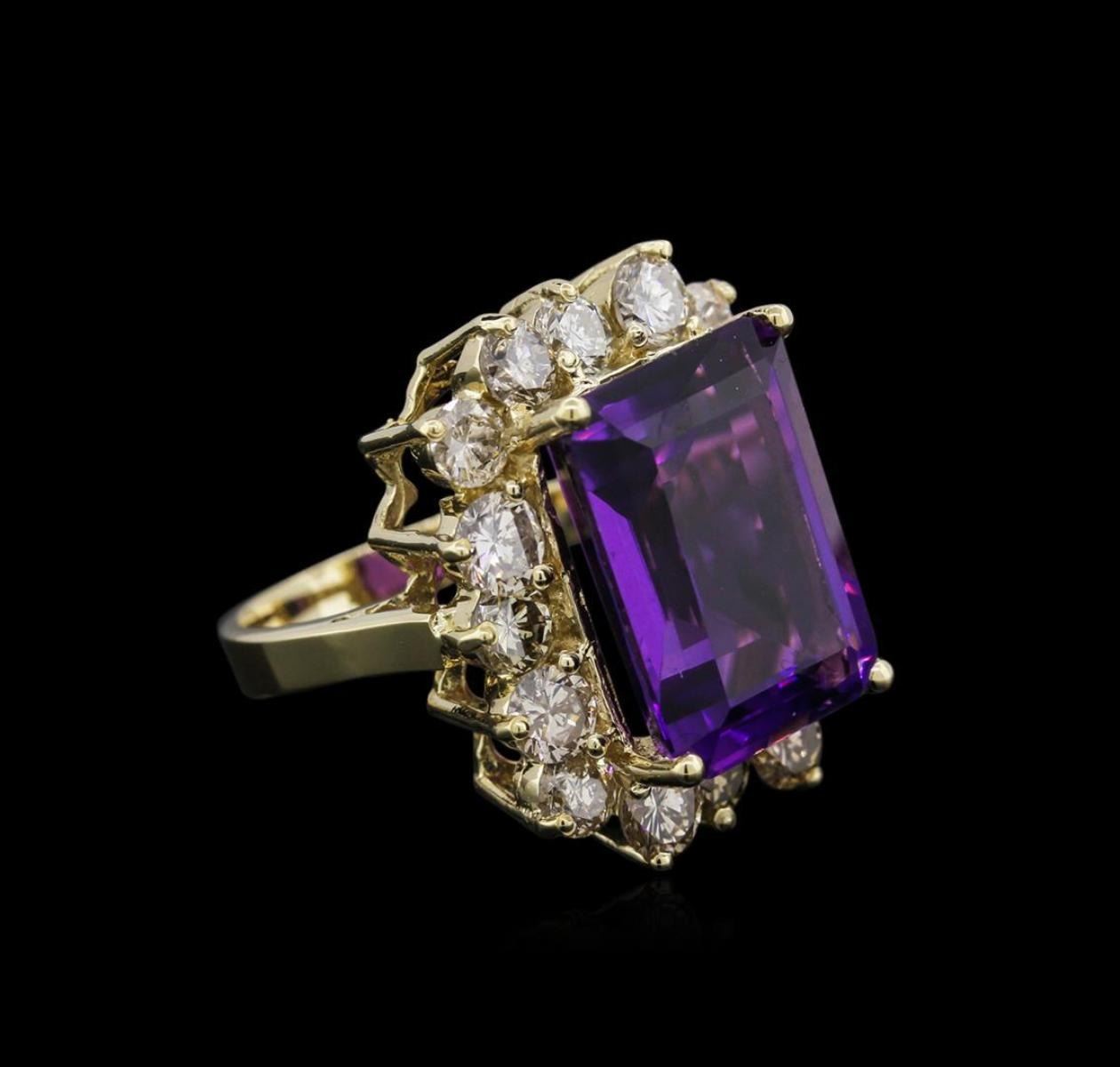 One electronically tested 14KT yellow gold ladies cast amethyst and diamond ring with a cathedral shank with a bright polish finish. Identified with markings of "K14". Condition is new. Containing: One prong set emerald modified step cut natural amethyst, measuring 16.17 x 11.93 x 7.60mm, approximate weight of 10.53ct., clarity is eye clean, type II, medium, moderately strong, purple color, (GIA P 5/4), cut is good. Sixteen prong set round brilliant cut diamonds, measuring 3.80 - 3.80 x 2.28mm (depth est.) approximate total weight of 16 Stones = 3.21ct. Clarity: I-1 to I-2. Color: L - M, Cut is Good. Diamonds and colored gemstones are graded in the mounting, unless otherwise stated. Colored gemstones are presumed to have been subjected to commonly used enhancement processes. Total Weight of Colored Stones 10.53ct. Total Weight of Diamonds 3.21ct. Total Weight of Ring 10.50 grams. GGL Appraised.