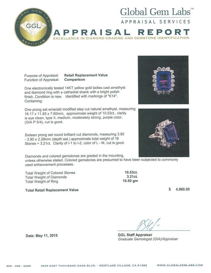 One electronically tested 14KT yellow gold ladies cast amethyst and diamond ring with a cathedral shank with a bright polish finish. Identified with markings of "K14". Condition is new. Containing: One prong set emerald modified step cut natural amethyst, measuring 16.17 x 11.93 x 7.60mm, approximate weight of 10.53ct., clarity is eye clean, type II, medium, moderately strong, purple color, (GIA P 5/4), cut is good. Sixteen prong set round brilliant cut diamonds, measuring 3.80 - 3.80 x 2.28mm (depth est.) approximate total weight of 16 Stones = 3.21ct. Clarity: I-1 to I-2. Color: L - M, Cut is Good. Diamonds and colored gemstones are graded in the mounting, unless otherwise stated. Colored gemstones are presumed to have been subjected to commonly used enhancement processes. Total Weight of Colored Stones 10.53ct. Total Weight of Diamonds 3.21ct. Total Weight of Ring 10.50 grams. GGL Appraised.