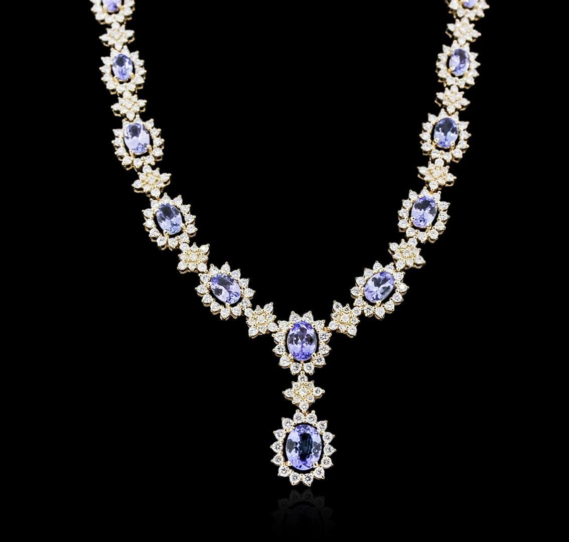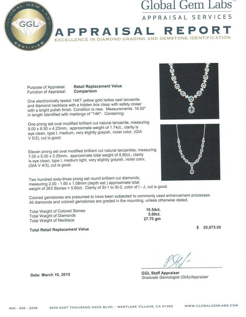 One electronically tested 14KT yellow gold ladies cast tanzanite and diamond necklace with a hidden box clasp with safety closer with a bright polish finish. Measurements: 16.50" in length Identified with markings of "14K". Condition is new. Containing: One prong set oval modified brilliant cut natural tanzanite, measuring 9.00 x 6.50 x 4.23mm, approximate weight of 1.74ct., clarity is eye clean, type I, medium, very slightly grayish, violet color, (GIA V 5/3), cut is good. Eleven prong set oval modified brilliant cut natural tanzanites, measuring 7.00 x 5.00 x 3.25mm, approximate total weight of 8.80ct., clarity is eye clean, type I, medium light, very slightly grayish, violet color, (GIA V 4/3), cut is good. Two Hundred Sixty-Three prong set round brilliant cut diamonds, measuring 2.00 - 1.60 x 1.08mm (depth est.) approximate total weight of 263 Stones = 5.60ct. Clarity: SI-1 to SI-2. Color: I - J, Cut is Good. Colored gemstones are presumed to have been subjected to commonly used enhancement processes. All diamonds and colored gemstones are graded in the mounting, unless otherwise stated. Total Weight of Colored Stones 10.54ct. Total Weight of Diamonds 5.60ct. Total Weight of Necklace 27.70 grams. GGL Appraised.