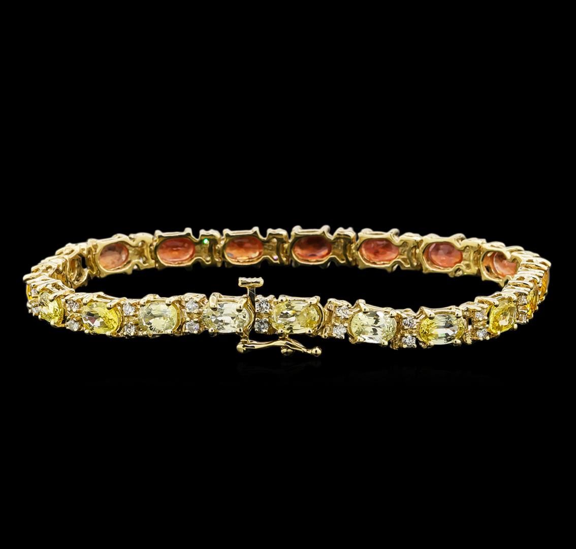 One electronically tested 14KT yellow gold ladies cast sapphire and diamond bracelet with a hidden box clasp with safety closer with a bright polish finish. Measurements: 7" in length Identified with markings of "14K". Condition is new. Containing: Eleven prong set oval modified brilliant cut natural yellow sapphires, measuring 5.90 x 4.20 x 2.74mm, approximate total weight of 6.27ct., clarity is eye clean, type II, medium light, brownish, yellow color, (GIA Y 4/3), cut is good. Eight prong set oval modified brilliant cut natural orange sapphires, measuring 5.90 x 4.20 x 2.73mm, approximate total weight of 4.56ct., clarity is slightly included, type II, medium, brownish, orange color, (GIA O 5/3), cut is good. Thirty-Eight prong set round brilliant cut diamonds, measuring 1.70 - 1.70 x 1.02mm (depth est.) approximate total weight of 38 Stones = 0.68ct. Clarity of SI-2 to I-1, Color of J - K, Cut is Good. Colored gemstones are presumed to have been subjected to commonly used enhancement processes. All diamonds and colored gemstones are graded in the mounting, unless otherwise stated. Total Weight of Colored Stones 10.83ct. Total Weight of Diamonds 0.68ct. Total Weight of Bracelet 13.80 grams. GGL Appraised at $4,785.00.