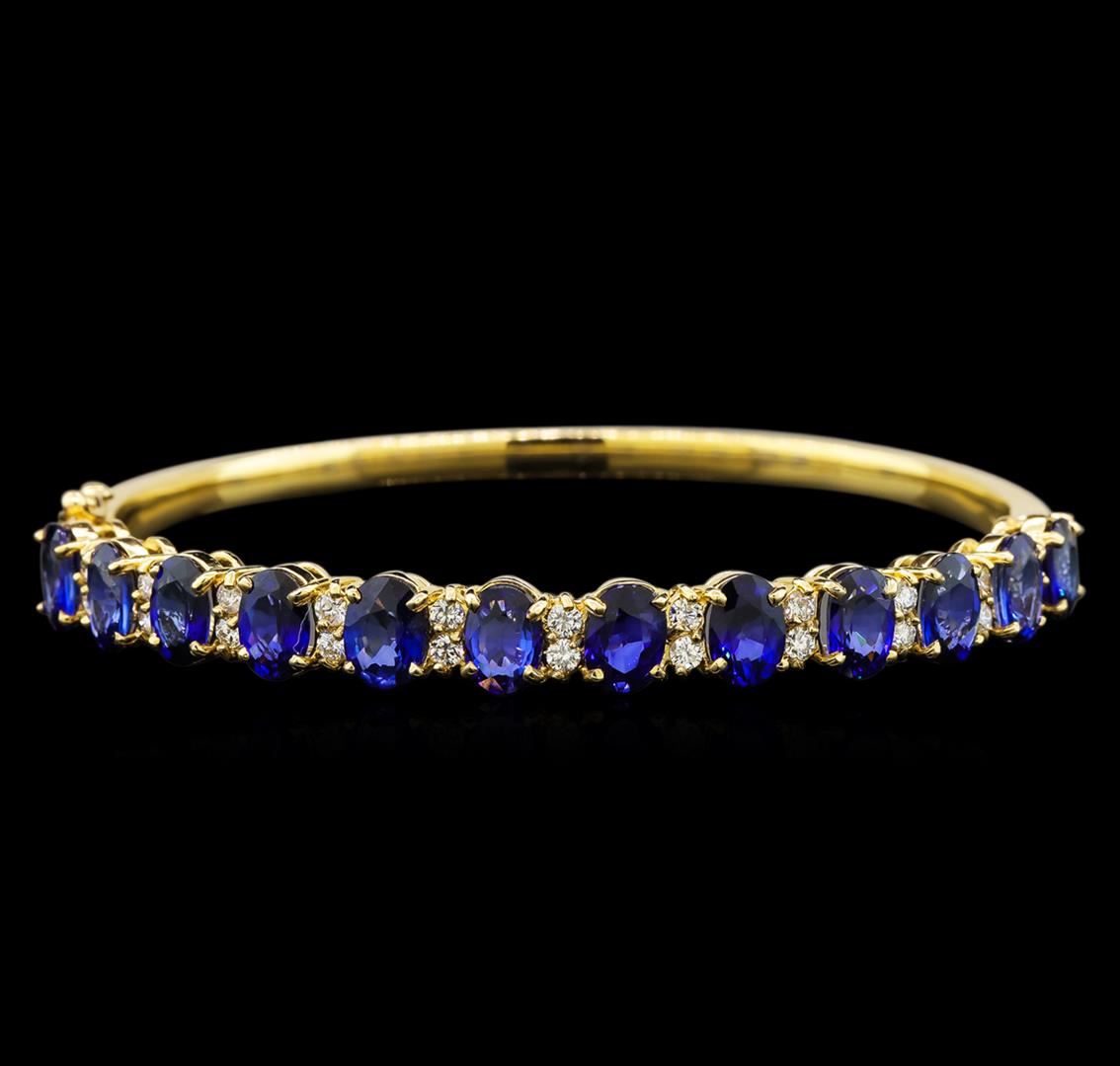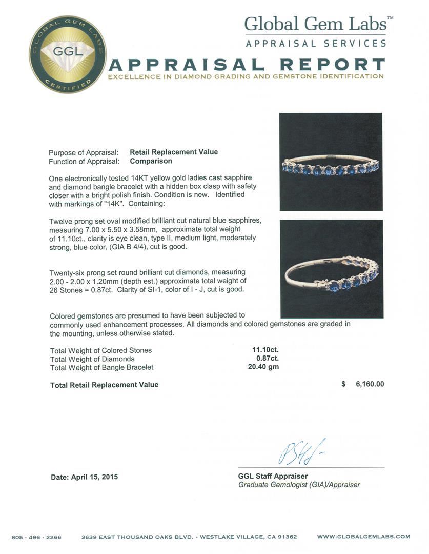 One electronically tested 14KT yellow gold ladies cast sapphire and diamond bangle bracelet with a hidden box clasp with safety closer with a bright polish finish. Identified with markings of "14K". Condition is new. Containing: Twelve prong set oval modified brilliant cut natural blue sapphires, measuring 7.00. x 5.50 x 3.58mm, approximate total weight of 11.10ct., clarity is eye clean, type II, medium light, moderately strong, blue color, (GIA B 4/4), cut is good. Twenty-Six prong set round brilliant cut diamonds, measuring 2.00. - 2.00. x 1.20mm (depth est.) approximate total weight of 26 Stones = 0.87ct. Clarity: SI-1. Color: I - J, Cut is Good. Colored gemstones are presumed to have been subjected to commonly used enhancement processes. All diamonds and colored gemstones are graded in the mounting, unless otherwise stated. Total Weight of Colored Stones 11.10ct. Total Weight of Diamonds 0.87ct. Total Weight of Bangle Bracelet 20.40 grams. GGL Appraised at $6,160.00.