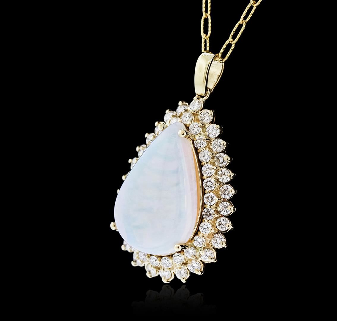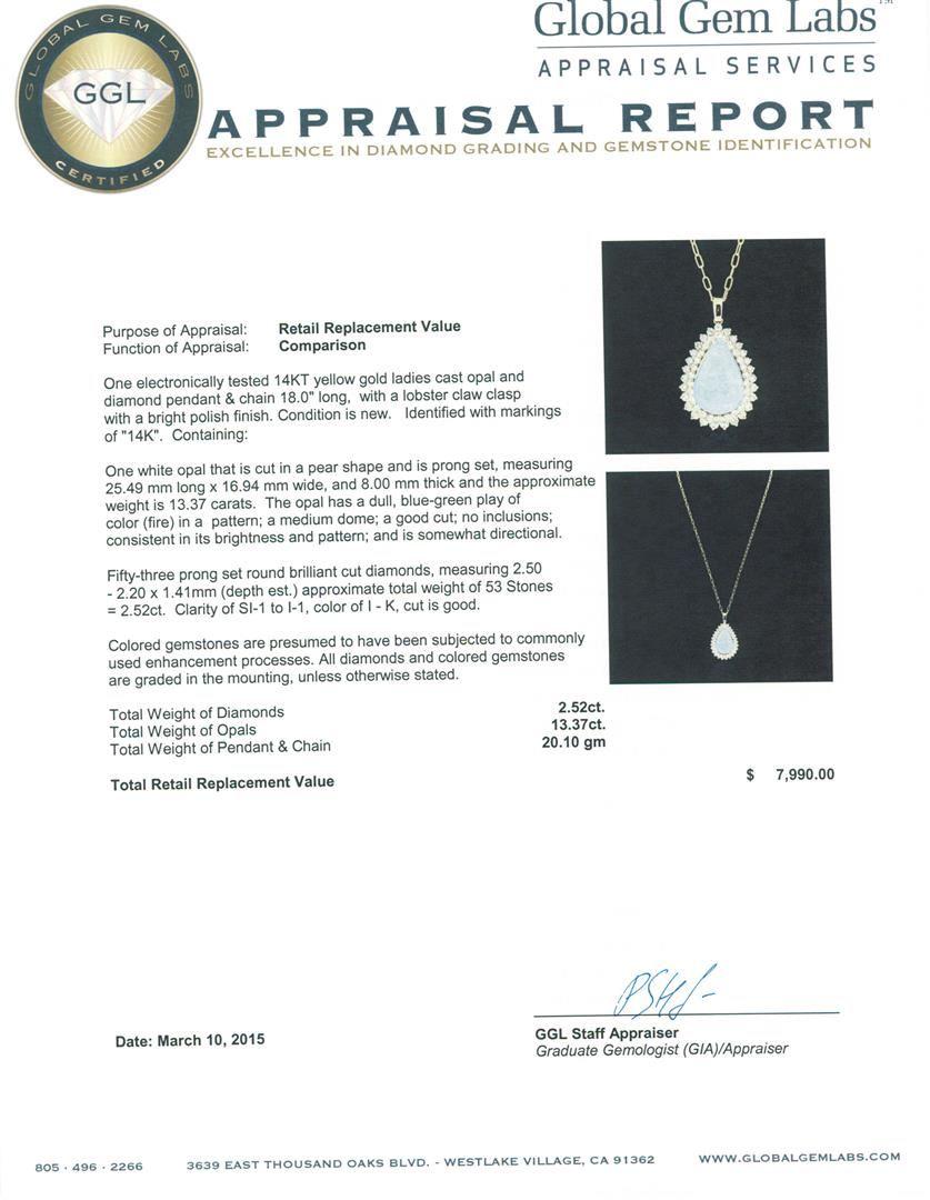 One electronically tested 14KT yellow gold ladies cast opal and diamond pendant & chain 18.0" long, with a lobster claw clasp with a bright polish finish. Identified with markings of "14K". Condition is new. Containing: One white opal that is cut in a pear shape and is prong set, measuring 25.49 mm long x 16.94 mm wide, and 8.00 mm thick and the approximate weight is 13.37 carats. The opal has a dull, blue-green play of color (fire) in a pattern; a medium dome; a good cut; no inclusions; consistent in its brightness and pattern; and is somewhat directional. Fifty-Three prong set round brilliant cut diamonds, measuring 2.50 - 2.20 x 1.41mm (depth est.) approximate total weight of 53 Stones = 2.52ct. Clarity: SI-1 to I-1. Color: I - K, Cut is Good. Colored gemstones are presumed to have been subjected to commonly used enhancement processes. All diamonds and colored gemstones are graded in the mounting, unless otherwise stated. Total Weight of Diamonds 2.52ct. Total Weight of Opals 13.37ct. Total Weight of Pendant & Chain 20.10 grams. GGL Appraised.