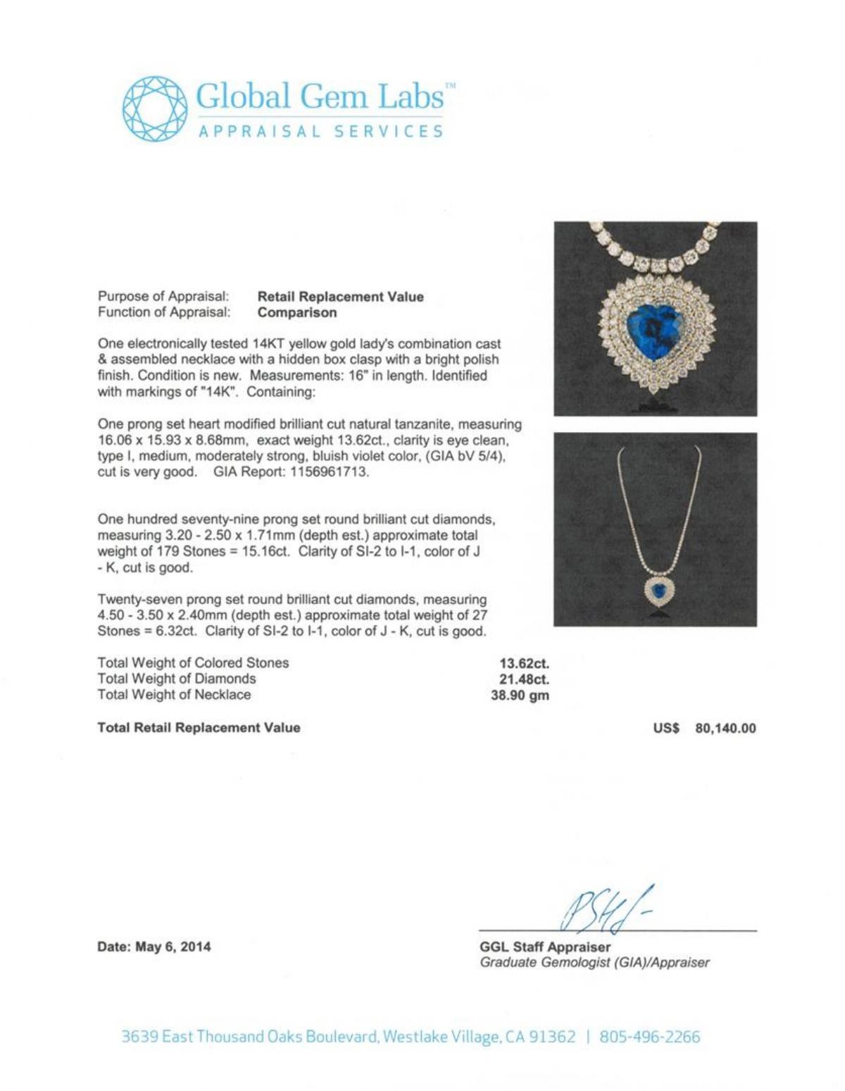 One electronically tested 14KT yellow gold Ladies combination cast & assembled necklace with a hidden box clasp with a bright polish finish. Condition is new. Measurements: 16" in length. Identified with markings of "14K". Containing: One prong set heart modified brilliant cut natural tanzanite, measuring 16.06 x 15.93 x 8.68mm, exact weight 13.62ct., clarity is eye clean, type I, medium, moderately strong, bluish violet color, (GIA bV 5/4), cut is very good. GIA Report: 1156961713. One Hundred Seventy-Nine prong set round brilliant cut diamonds, measuring 3.20 - 2.50 x 1.71mm (depth est.) approximate. Total Weight of 179 Stones = 15.16ct. Clarity: SI-2 to I-1. Color: J - K, Cut is Good. Twenty-Seven prong set round brilliant cut diamonds, measuring 4.50 - 3.50 x 2.40mm (depth est.) approximate. Total Weight of 27 Stones = 6.32ct. Clarity: SI-2 to I-1. Color: J - K, Cut is Good. Total Weight of Colored Stones 13.62ct. Total Weight of Diamonds 21.48ct. Total Weight of Necklace 38.90 grams. GGL Appraised.