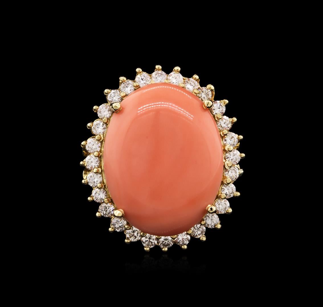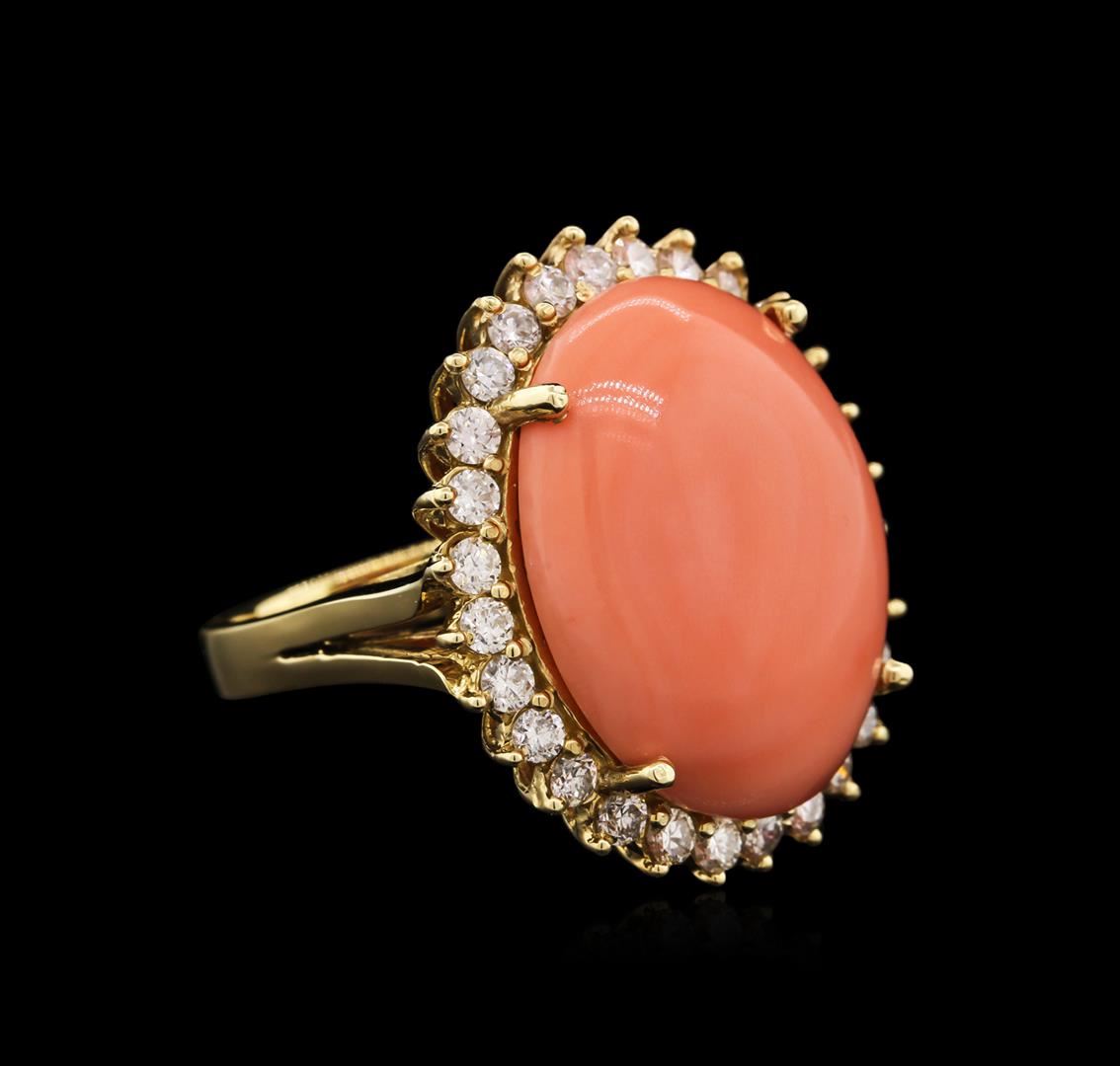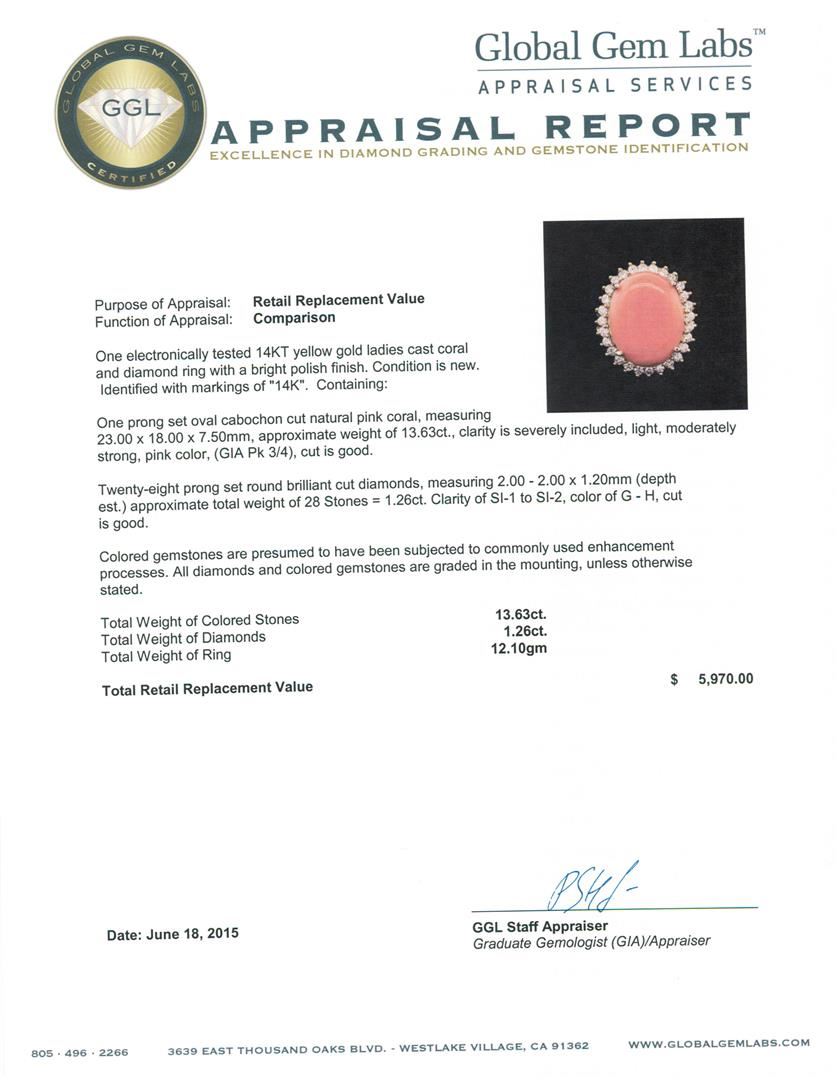 One electronically tested 14KT yellow gold ladies cast coral and diamond ring with a bright polish finish. Identified with markings of "14K". Condition is new. Containing: One prong set oval cabochon cut natural pink coral, measuring 23.00 x 18.00 x 7.50mm, approximate weight of 13.63ct., clarity is severely included, light, moderately strong, pink color, (GIA Pk 3/4), cut is good. Twenty-Eight prong set round brilliant cut diamonds, measuring 2.00 - 2.00 x 1.20mm (depth est.) approximate total weight of 28 Stones = 1.26ct. Clarity: SI-1 to SI-2. Color: G - H, Cut is Good. Colored gemstones are presumed to have been subjected to commonly used enhancement processes. All diamonds and colored gemstones are graded in the mounting, unless otherwise stated. Total Weight of Colored Stones 13.63ct. Total Weight of Diamonds 1.26ct. Total Weight of Ring 12.10 grams. GGL Appraised at $5,970.00.
