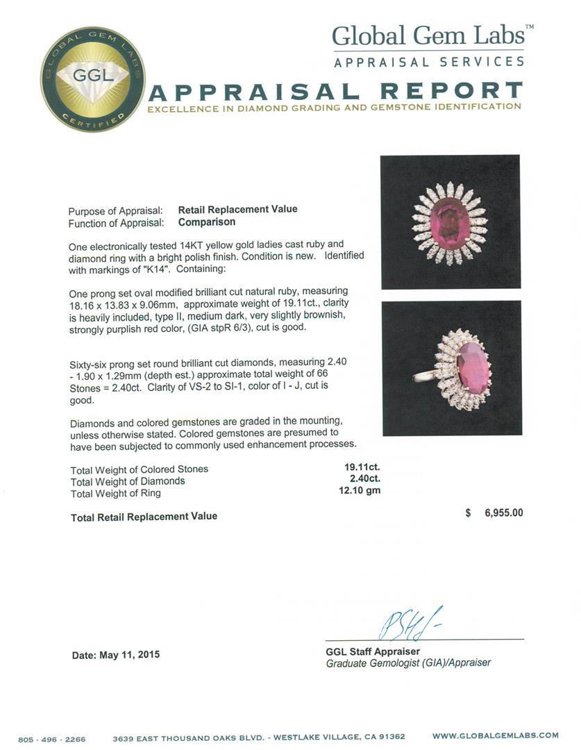One electronically tested 14KT yellow gold ladies cast ruby and diamond ring with a bright polish finish. Identified with markings of "K14". Condition is new. Containing: One prong set oval modified brilliant cut natural ruby, measuring 18.16 x 13.83 x 9.06mm, approximate weight of 19.11ct., clarity is heavily included, type II, medium dark, very slightly brownish, strongly purplish red color, (GIA stpR 6/3), cut is good. Sixty-Six prong set round brilliant cut diamonds, measuring 2.40 - 1.90 x 1.29mm (depth est.) approximate total weight of 66 Stones = 2.40ct. Clarity: VS-2 to SI-1. Color: I - J, Cut is Good. Diamonds and colored gemstones are graded in the mounting, unless otherwise stated. Colored gemstones are presumed to have been subjected to commonly used enhancement processes. Total Weight of Colored Stones 19.11ct. Total Weight of Diamonds 2.40ct. Total Weight of Ring 12.10 grams. GGL Appraised.