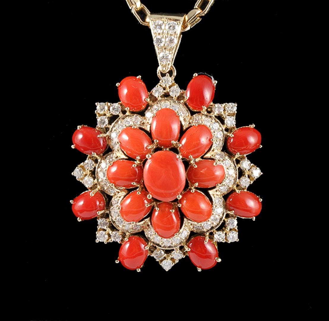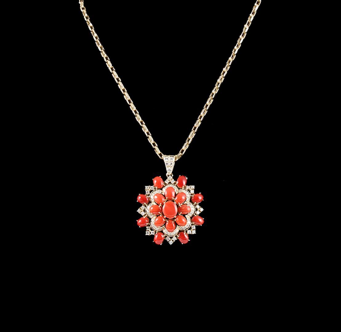One electronically tested 14KT yellow gold ladies cast & assembled coral and diamond pendant with chain. Condition is new, good workmanship. The pendant features a stylized coral and diamond floret, completed by a diamond set bail. The pendant is supported by an eighteen inch length 14KT yellow gold designer style chain, terminating in a lobster claw clasp. Bright polish finish. Identified with markings of "K14". Containing: Seventeen prong set oval cabochon cut natural red corals approximate total weight of 19.87ct., clarity is severely included, medium dark, very slightly brownish, orangy red color, (GIA oR 6/3), cut is good. Transmitting light very diffusely, opaque, Naturally occurring internal & external characteristics are present. Color grade is an average for the group. Graded in the setting. Red Coral (Corallium Japonicum) is formed undersea by microscopic animals called coral polyps. These tiny, creatures form minute, hard shells. As a colony grows, it takes on complex branching, tree-like forms which allows the maximum number of polyps to be fed by the nutrients in the water. It grows about one quarter inch per year. This color of coral is commonly treated to improve or change the color and stability. Evidence that may confirm this is typically lacking. Sixty-nine bead and prong set round brilliant cut diamonds, measuring 2.50 - 2.20 x 1.41mm (depth est.) approximate total weight of 69 Stones = 3.06ct. Graded in the setting. Clarity SI-1 to I-1. Color G -- I. Total Weight of Colored Stones 19.87ct. Total Weight of Diamonds 3.06et. Total Weight of Pendant With Chain 31.93gm. AIG Appraised at $20,440.00.